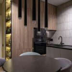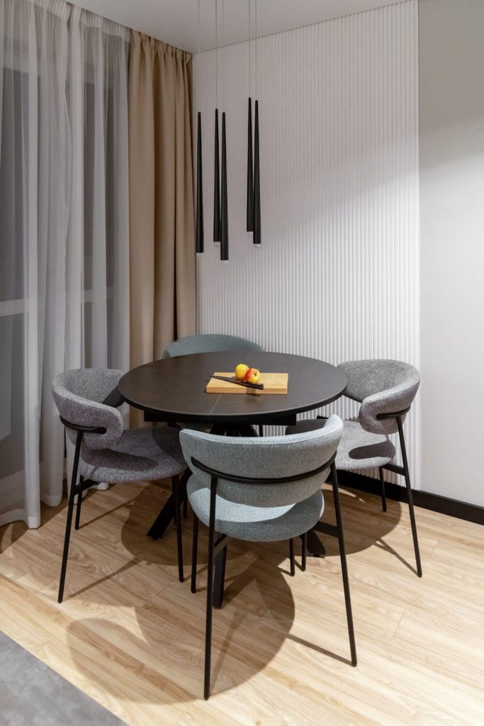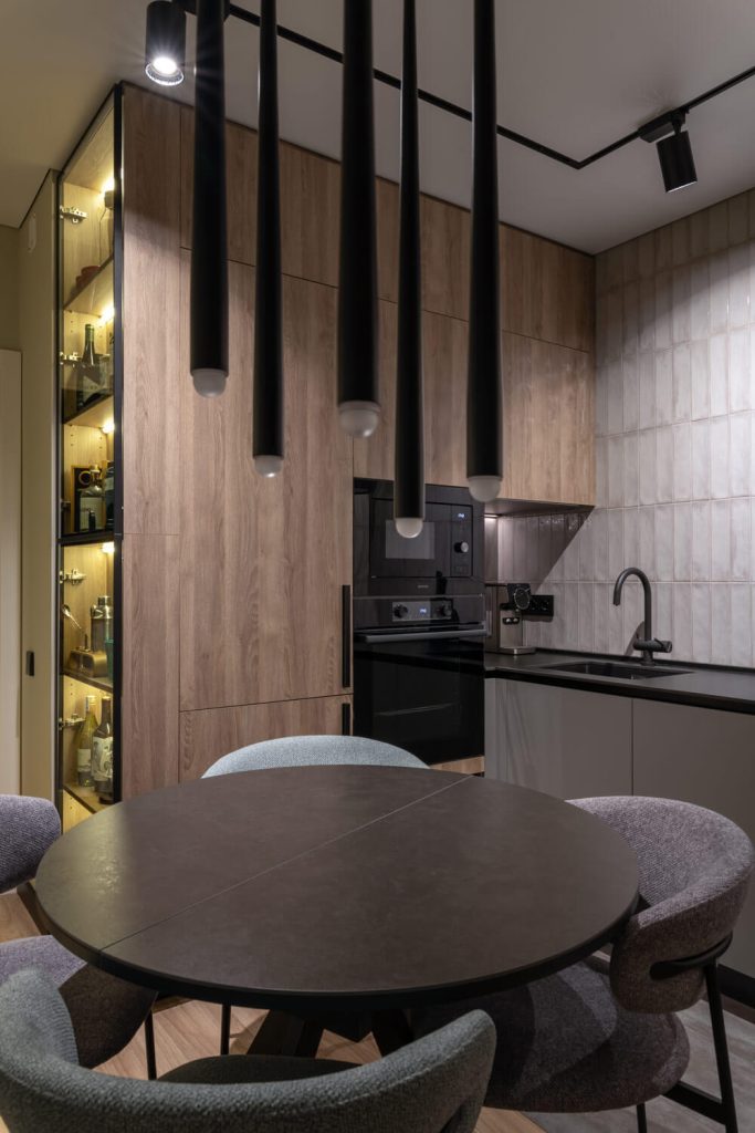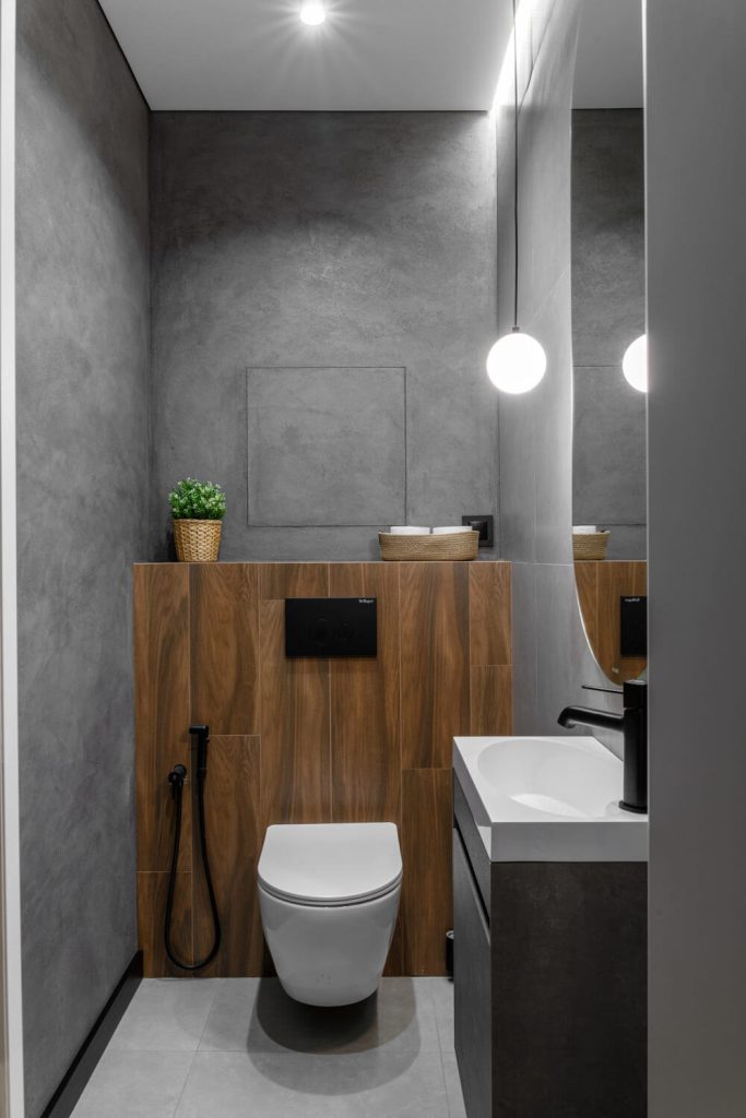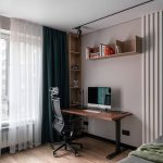 Цветовая палитра на грани холодных оттенков с добавлением теплых природных вкраплений, бетонные фактуры и текстуры, рейки для оживления интерьера и черные плинтуса для графичности, чтобы подчеркнуть характер и творческое направление Заказчика.