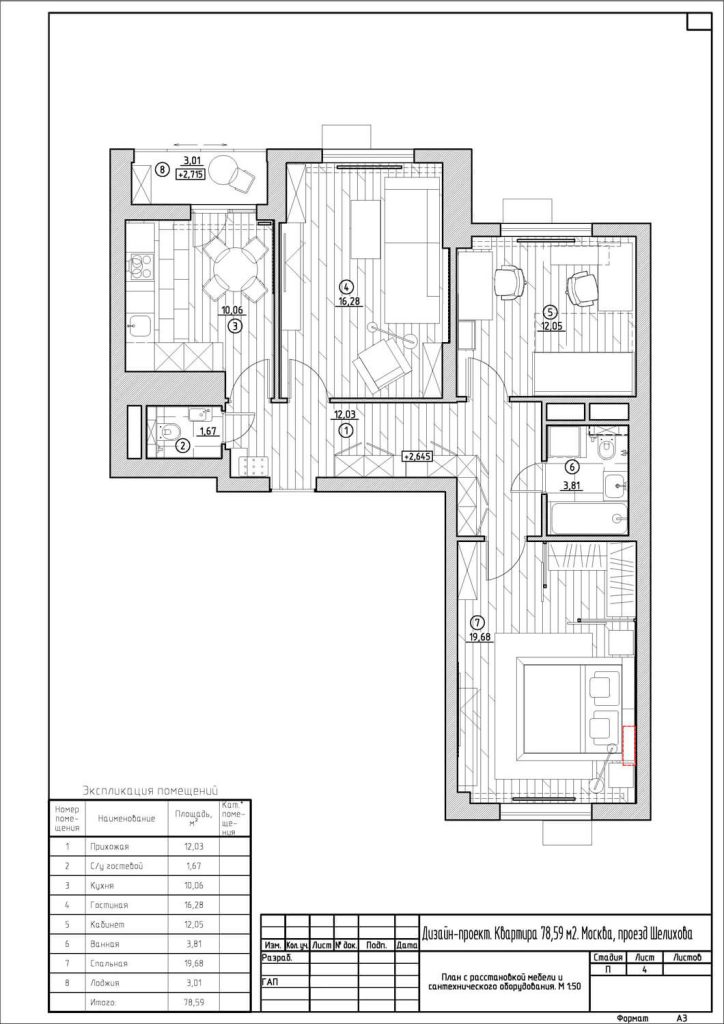 Проект трехкомнатной квартиры с мужским акцентом и рыжим котом. 78 м².