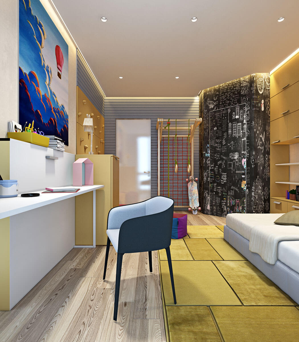 На втором этаже устроены две детские, санузел и гостевая-кабинет. В комнате для мальчика стены гардеробной, декорированные грифельной краской, служат холстом для творчества малыша. Здесь нашлось место и для спортивного уголка со шведской стенкой и мини-скалодромом. Кабинет отличают строгое цветовое решение и сочетание глянцевых и матовых фактур.