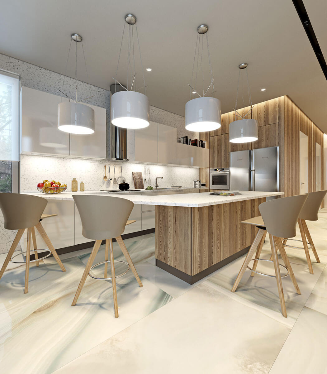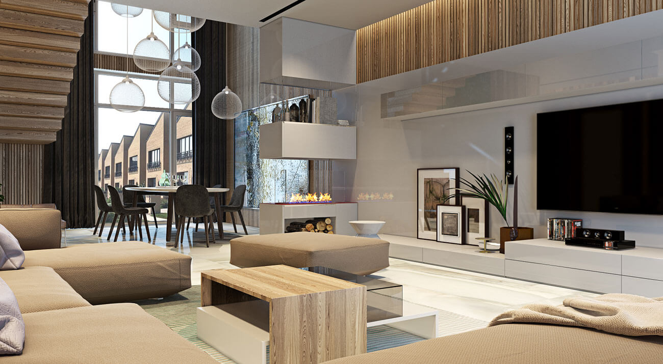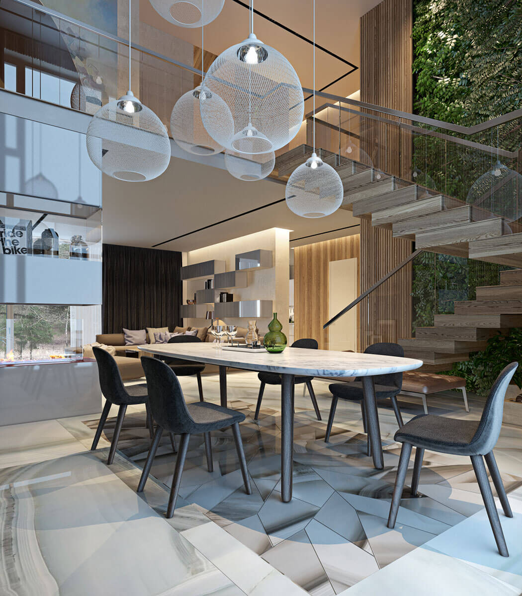 Планировочное решение первого этажа построено по принципу общего пространства — между холлом, гостиной и кухней нет дверей. За счет использования шпонированных панелей в облицовке общественная часть кажется единой. В декоре стен в зоне отдыха использованы деревянные рейки, декоративная штукатурка и фитопанели. На полу светлый широкоформатный керамогранит с минимально выраженной фактурой. Немаловажную роль в создании интерьера играет композиция с биокамином и мебельным комплектомс телевизором. Ансамбль подвесных ламп, висящих на разных уровнях, украшает двусветное пространство над обеденной группой.