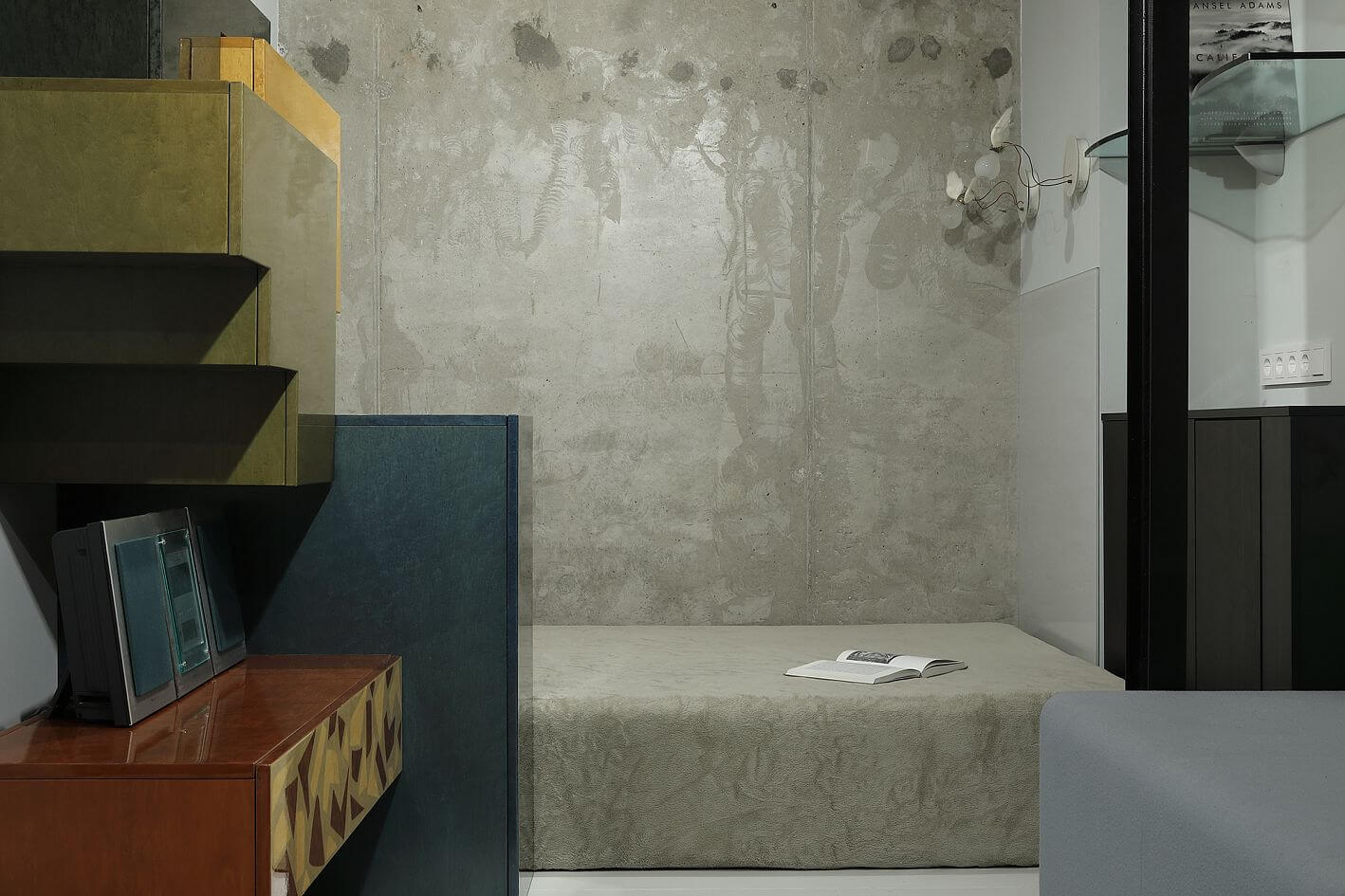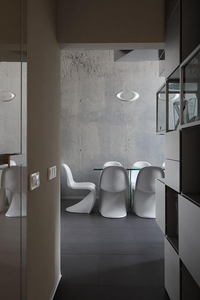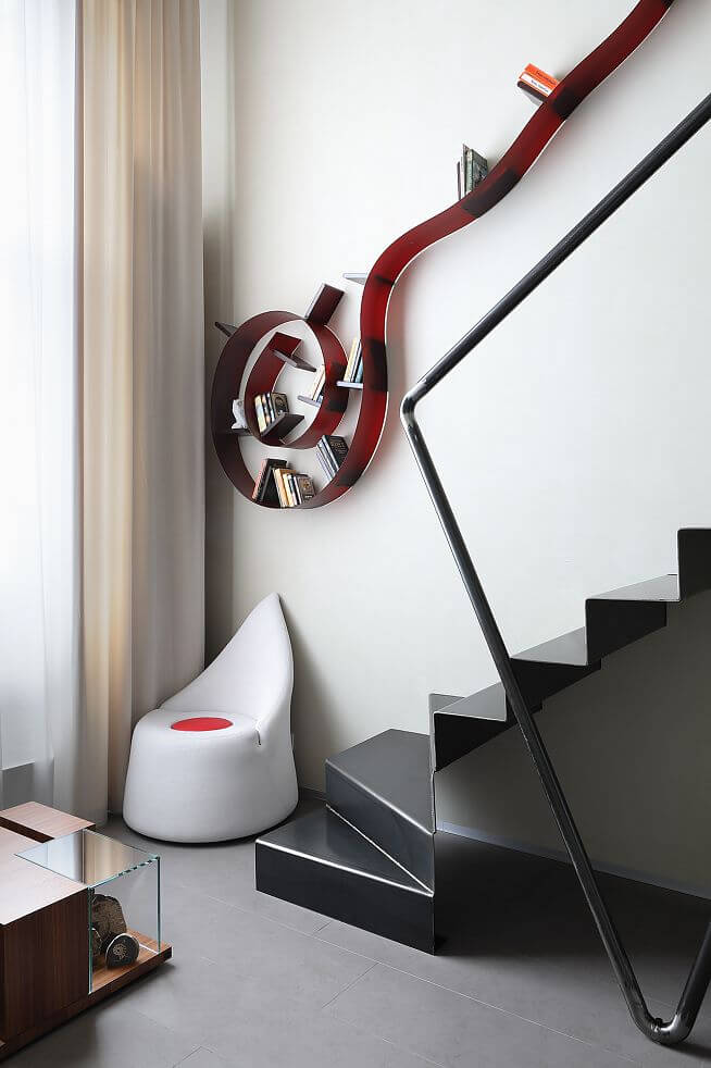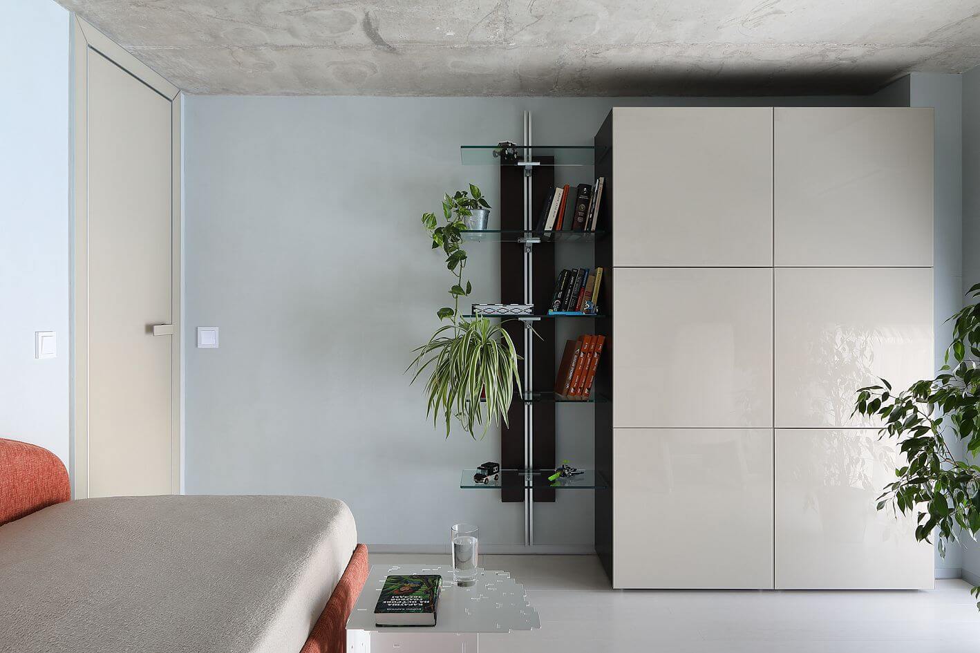 Из коридора в гостиную поворачивает стеллаж Lago. В нем хранятся всякие кухонные приборы, книги, коллекция камней и прочие приятные вещи.