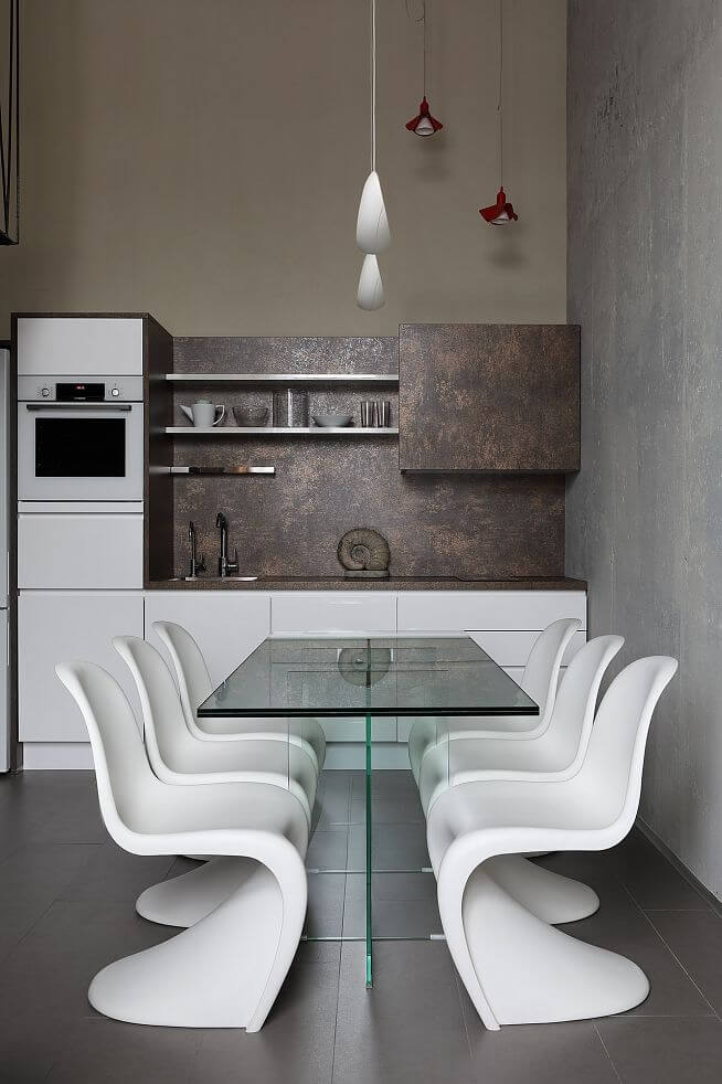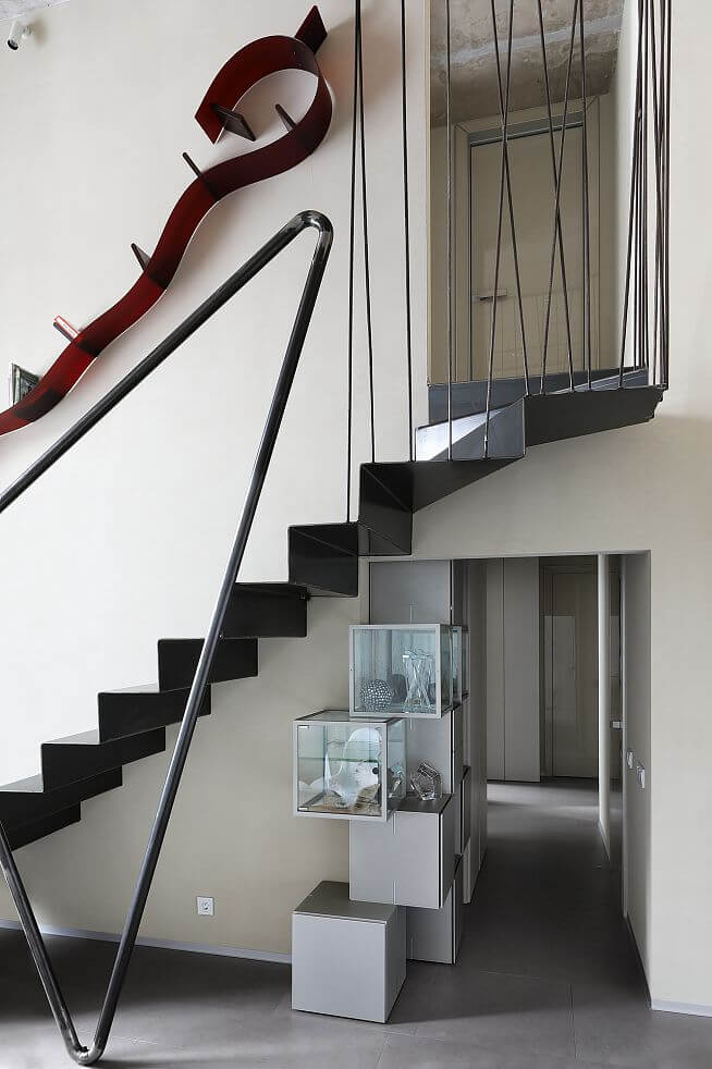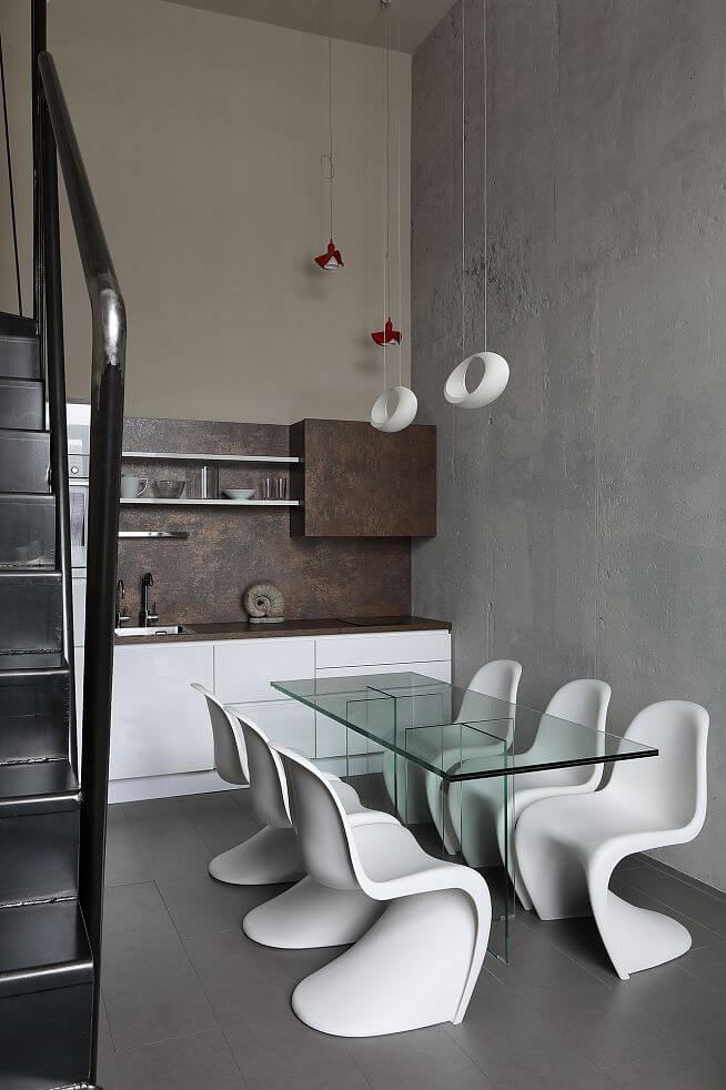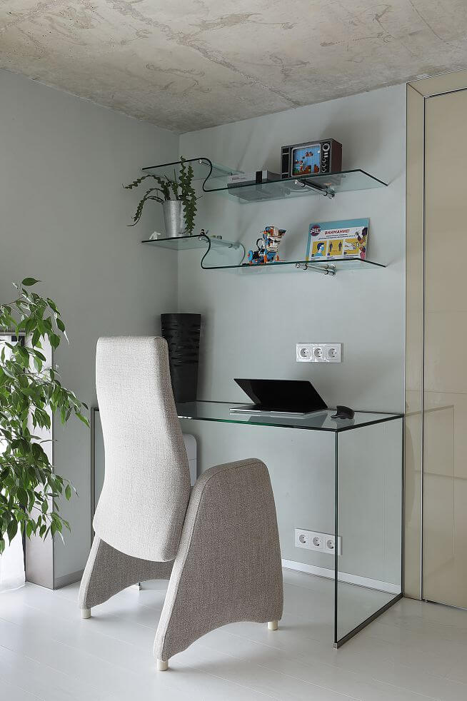 В кухне-гостиной сохранили исходную высоту и спроектировали легкую металлическую лестницу. Стеклянный обеденный стол, а также рабочие столы в двух детских изготовлены по нашим эскизам. Благодаря прозрачности практически невидимы.