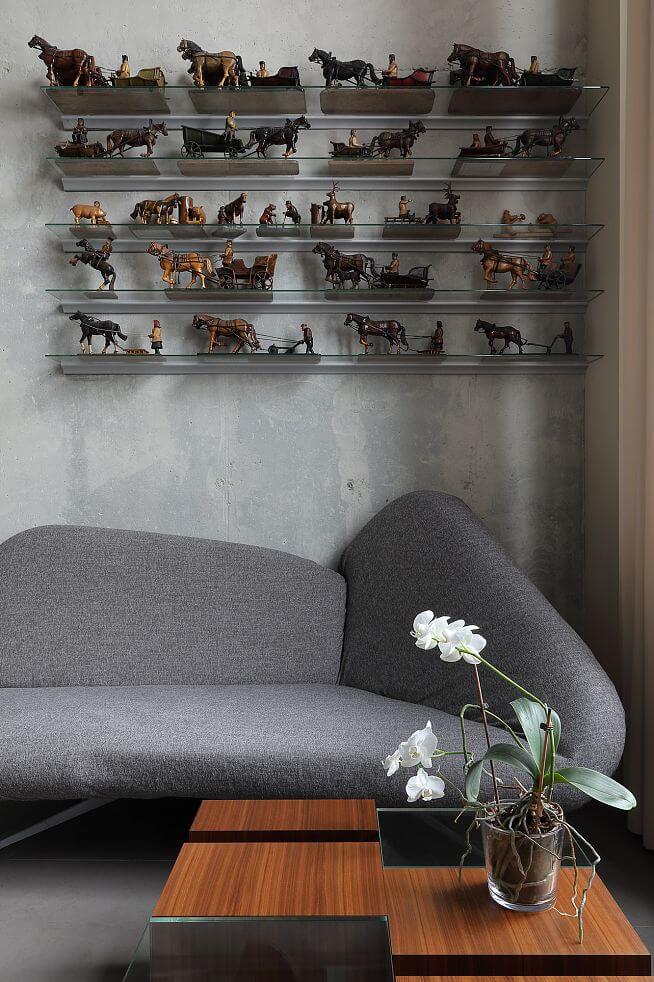 Над диваном — коллекция деревянной скульптуры авторства дедушки хозяина квартиры.