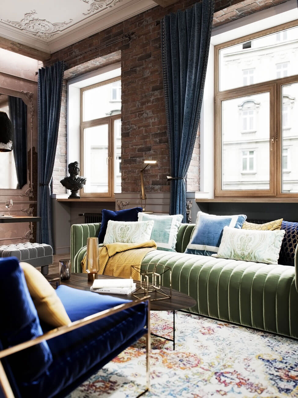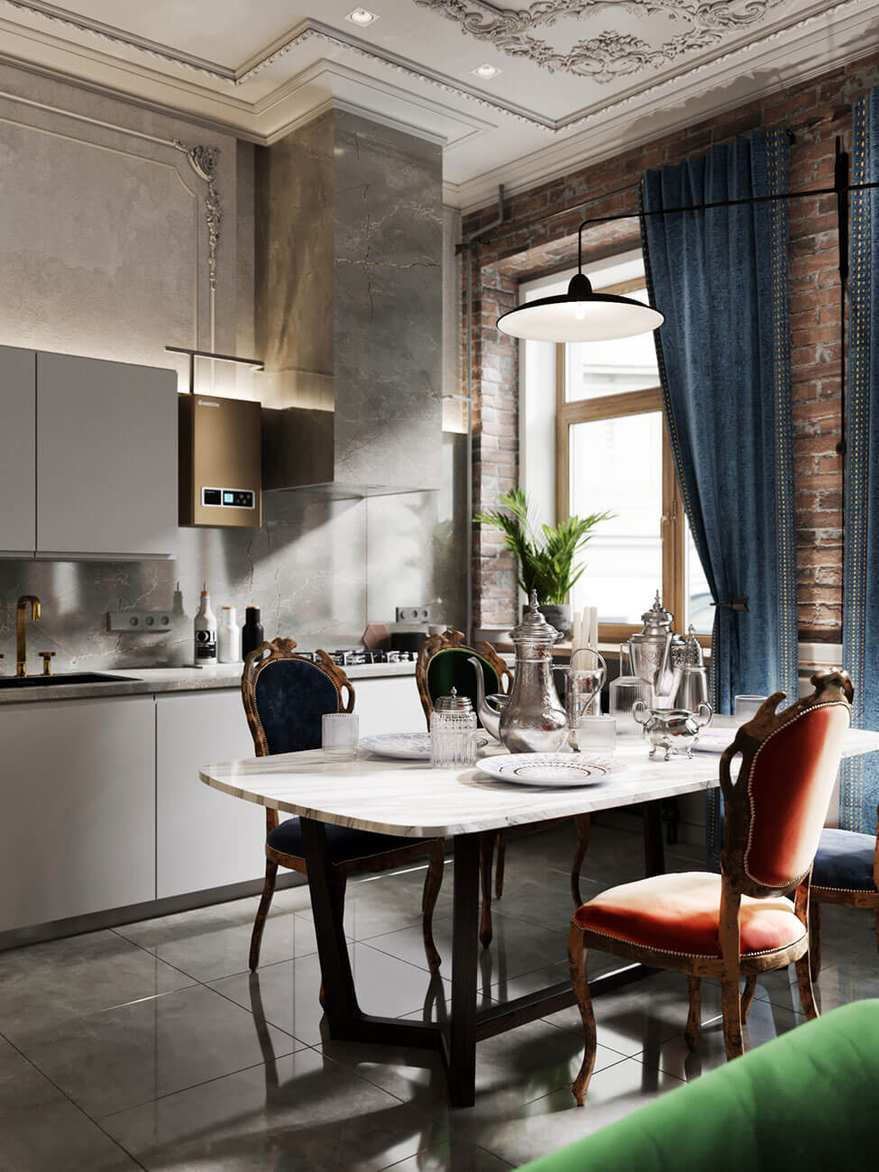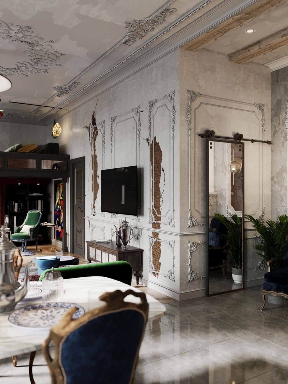 Концепция квартиры в историческом центре Санкт-Петербурга навеяна мотивами дворцов и усадеб XVII–XVIII веков. Появилось желание создать пространство, содержащее в себе дворцовую историю и современный быт. Сохраненная историческая лепнина не подверглась реставрации, а была законсервирована в облике, дошедшем до наших дней. Балки перекрытия очищены от многочисленных слоев масляной краски, на них проявились текстура и красота древесины.