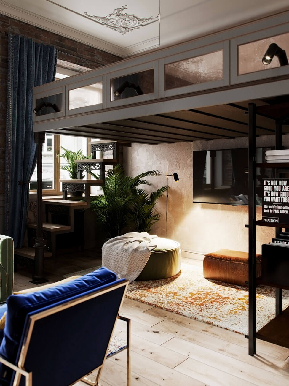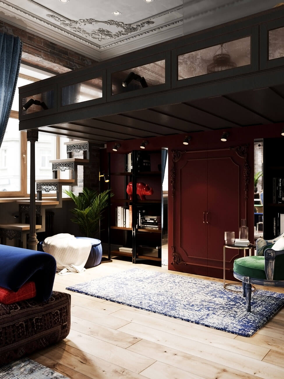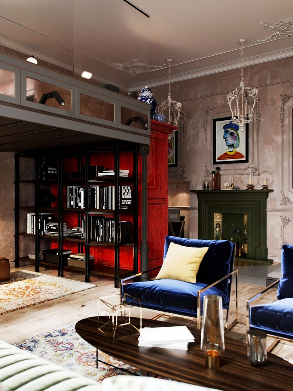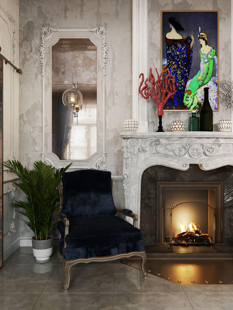 Концепция квартиры в историческом центре Санкт-Петербурга навеяна мотивами дворцов и усадеб XVII–XVIII веков. Появилось желание создать пространство, содержащее в себе дворцовую историю и современный быт. Сохраненная историческая лепнина не подверглась реставрации, а была законсервирована в облике, дошедшем до наших дней. Балки перекрытия очищены от многочисленных слоев масляной краски, на них проявились текстура и красота древесины.
