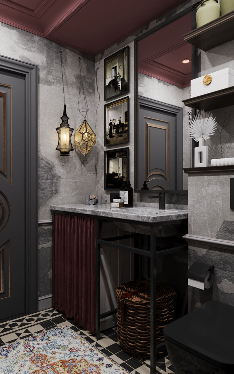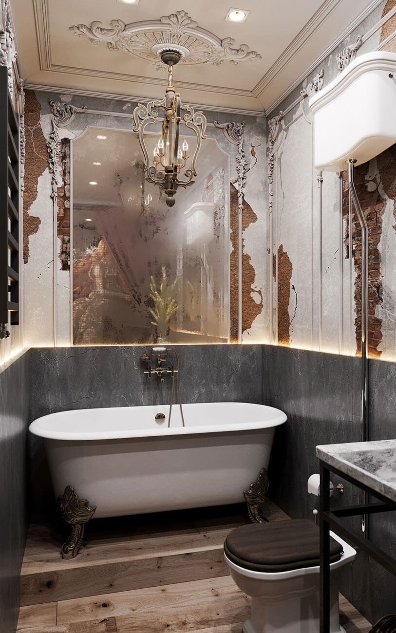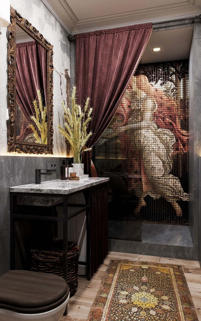В отделочных материалах санузлов использованы состаренные зеркала, придающие историчность, мозаика с использованием фрагмента картины Сандро Боттичелли «Рождение Венеры».