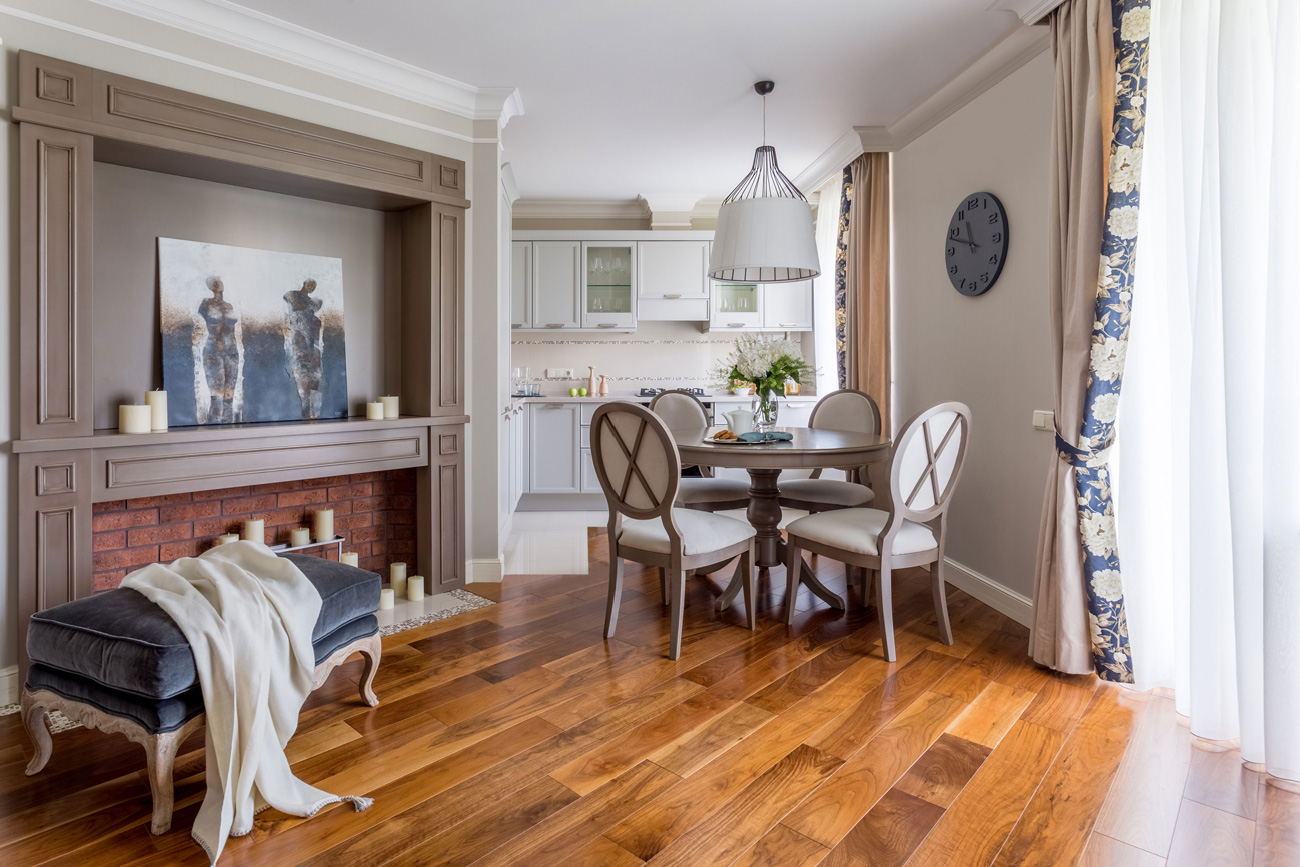 Чтобы создать ощущение теплоты, решили использовать в качестве отделки пола американский орех необычного цвета. Фальшкамин со сложенными стопками книг и свечами хоть и не выполняет своей прямой функции, тем не менее безупречно вжился в интерьер и формирует ТВ-зону.