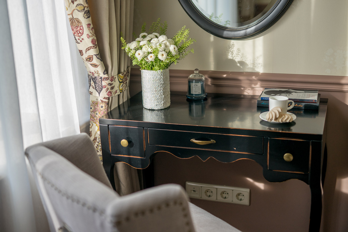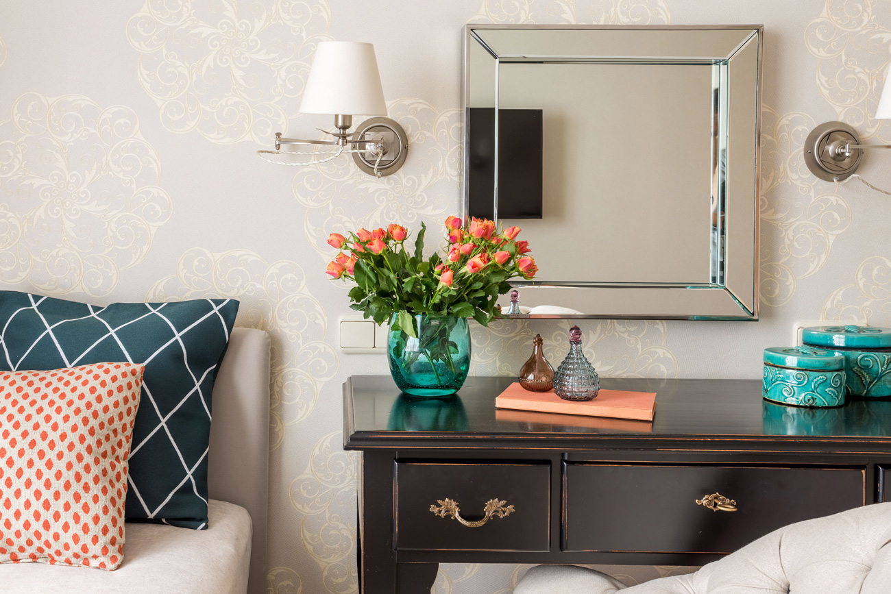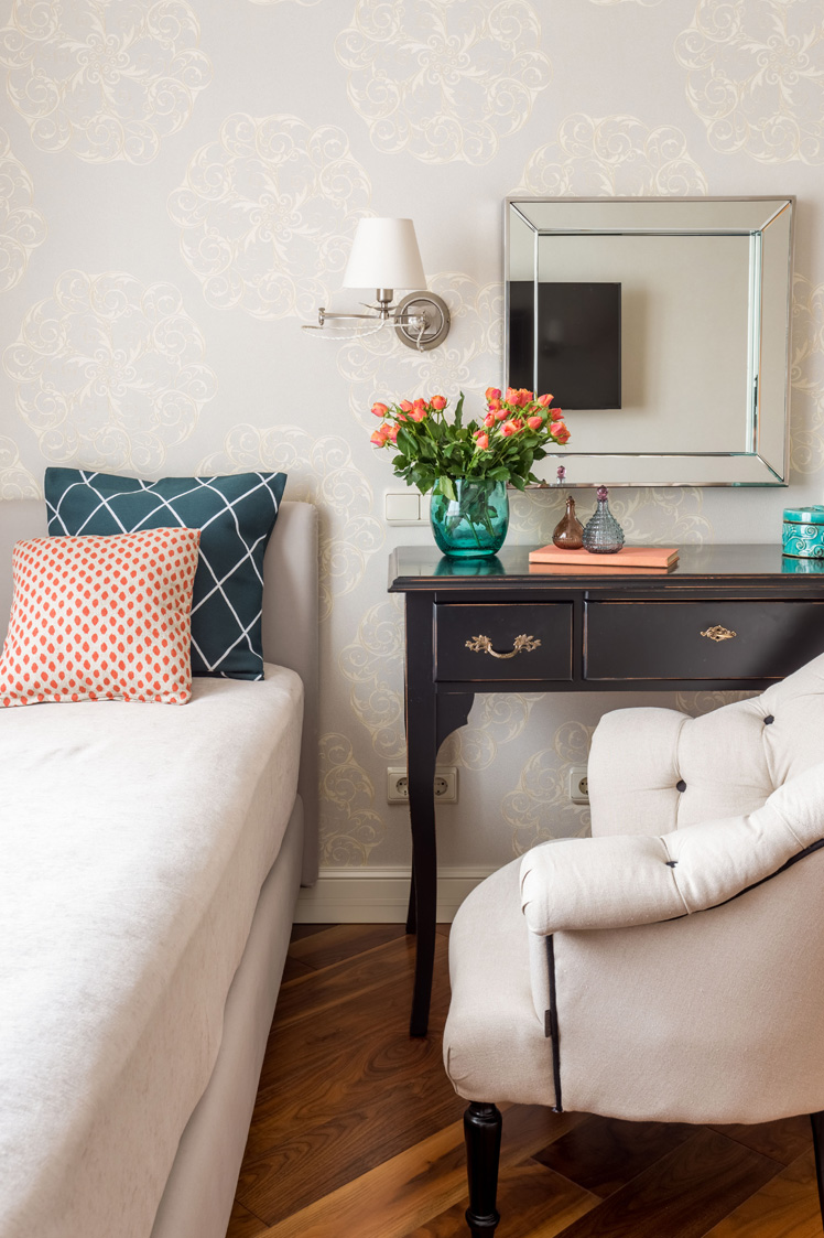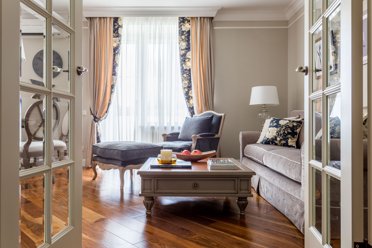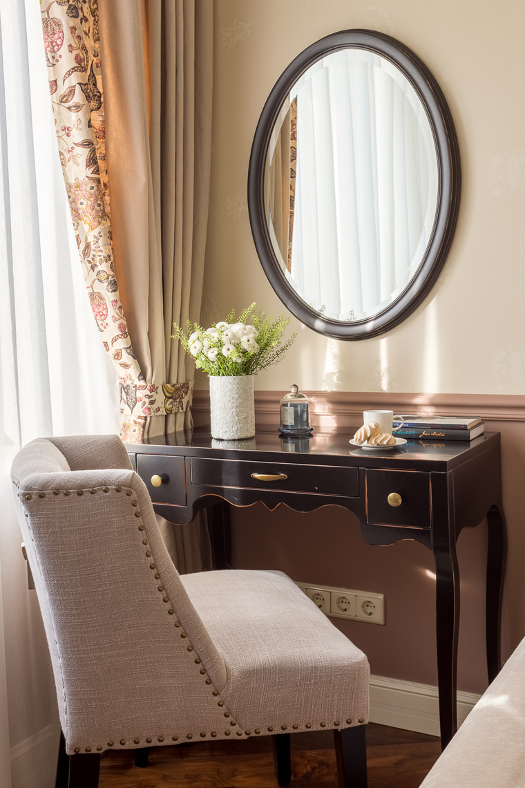 Вся квартира выдержана в едином стиле — легкой и нежной классике. Пожалуй, единственное, что сразу бросается в глаза, это яркий комод цвета спелой клубники при входе, который интригует и побуждает проследовать далее.