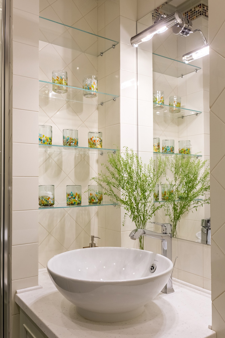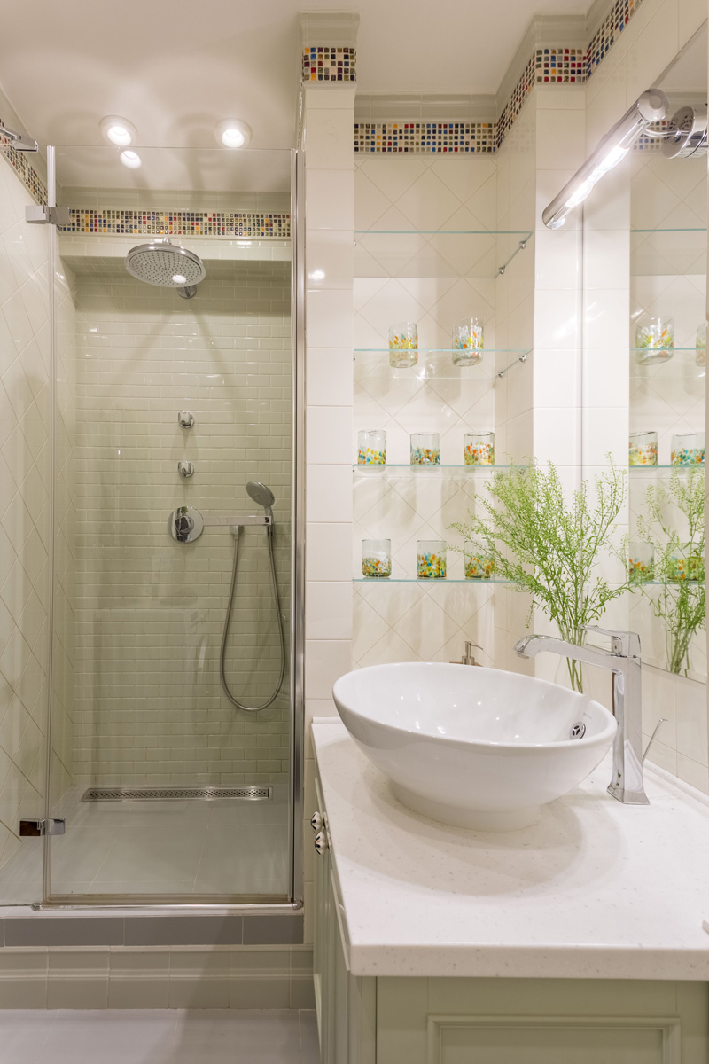 Основой санузла послужила роскошная мозаика из травертина, которая с первого взгляда поразила авторов проекта цветной глазурью и качеством исполнения. Они подобрали к ней более спокойную фоновую плитку, а мозаику пустили по всему периметру потолка яркой полосой. Получилось невероятно красиво и стилистически интересно. Ванну заменили душем.