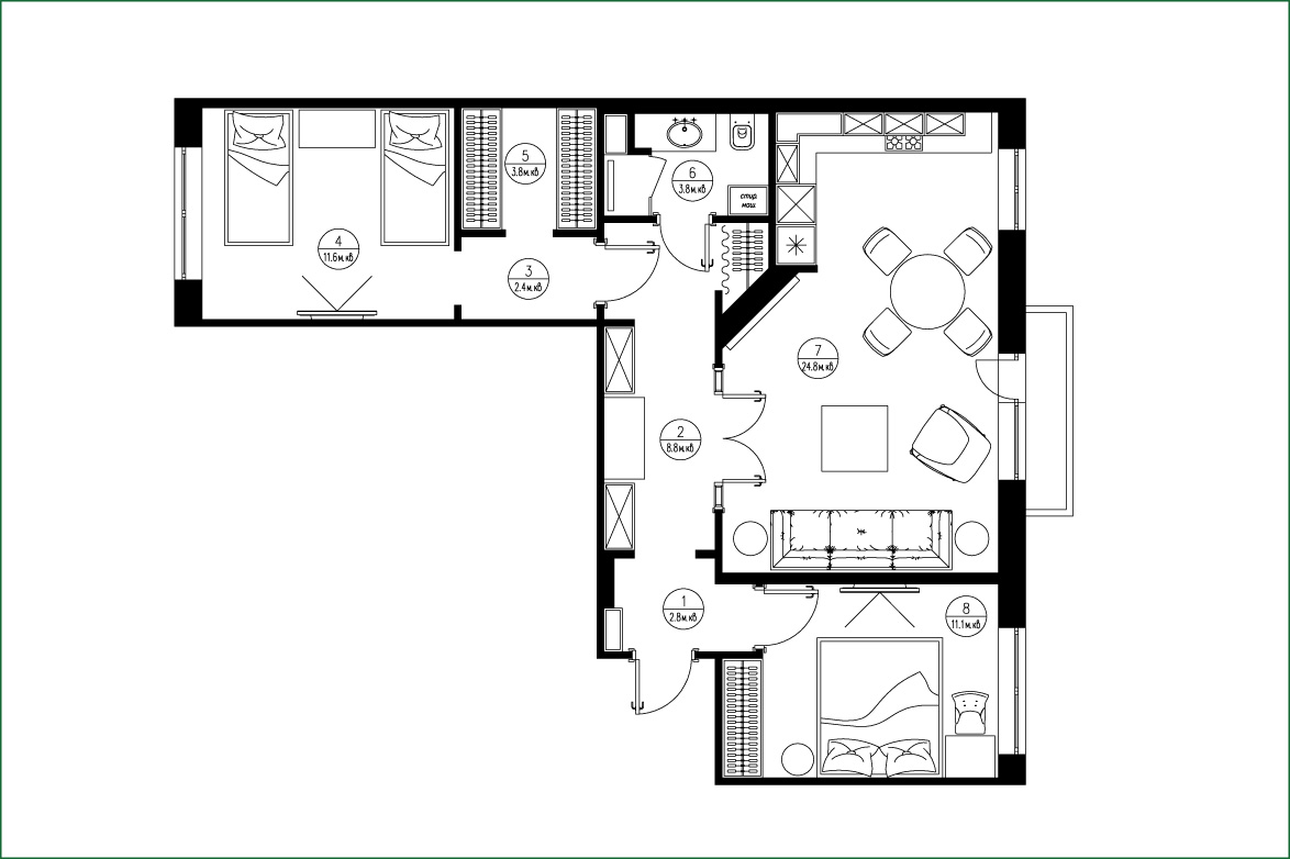 Авторы проекта внесли некоторые изменения в планировку, предложили объединить санузлы и сделать просторную ванную комнату, а также снести стену между кухней и гостиной, тем самым организовав небольшую кладовую. Требовалось также предусмотреть много шкафов, гардеробных и прочих мест для хранения. Скорректированный проект был безоговорочно принят с первого раза.