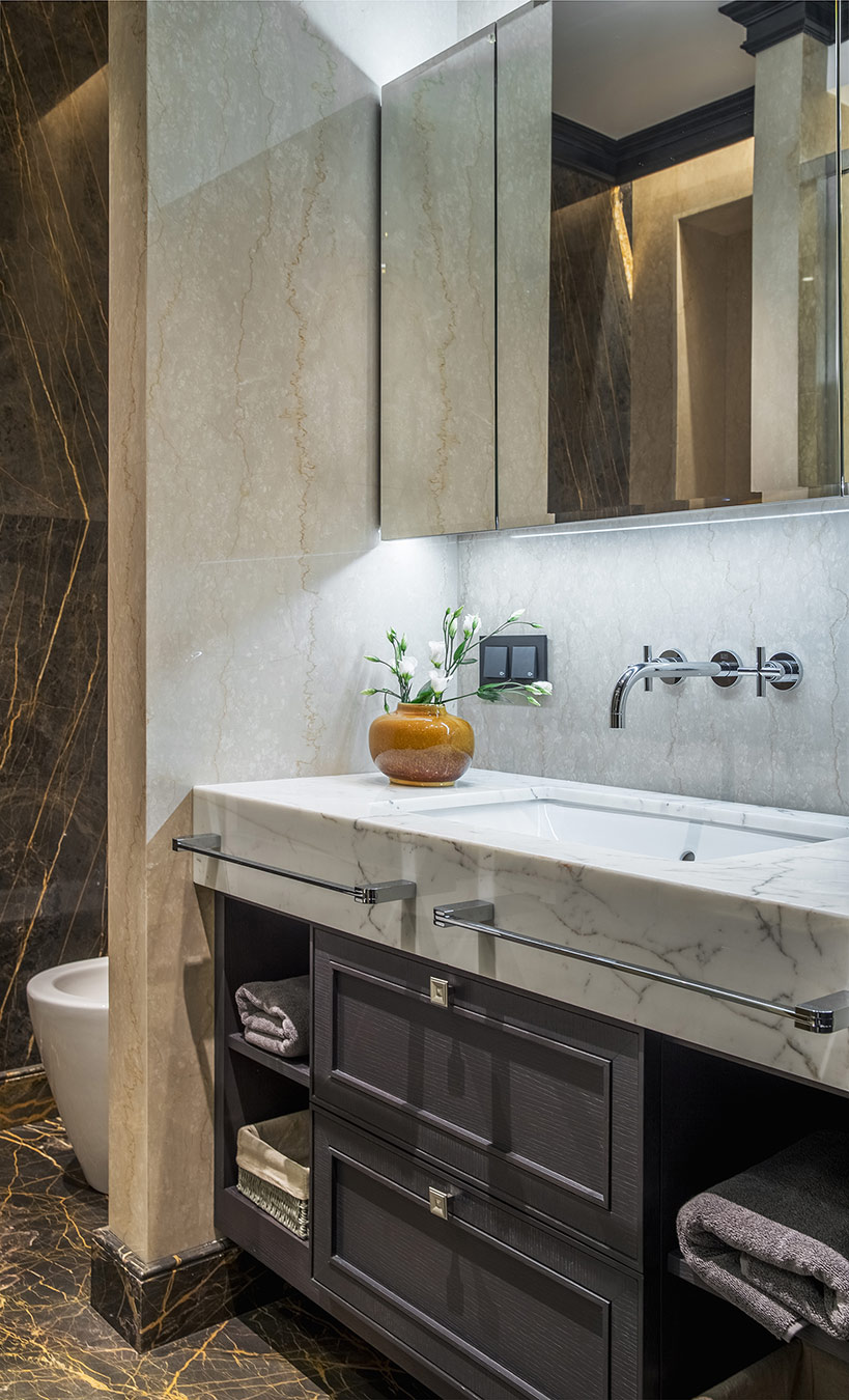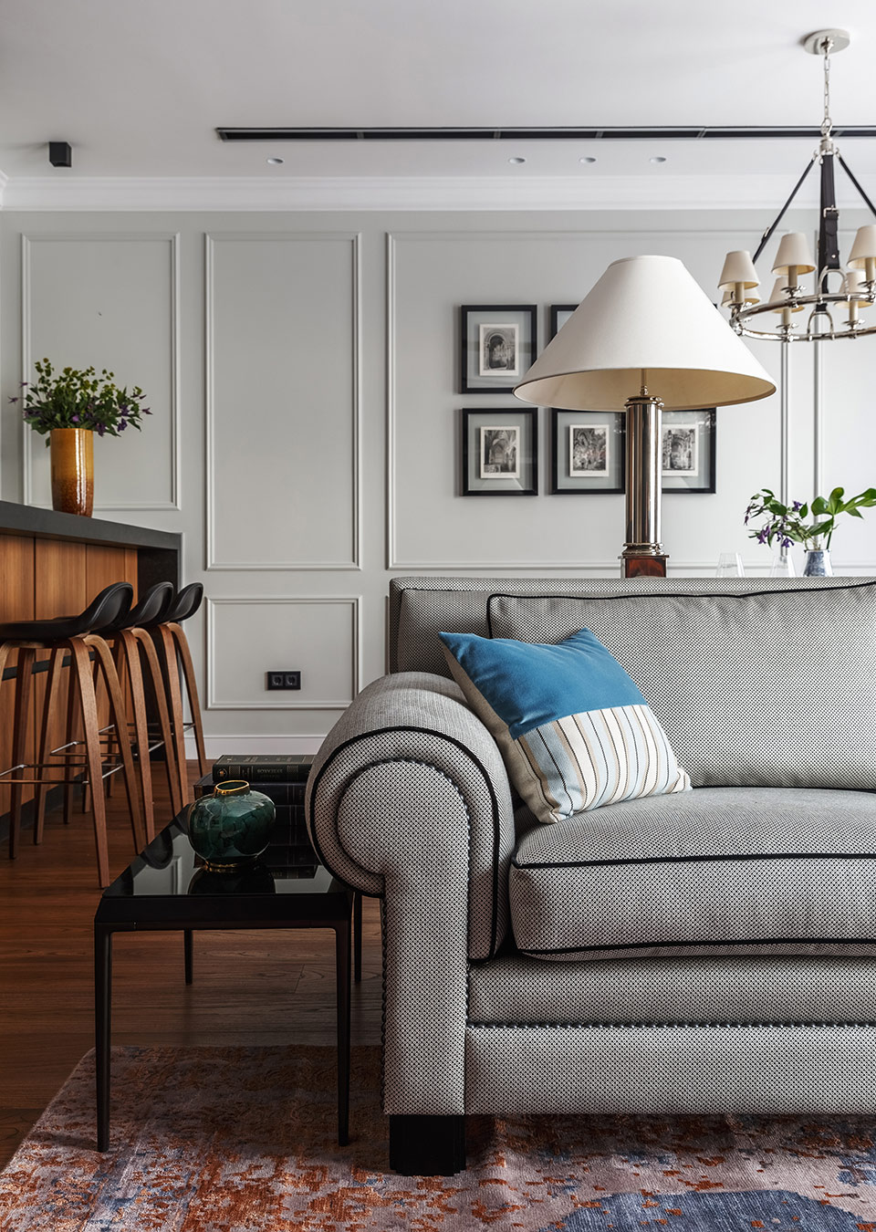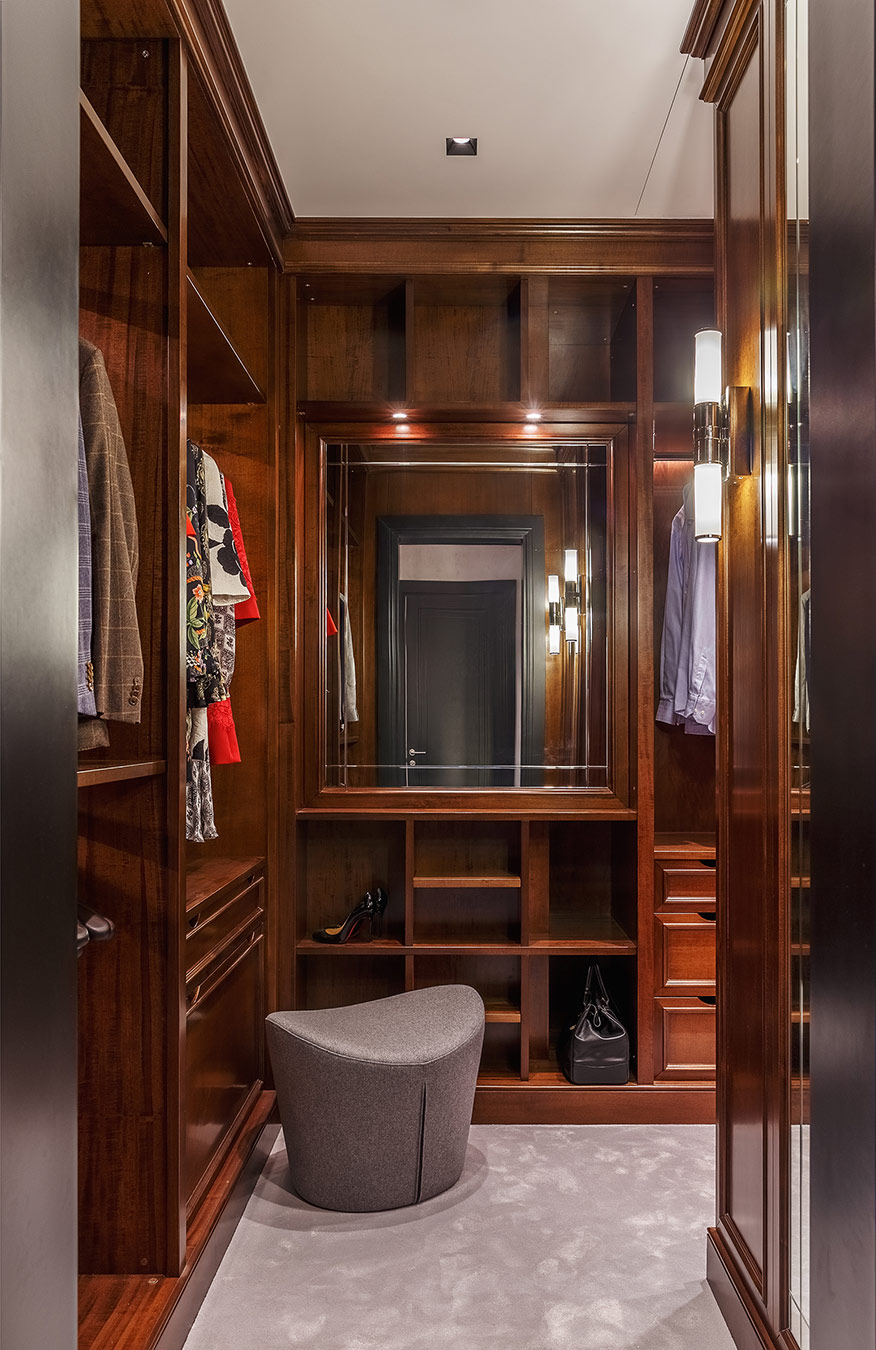 Хозяева квартиры обратились в студию с просьбой создать интерьер в современном стиле. Они долго не могли остановиться на определенном эскизе, пока заказчица не увидела интерьер из лукбука Ральфа Лорена, бренд которого она очень любит. Тогда архитектор предложил добавить в проект американской классики, и работы быстро перешли с этапа эскизов к реализации.