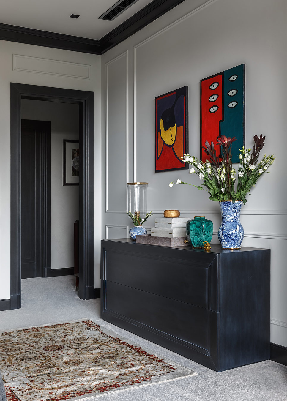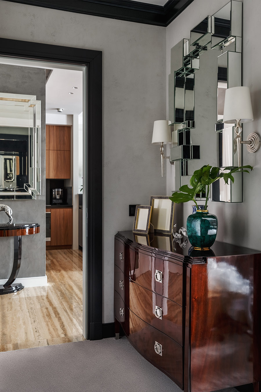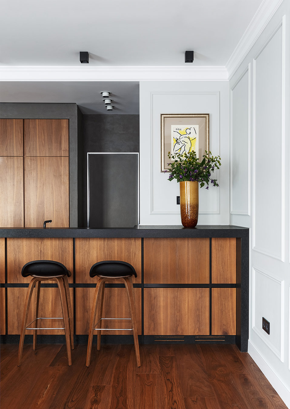 Хозяева квартиры обратились в студию с просьбой создать интерьер в современном стиле. Они долго не могли остановиться на определенном эскизе, пока заказчица не увидела интерьер из лукбука Ральфа Лорена, бренд которого она очень любит. Тогда архитектор предложил добавить в проект американской классики, и работы быстро перешли с этапа эскизов к реализации.