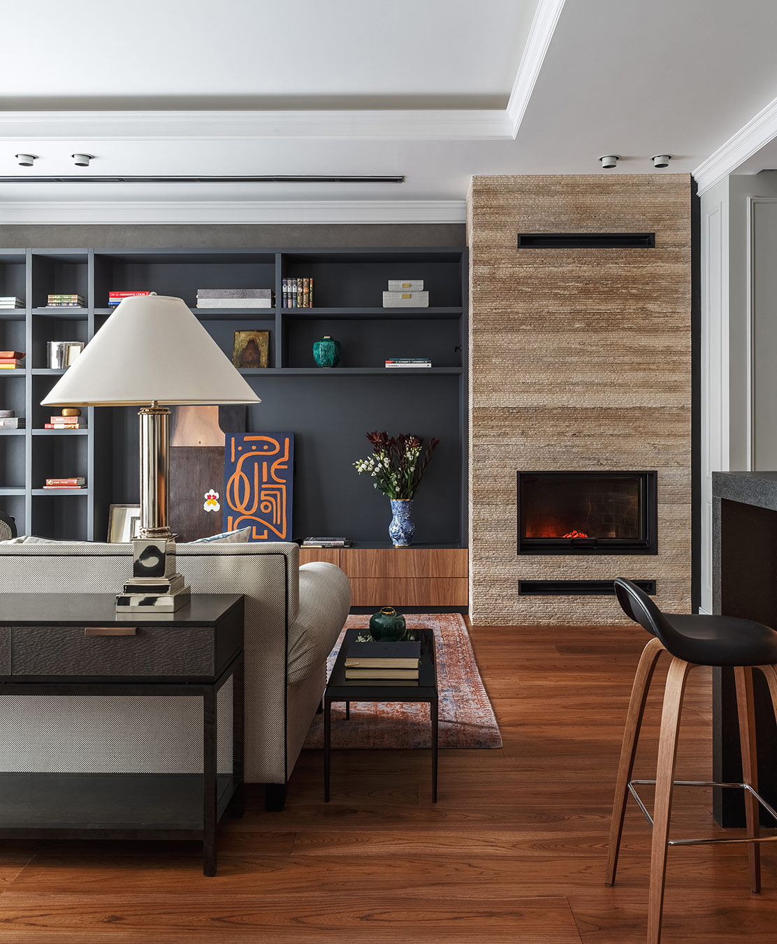 Заказчики живут в загородном доме, в Москве часто бывают по делам. Для городской жизни они выбрали квартиру в Хамовниках, где не так чувствуется бешеный ритм мегаполиса.