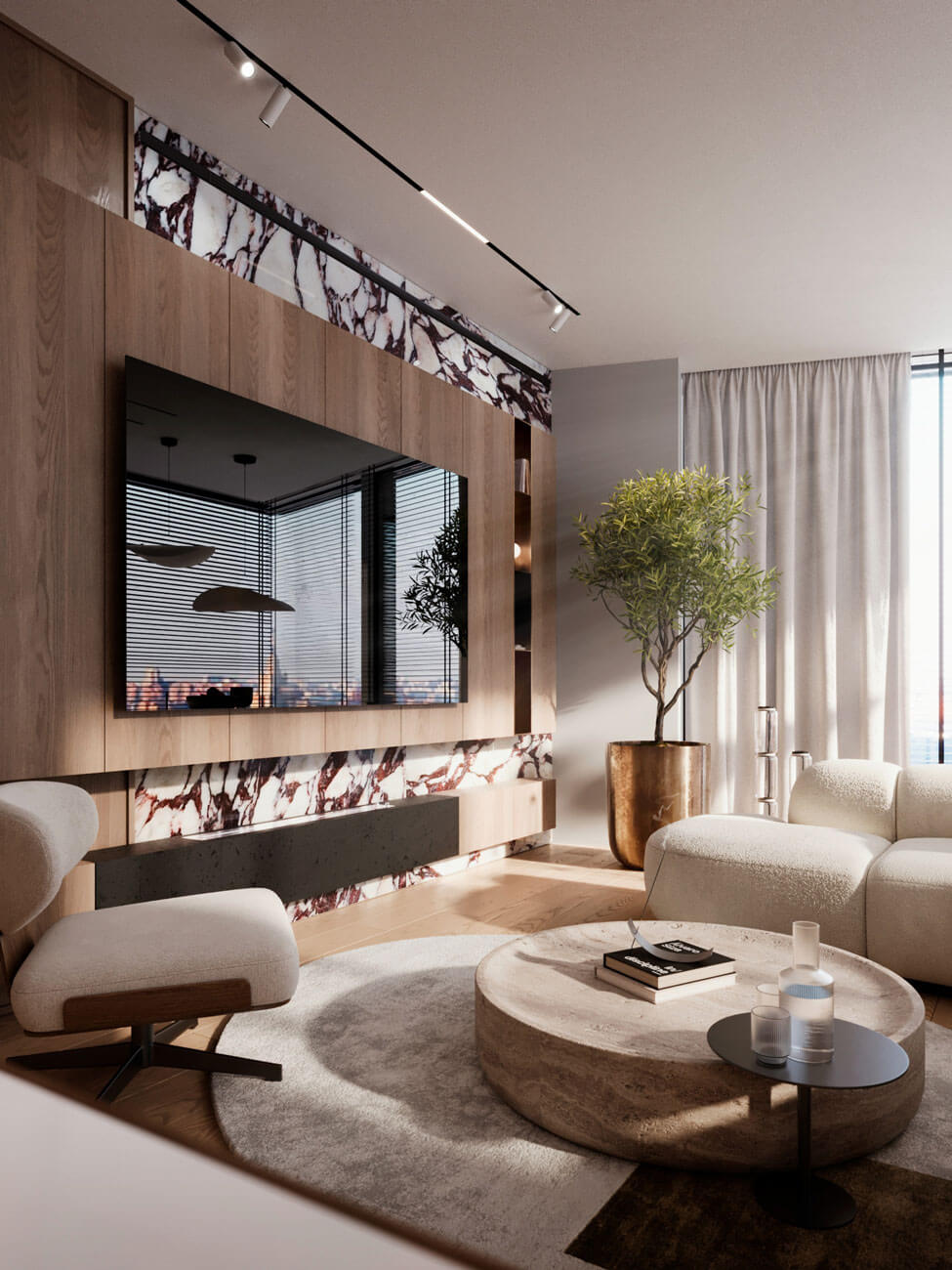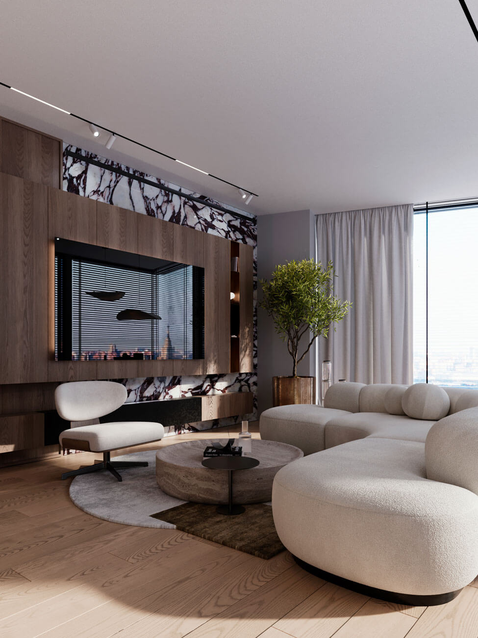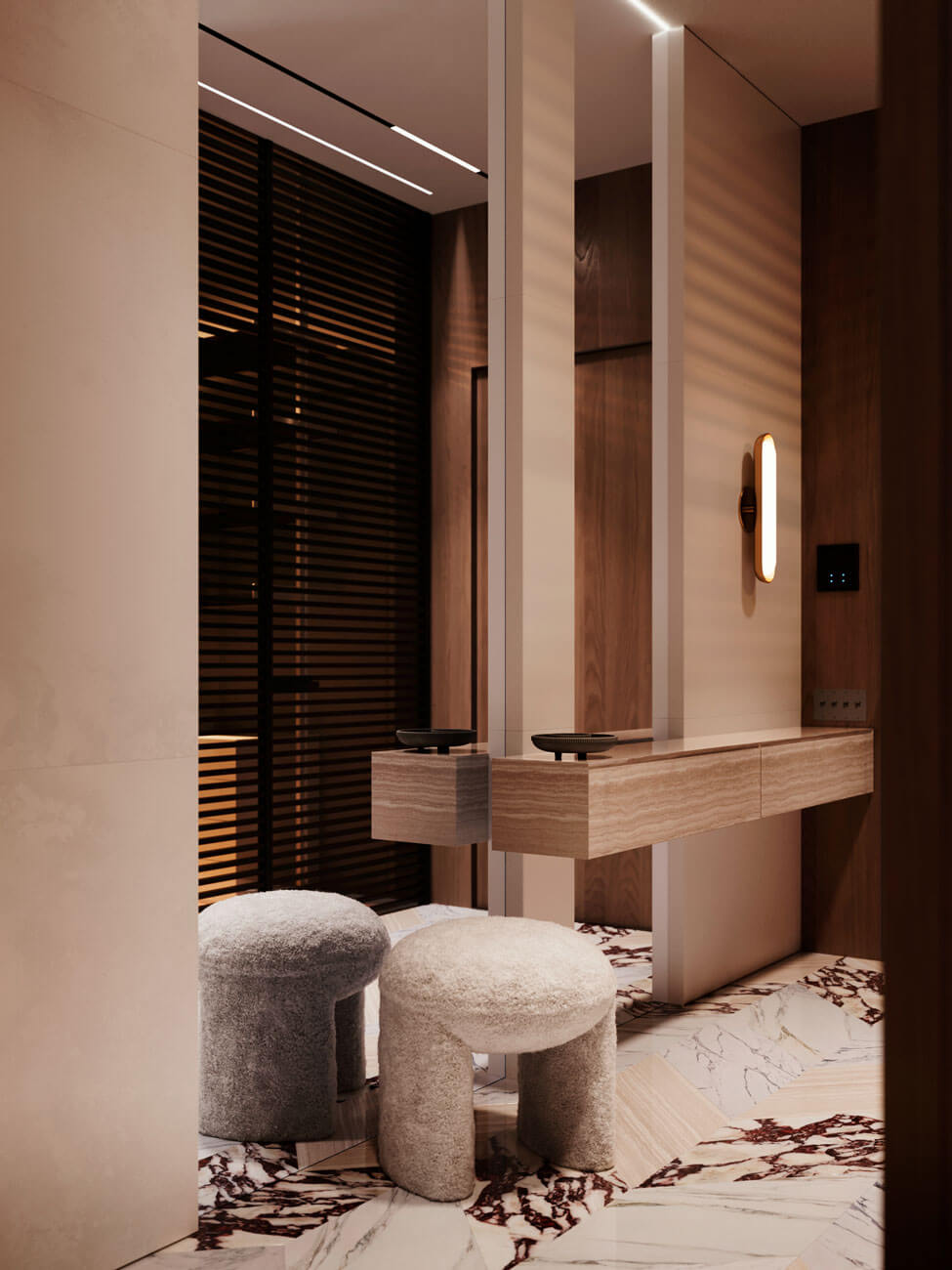 В этом проекте мы решили соединить разные стили, текстуры и материалы, при этом не слишком экспериментируя, чтобы лишать квартиру лаконичности. К примеру, стены прихожей отделаны под дерево, а пол — под мрамор. Мы также использовали скрытые шкафы, чтобы визуально облегчить пространство. Сочетание этих двух материалов можно проследить во всех комнатах — мрамор за телевизором в гостиной, деревянная панель за изголовьем кровати, мраморный фасад кухни, деревянная мебель.