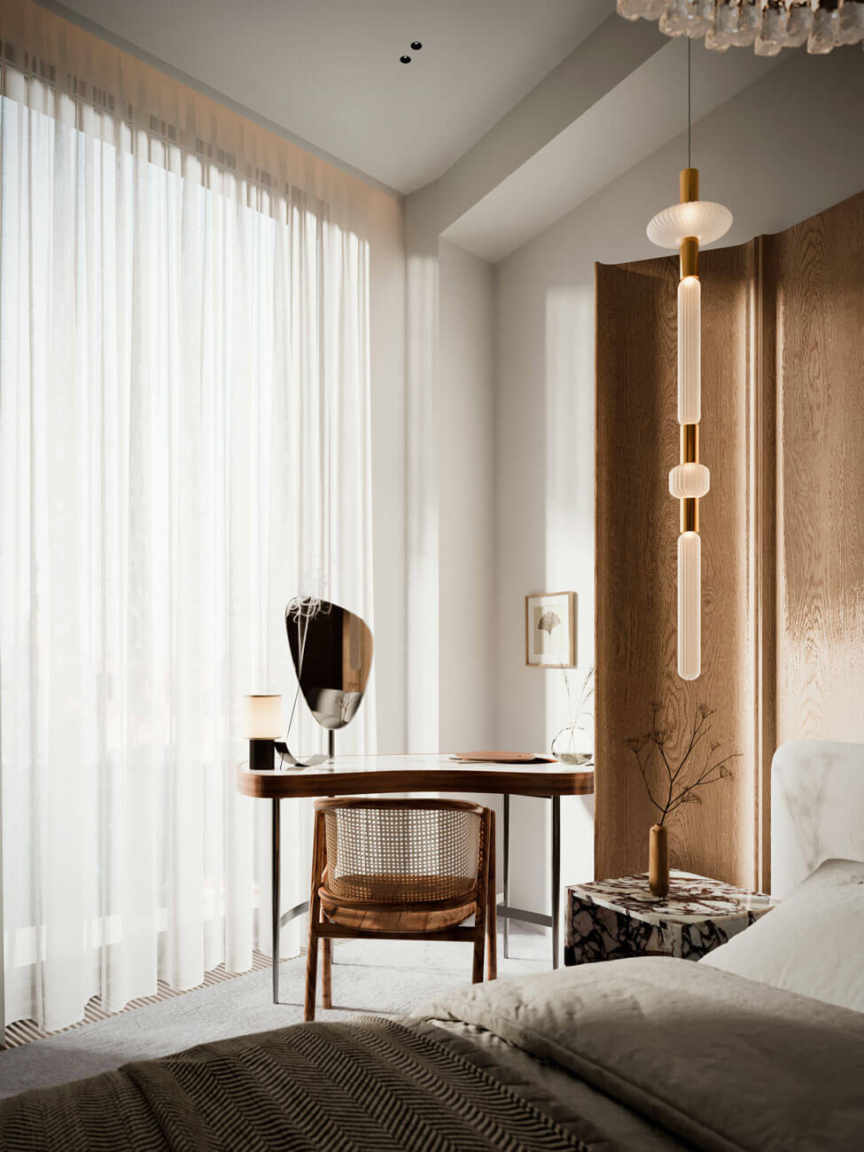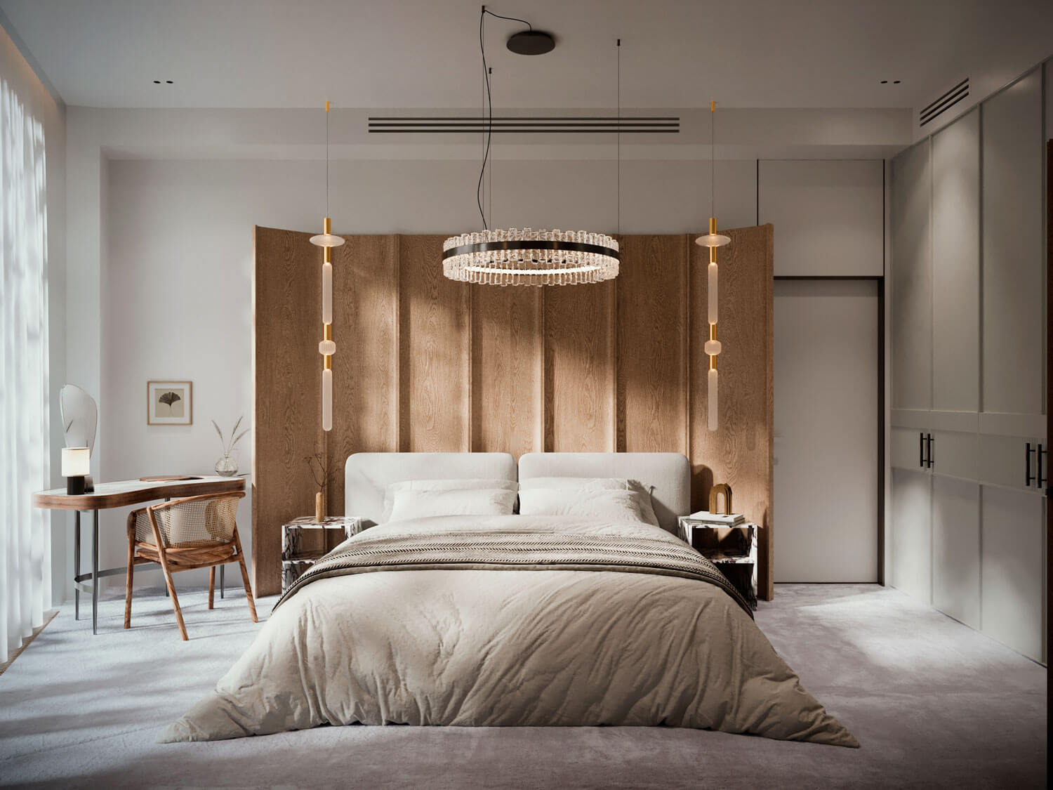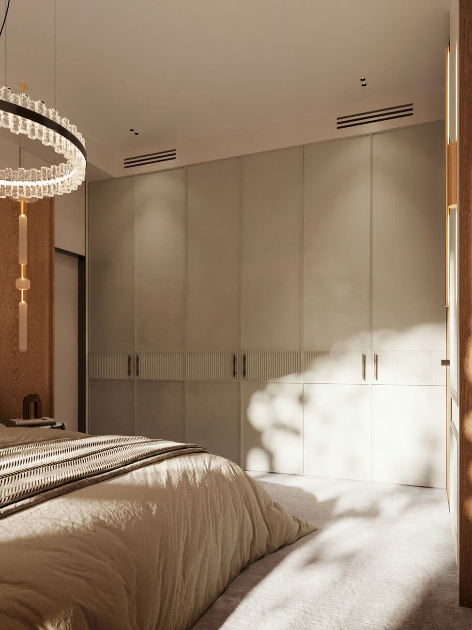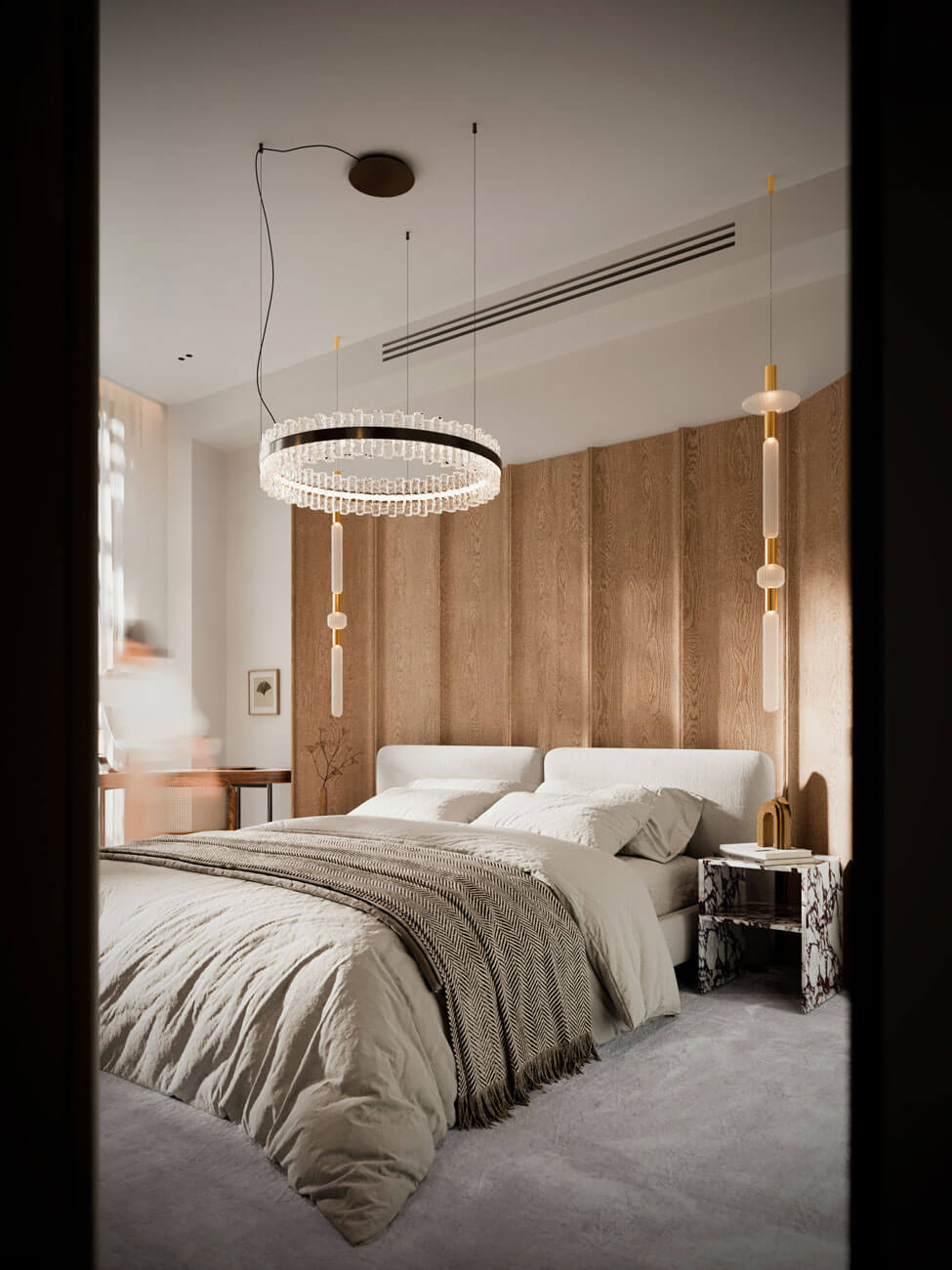 В этом проекте мы решили соединить разные стили, текстуры и материалы, при этом не слишком экспериментируя, чтобы лишать квартиру лаконичности. К примеру, стены прихожей отделаны под дерево, а пол — под мрамор. Мы также использовали скрытые шкафы, чтобы визуально облегчить пространство. Сочетание этих двух материалов можно проследить во всех комнатах — мрамор за телевизором в гостиной, деревянная панель за изголовьем кровати, мраморный фасад кухни, деревянная мебель.