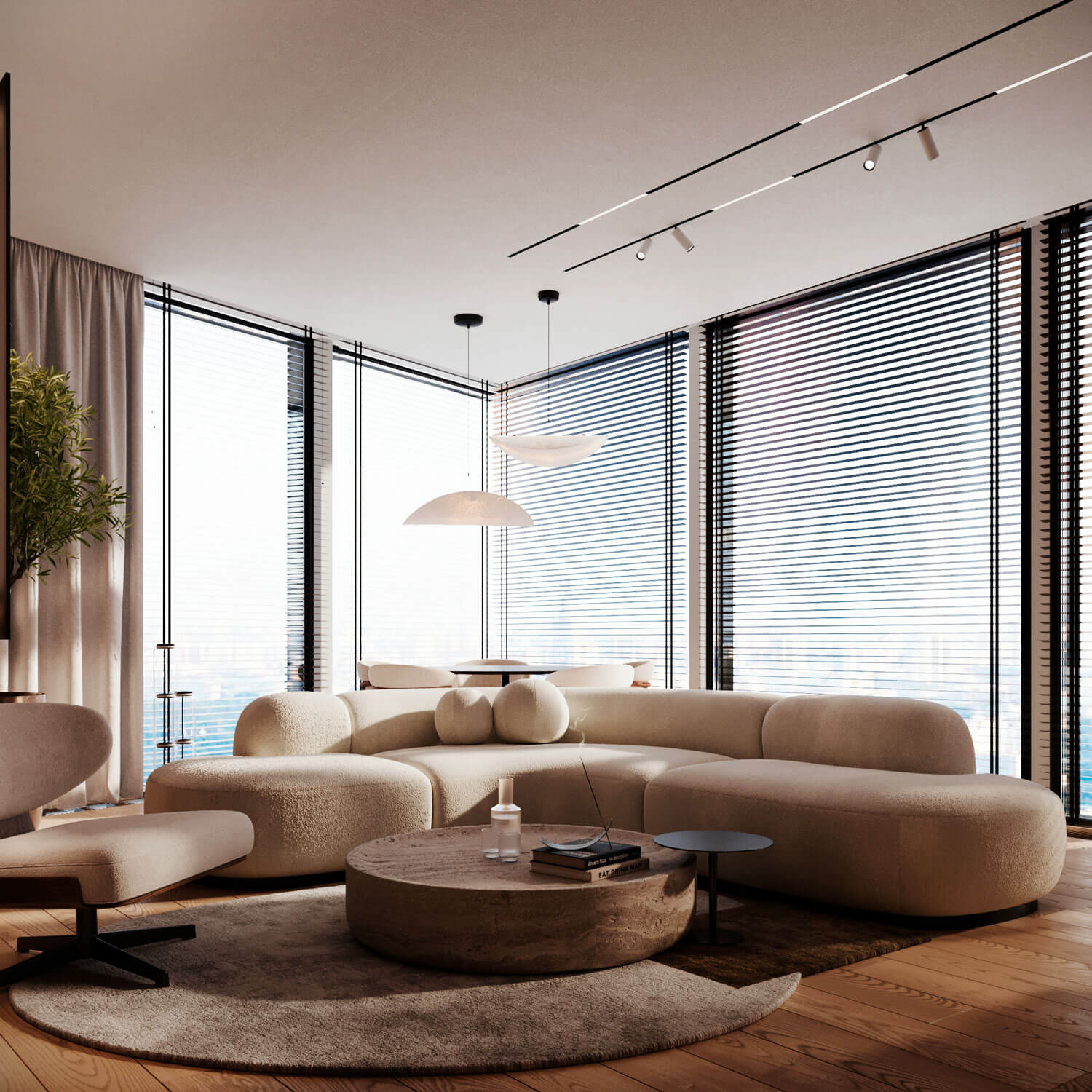 Нам повезло и в проекте изначально были заложены большие панорамные окна по всему периметру гостиной. Мы решили максимально использовать это пространство, поэтому разместили здесь не только мягкую зону отдыха с трендовым диваном округлых форм, но и зону кухни-столовой.