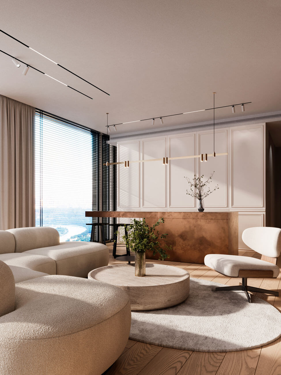 Не забыли и о дизайнерских элементах, которые создали атмосферу и передали характер и стиль заказчика: так в интерьеры появились золотые акценты, лепнина, теплое освещение и латунь.
