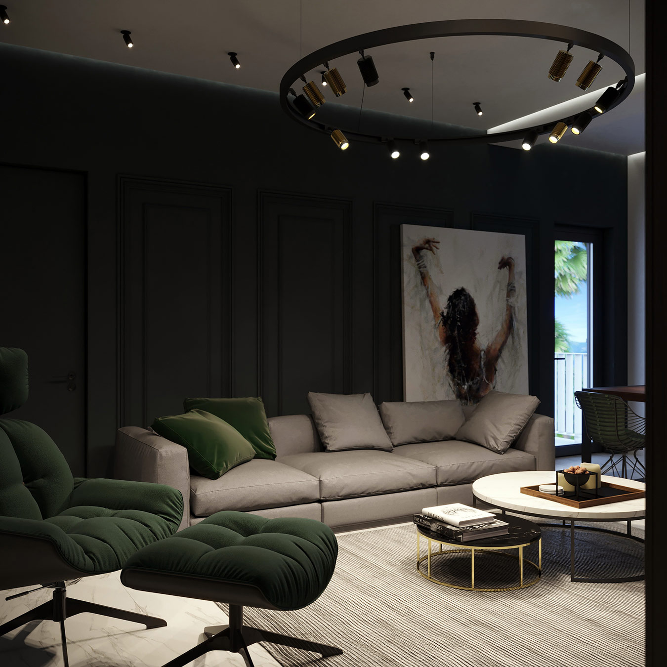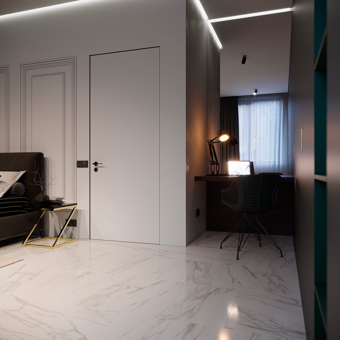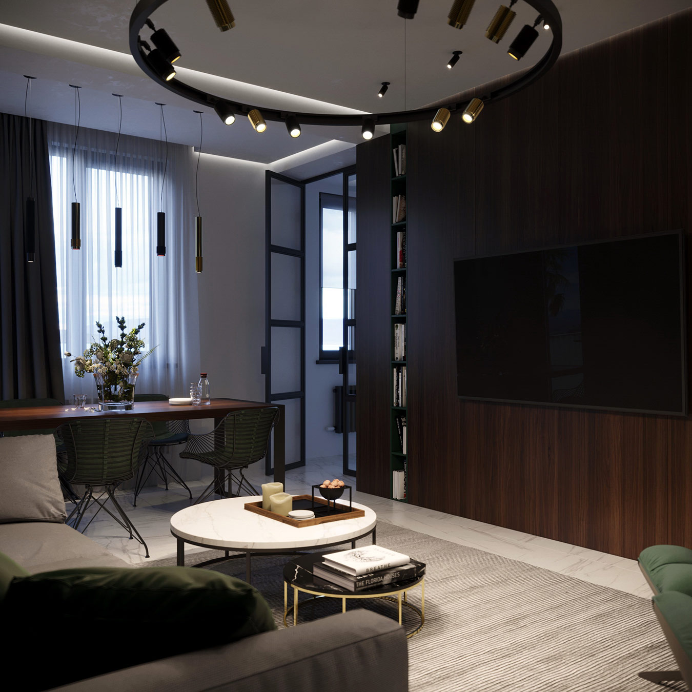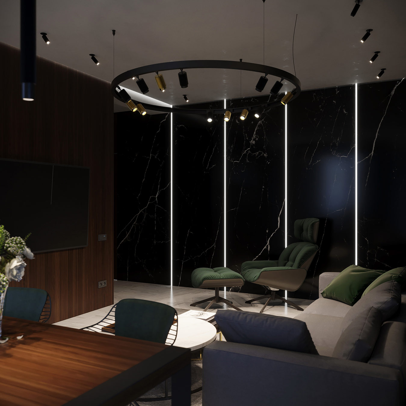Квартира находится в самом живописном районе Сочи, в Красной поляне. Интерьер выполнен в стиле минимализма создавался для современных молодых людей, живущих в ногу со своей эпохой. В отделке использовано много натуральных материалов. Пол покрыт белым мрамором, на стенах — черные мраморные панели, изготовленные из цельных каменных слэбов. На стене напротив дивана панели, отделанные натуральным шпоном американского ореха. В квартире очень много металла: это и светильники, и подстолья столов, и дверки, ведущие в кухню. Мрамор, дерево и металл — основные материалы этого интерьера, но, несмотря на их брутальность, пространство выглядит уютным. Уют добавляет текстиль: мягкий диван, подушки, шторы, ковер — все это сглаживает строгость минимализма.