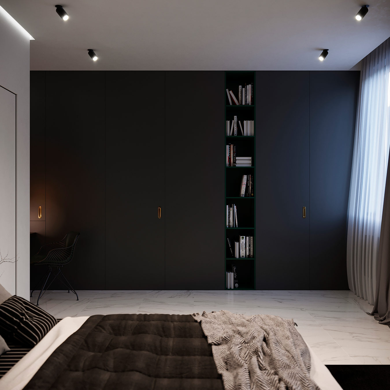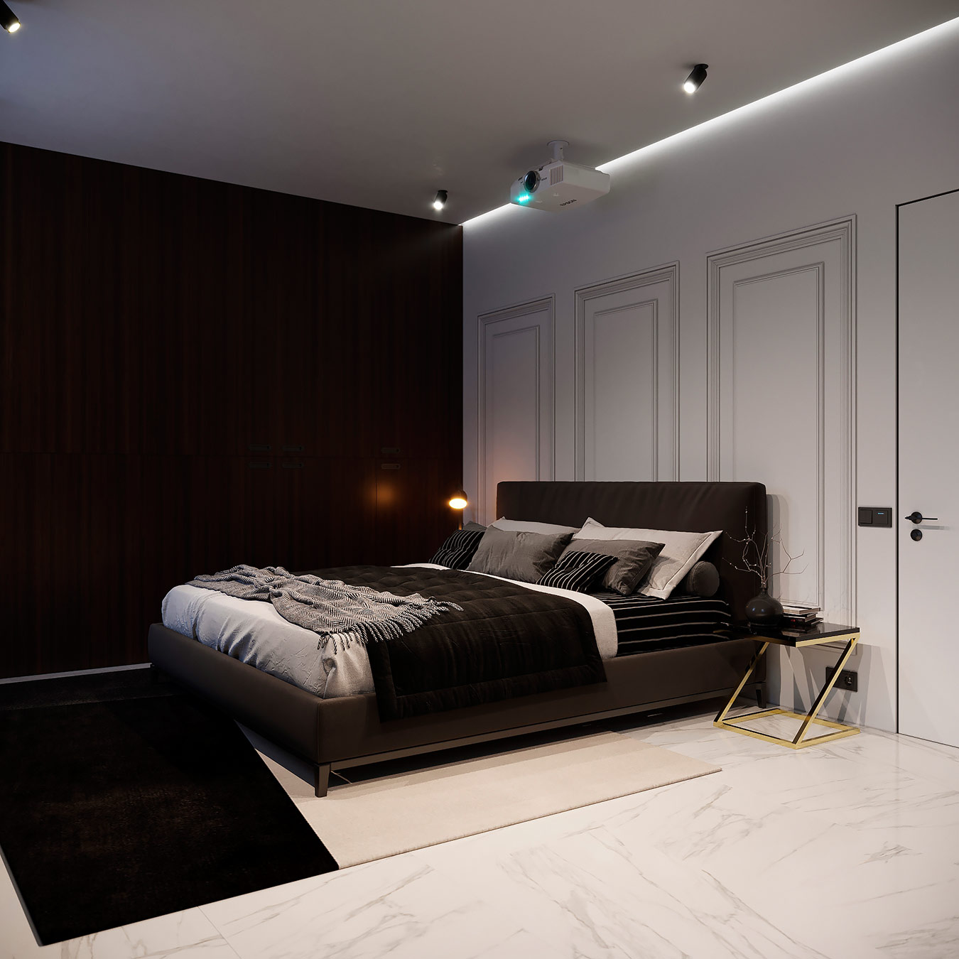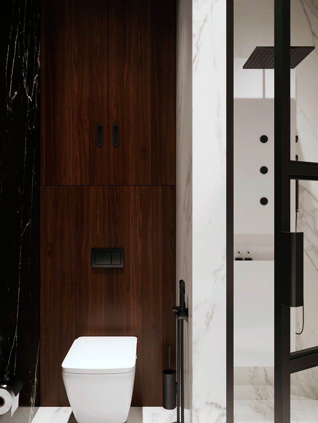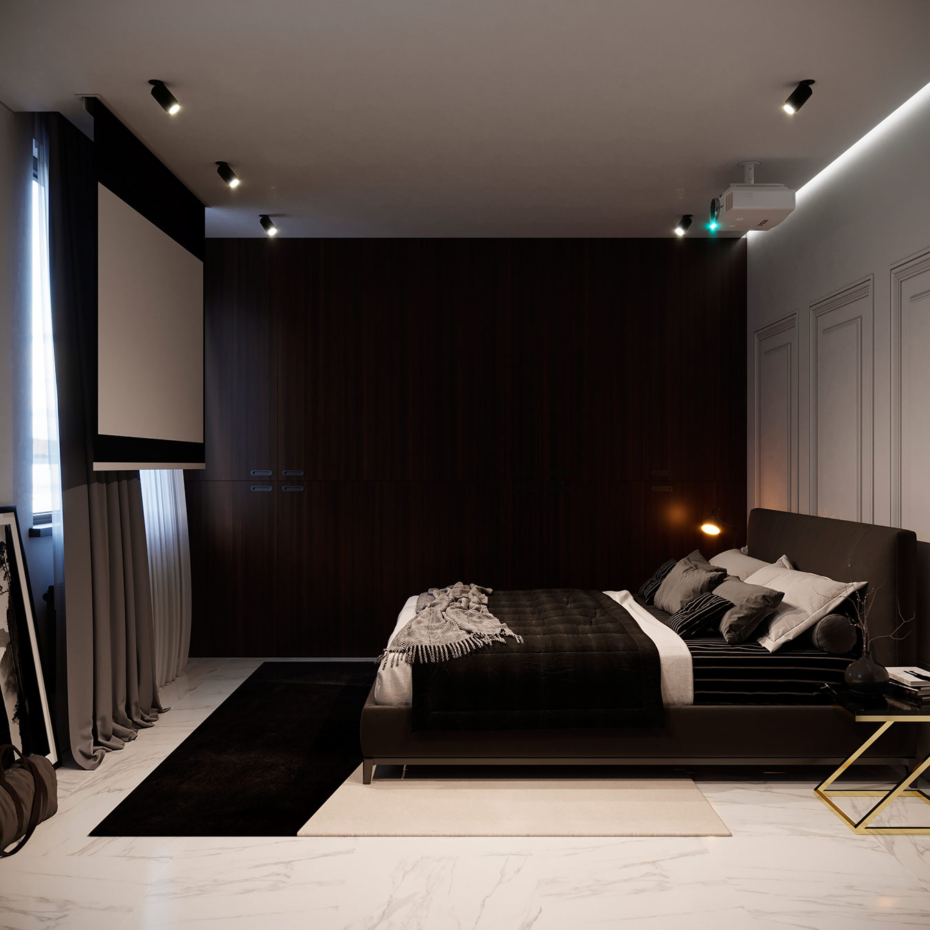Квартира находится в самом живописном районе Сочи, в Красной поляне. Интерьер выполнен в стиле минимализма создавался для современных молодых людей, живущих в ногу со своей эпохой. В отделке использовано много натуральных материалов. Пол покрыт белым мрамором, на стенах — черные мраморные панели, изготовленные из цельных каменных слэбов. На стене напротив дивана панели, отделанные натуральным шпоном американского ореха. В квартире очень много металла: это и светильники, и подстолья столов, и дверки, ведущие в кухню. Мрамор, дерево и металл — основные материалы этого интерьера, но, несмотря на их брутальность, пространство выглядит уютным. Уют добавляет текстиль: мягкий диван, подушки, шторы, ковер — все это сглаживает строгость минимализма.