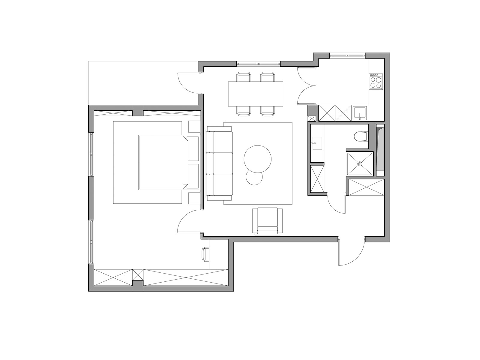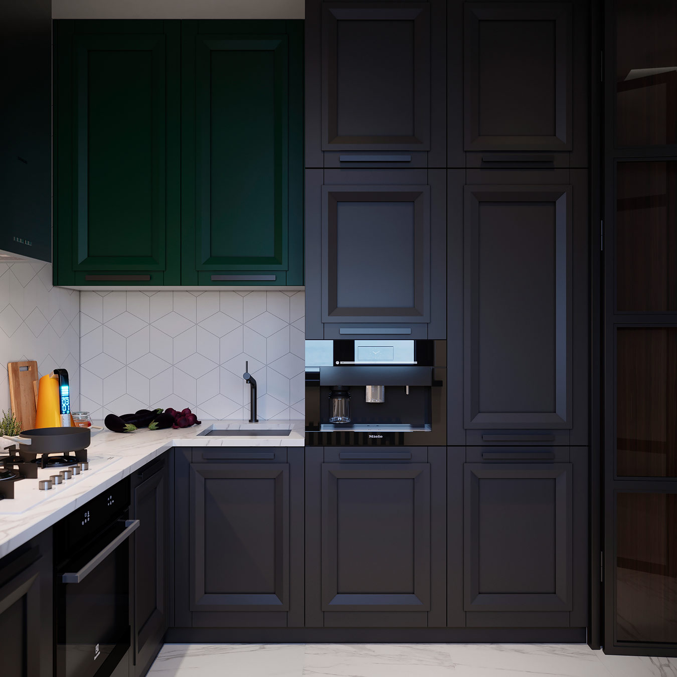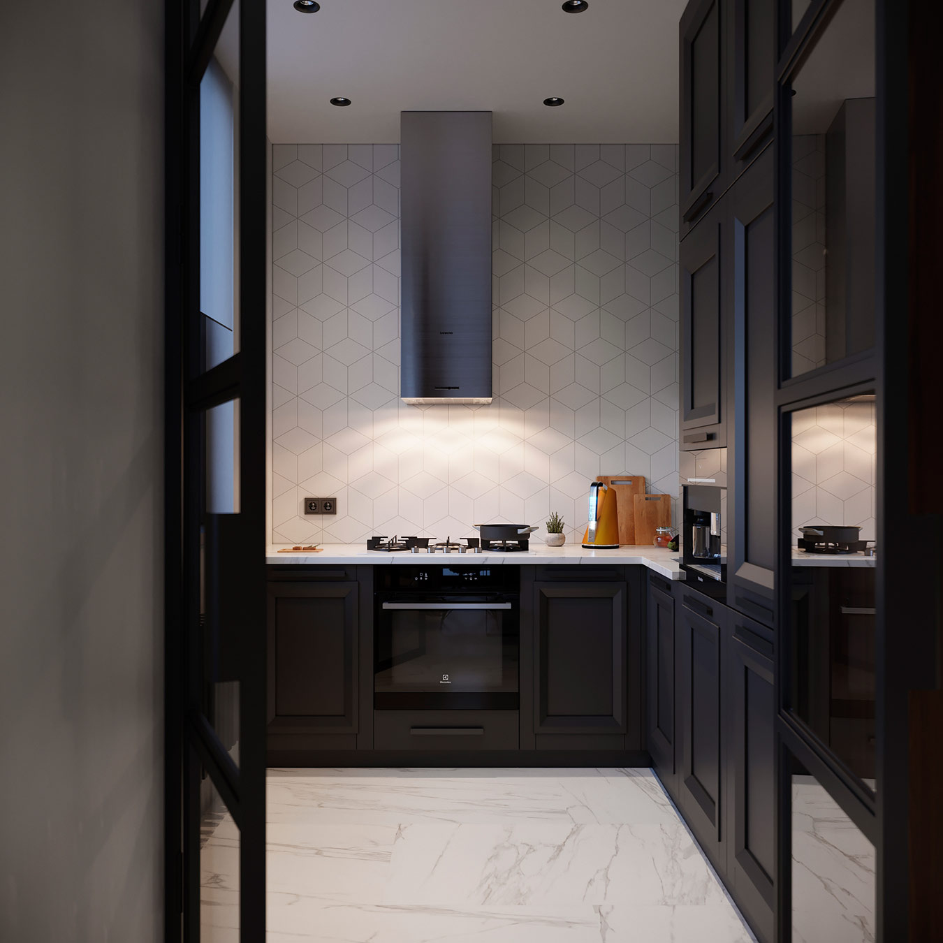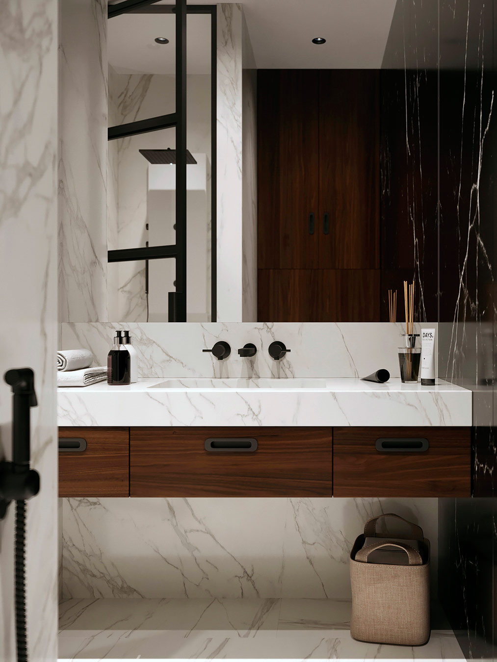 Квартира находится в самом живописном районе Сочи, в Красной поляне. Интерьер выполнен в стиле минимализма создавался для современных молодых людей, живущих в ногу со своей эпохой. В отделке использовано много натуральных материалов. Пол покрыт белым мрамором, на стенах — черные мраморные панели, изготовленные из цельных каменных слэбов. На стене напротив дивана панели, отделанные натуральным шпоном американского ореха. В квартире очень много металла: это и светильники, и подстолья столов, и дверки, ведущие в кухню. Мрамор, дерево и металл — основные материалы этого интерьера, но, несмотря на их брутальность, пространство выглядит уютным. Уют добавляет текстиль: мягкий диван, подушки, шторы, ковер — все это сглаживает строгость минимализма.