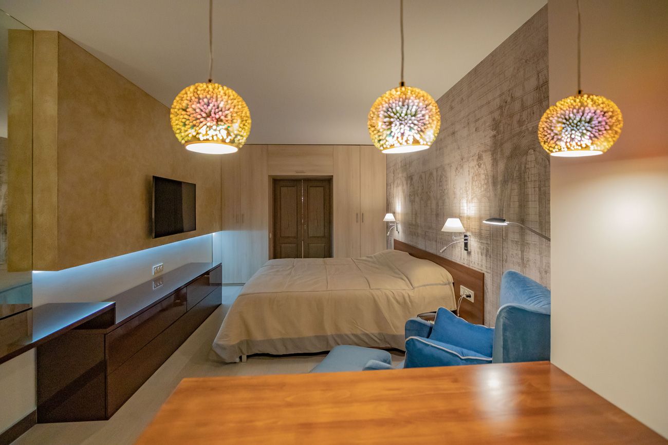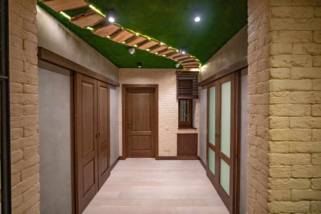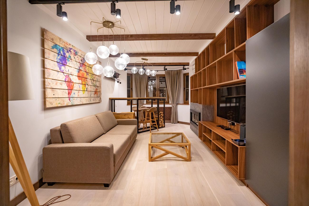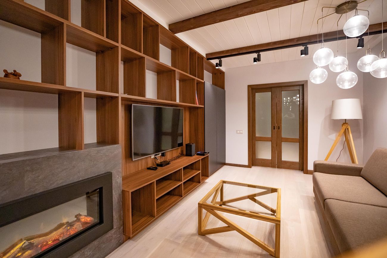 Изюминками проекта стали настоящие дрова в ножках барной стойки, полка-самолет, деревянная тропинка на потолке из искусственной травы и электрический камин, обрамленный в каменный портал и являющийся частью стеллажа в гостиной.