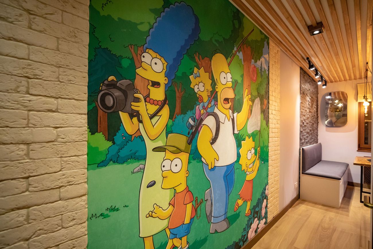 В отделке квартиры использованы такие материалы, как гипсовый кирпичик, декоративная штукатурка «под бетон», фреска, напечатанная на заказ с иллюстрацией «Симпсоны», натуральный камень, искусственная трава на потолке прихожей, деревянные балки и вагонка, напечатанные обои, керамогранит и паркетная доска.