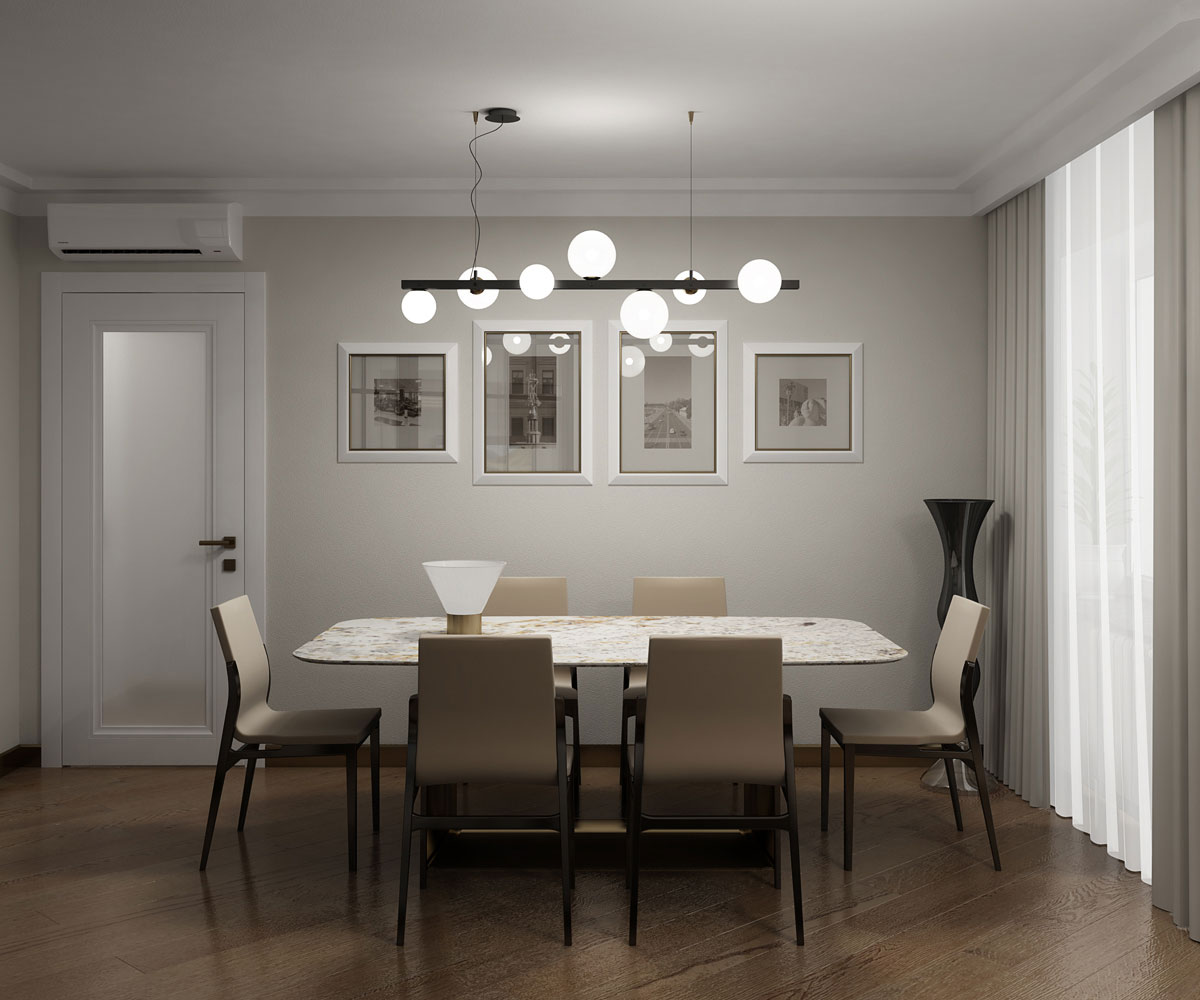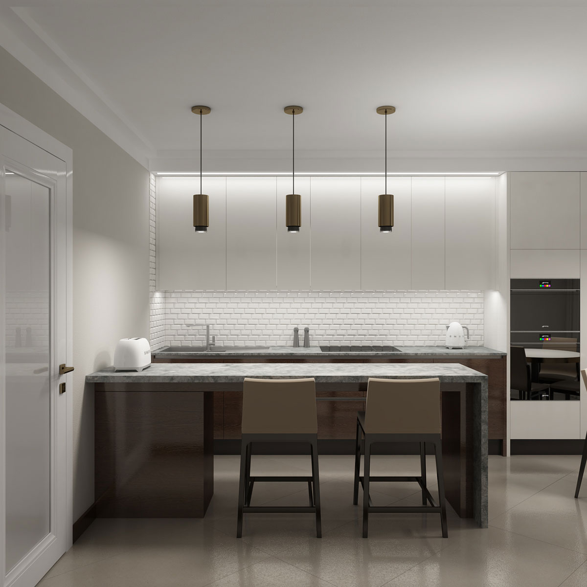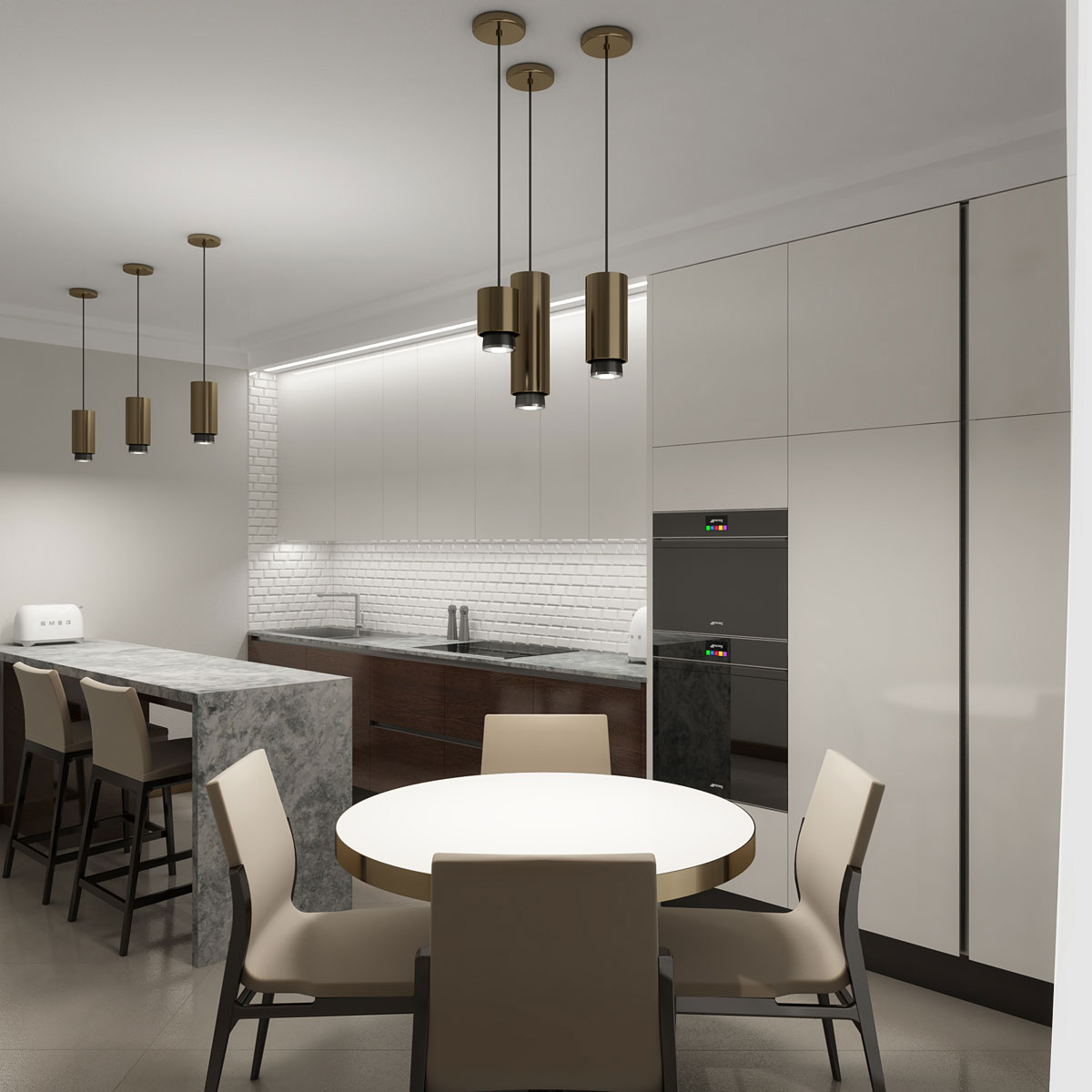 При разработке планировки квартиры было принято решение отказаться от ставшего уже традиционным приема объединения кухни и гостиной. Гостиная является композиционным центром квартиры, местом проведения досуга семьи и друзей.