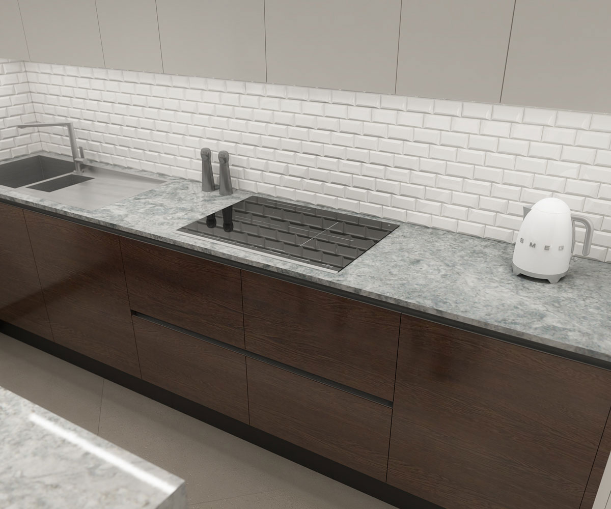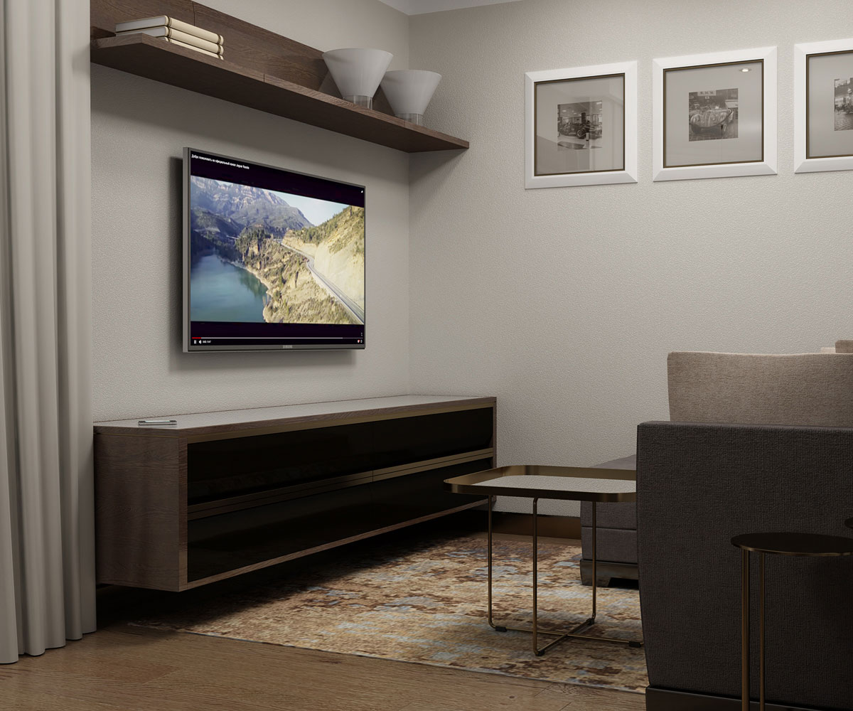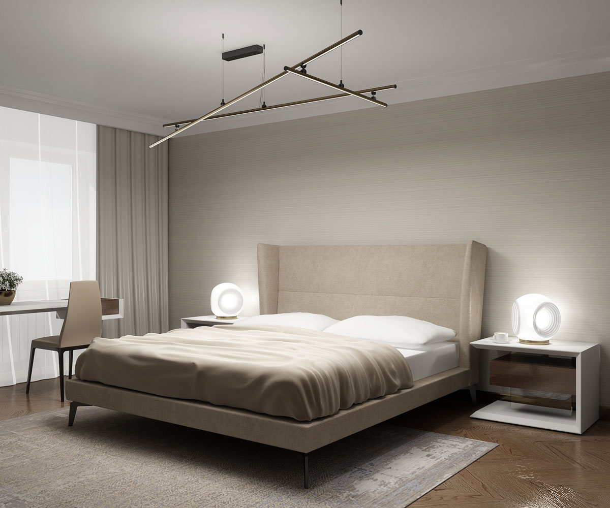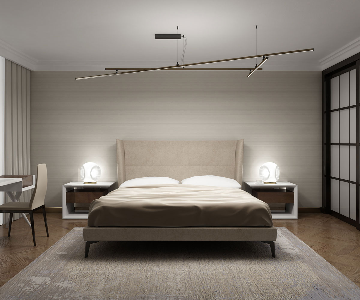 В цветовой палитре преобладают теплые оттенки. Мебель преимущественно из натуральных материалов (дерево, шпон, натуральный камень).