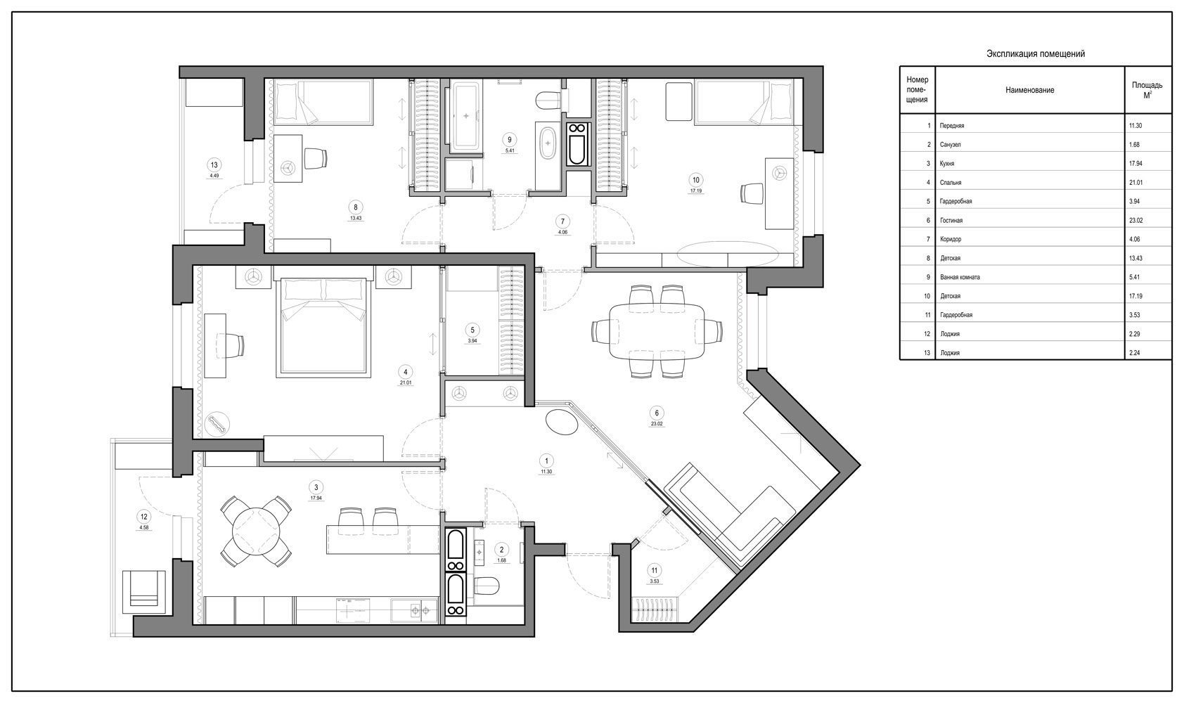 Дизайн-проектом предусмотрено планировочное решение квартиры, обеспечивающее комфортное проживание семьи из четырех человек.
