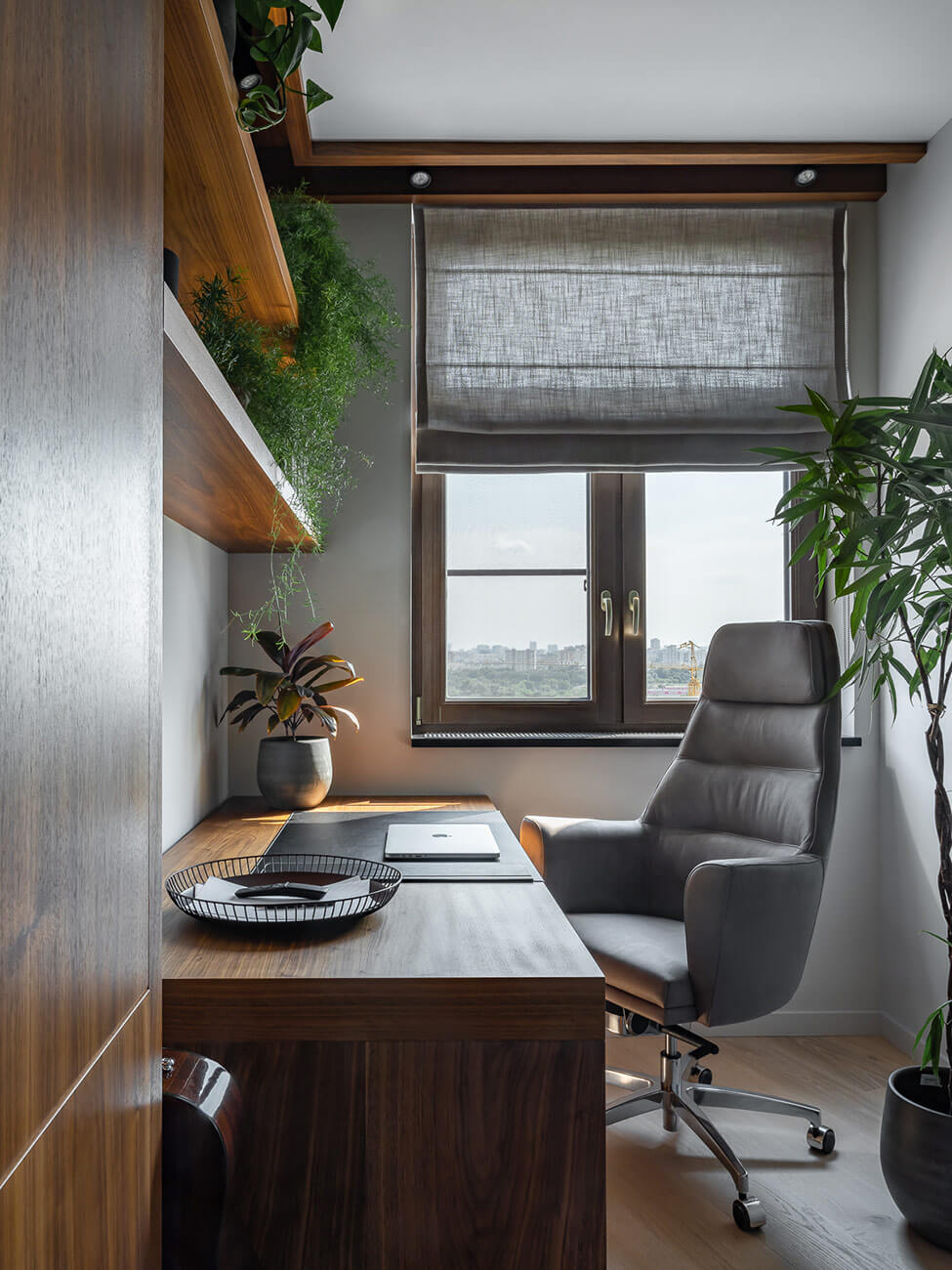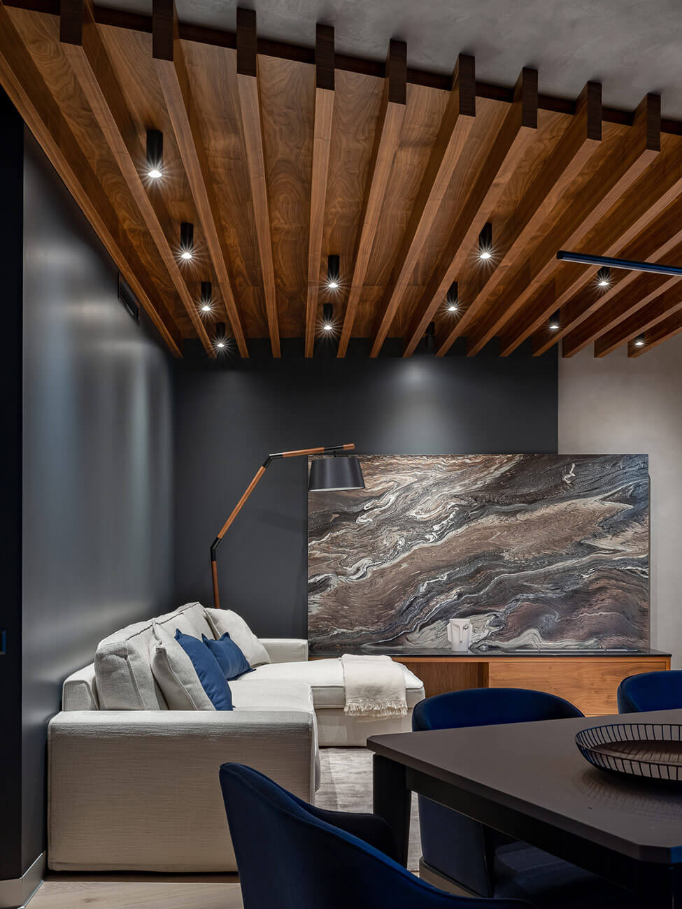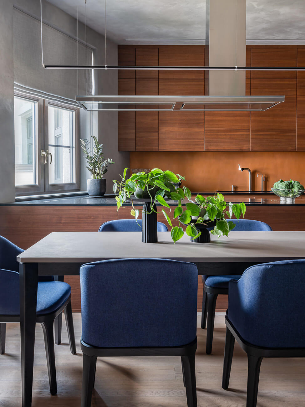 Нам хотелось создать чистое архитектурное пространство со строгими линиями, где основными акцентами будут яркая фактура дерева, мрамора в зоне камина и живые растения. В Москве чувствуется оторванность от природы, этот недостаток мы хотели в полной мере восполнить натуральными материалами.