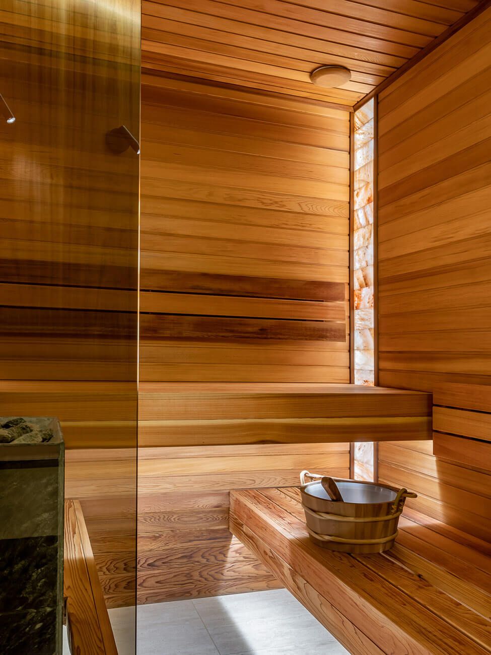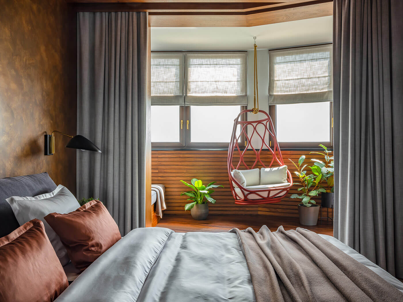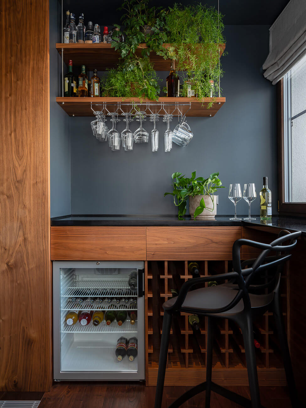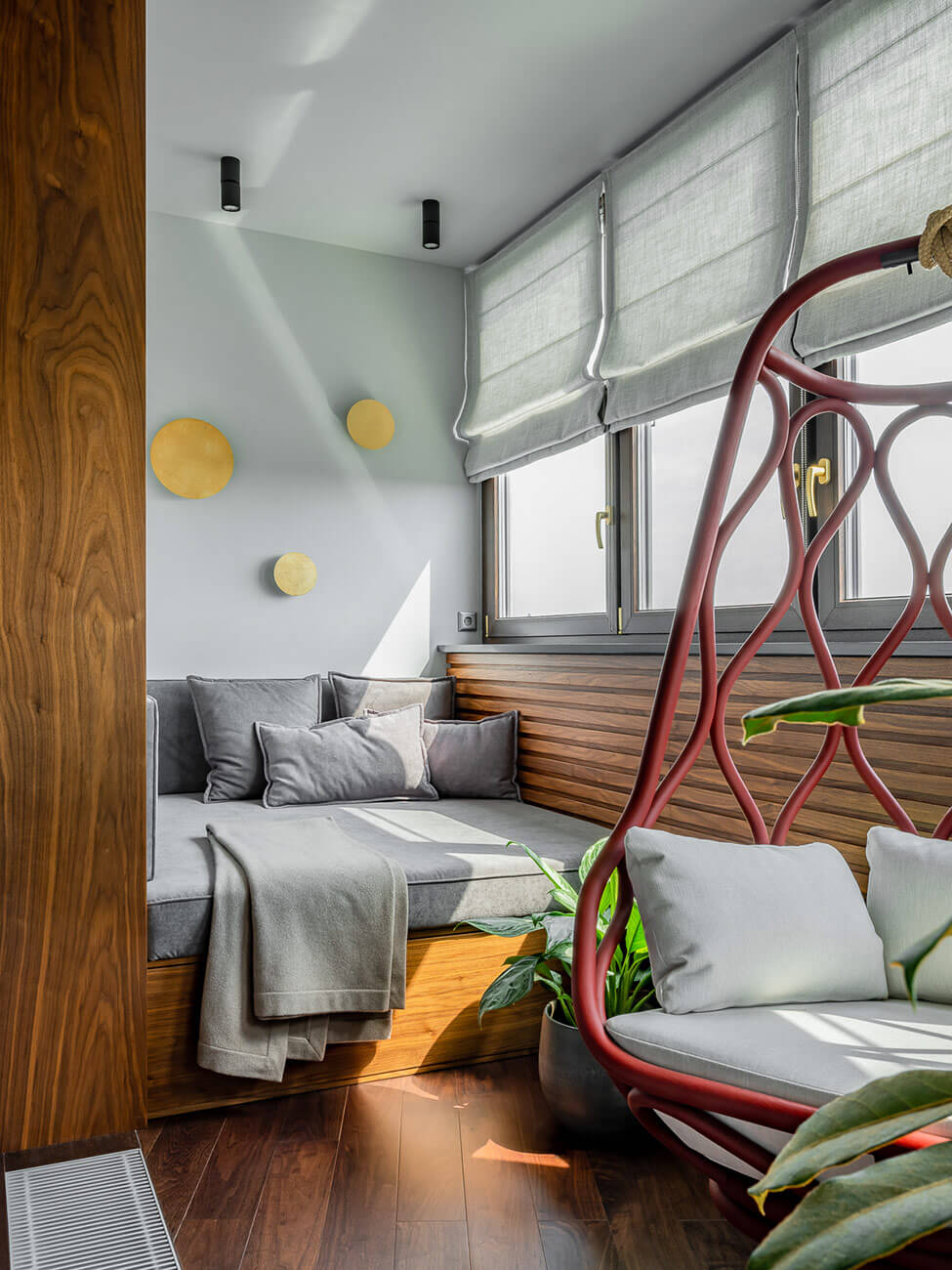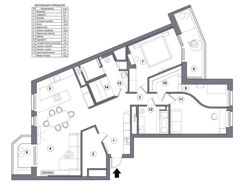 По желанию заказчиков были сделаны просторные гардеробные комнаты — отдельные для мужа и жены. Для хозяина предусмотрели потайной кабинет, вход в который обнаруживается не сразу, так как спрятан за стеллажом в гардеробной. Лоджию в гостиной переоборудовали в домашний бар, а лоджию при спальне — в зимний сад. Один из санузлов дополнили внушительной по размеру сауной. В итоге получилась очень комфортное пространство с тремя смысловыми центрами — зона общения (кухня, столовая, гостиная + бар), зона релакса (спальня и сауна), зона работы (кабинет и гостевая комната, оборудованная письменным столом).