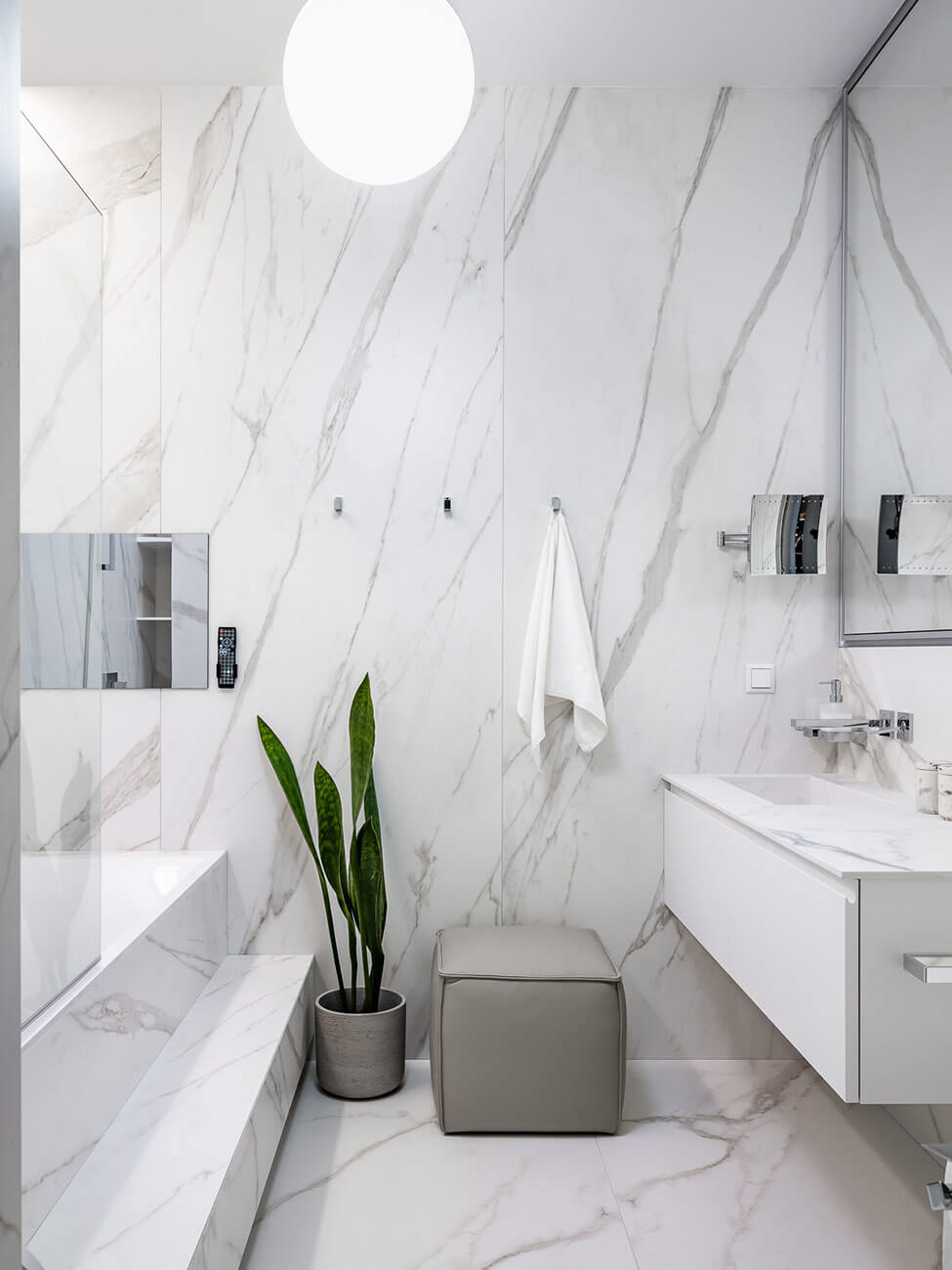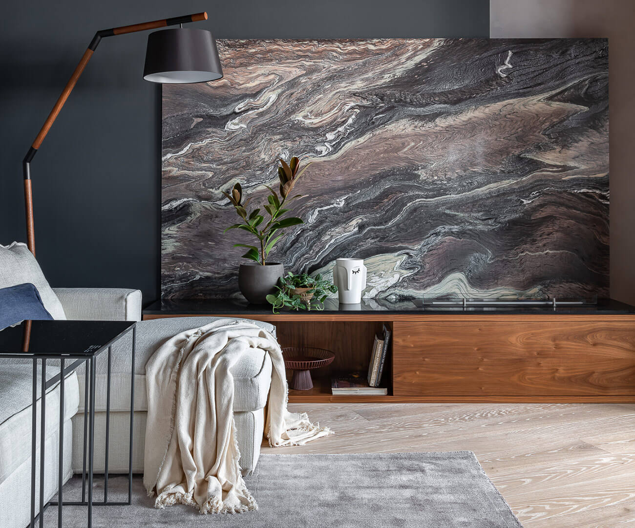 Цельность интерьеру придает цветовая гамма, а разнообразие добавляют фактуры: дерево, камень, штукатурка с фактурой бетона, гладкие поверхности, структурные ткани. С их помощью мы режиссируем пространство — что-то «растворям», как, например, массивные шкафы в прихожей, а на чем-то акцентируем внимание. Так, визуальной доминантой в гостиной стала панель из мрамора Чиполлино. В нем гармонично сочетаются и холодные серые, и теплые коричневые оттенки.