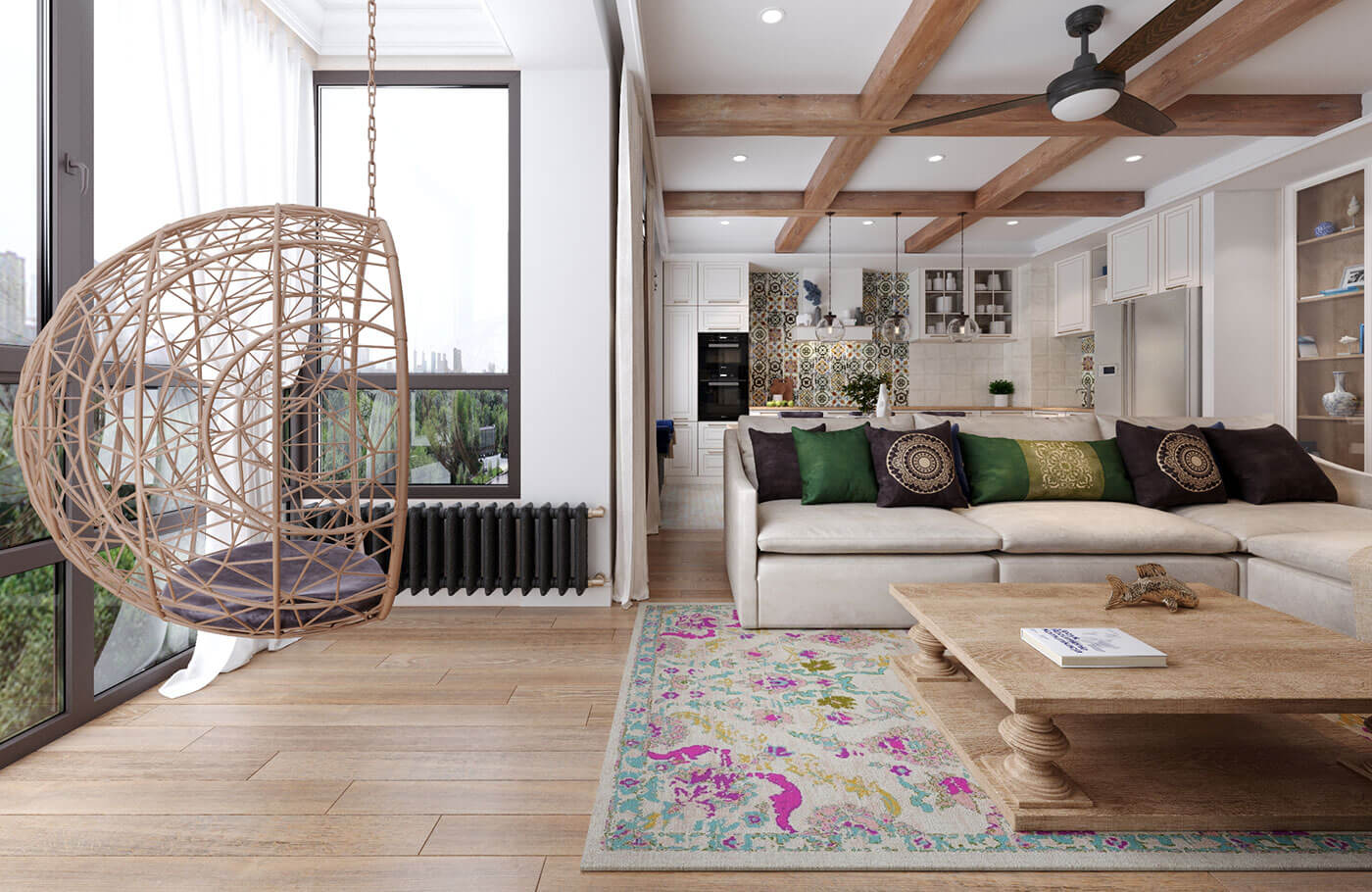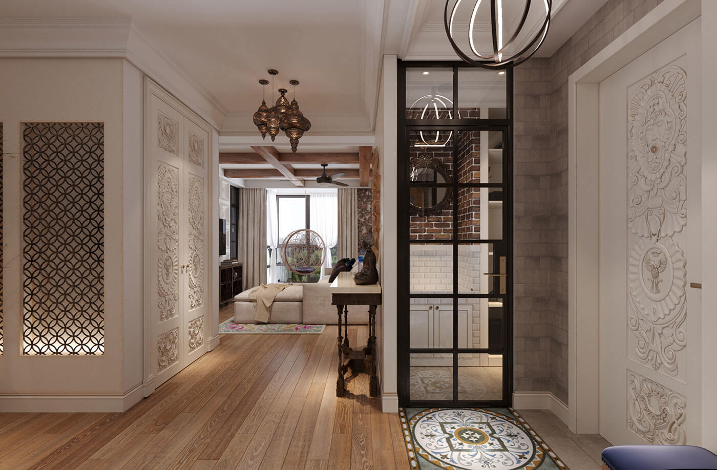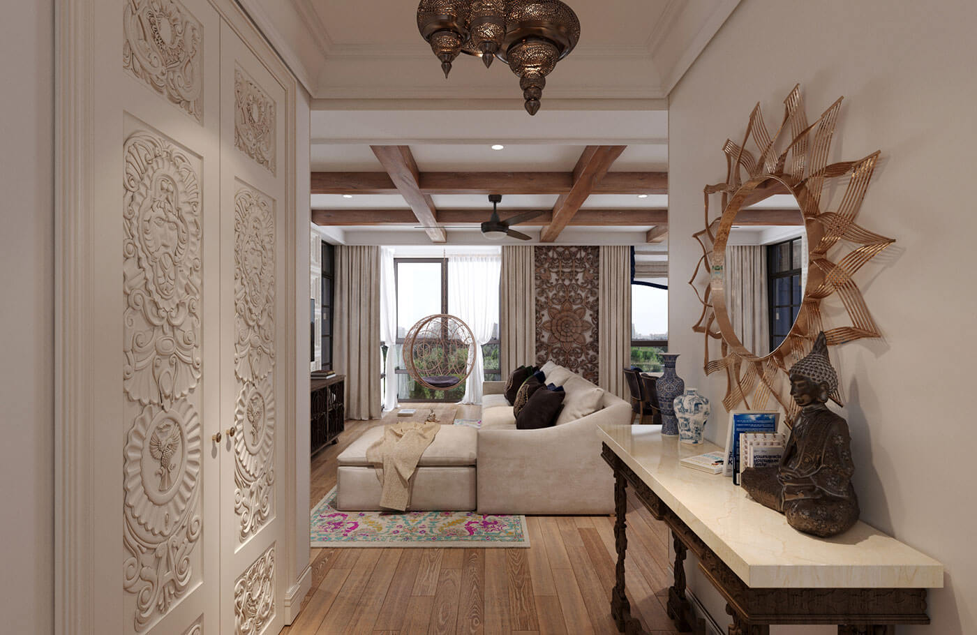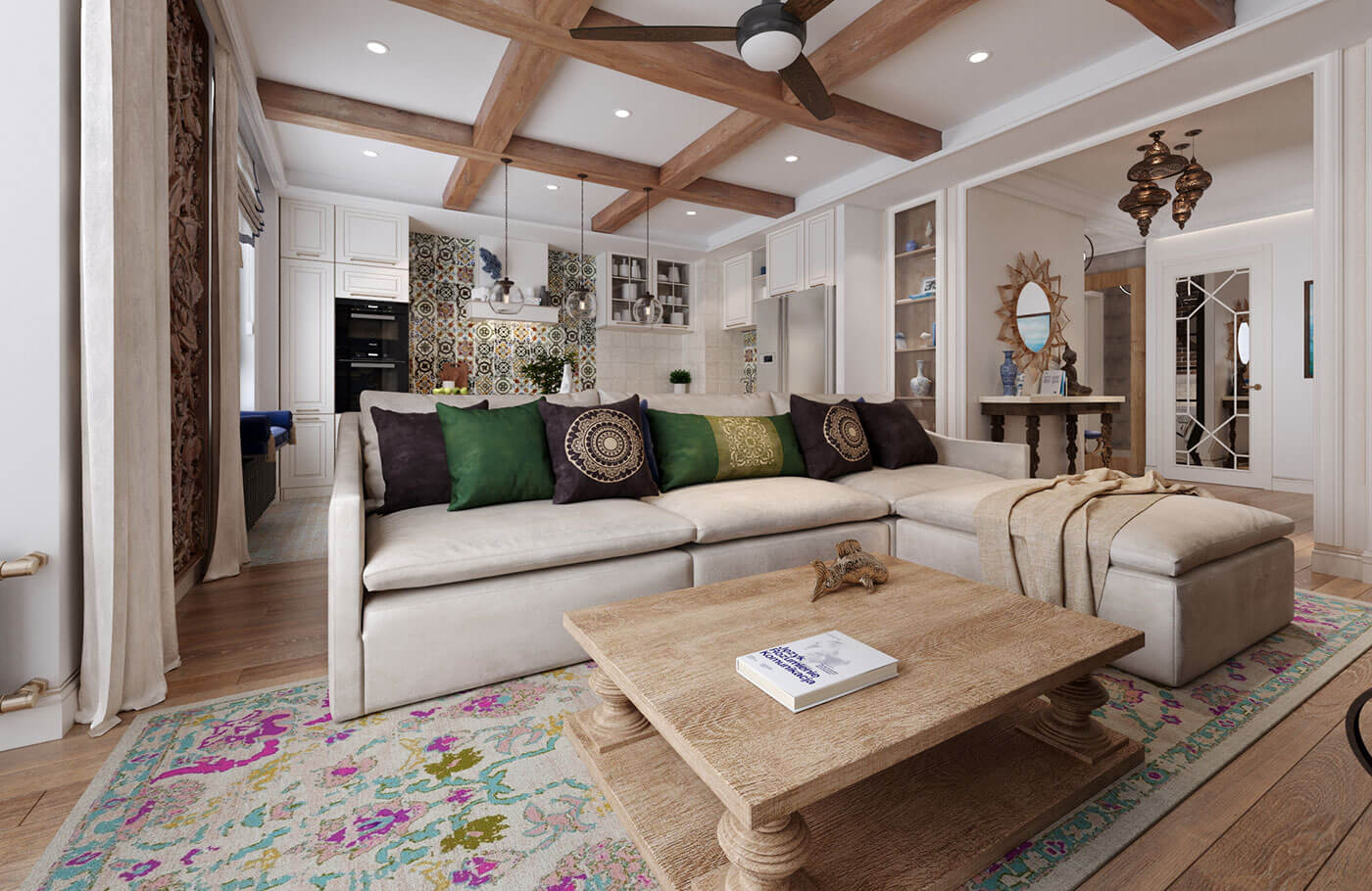 Кухня гостиная выполнена в стиле фьюжн. Особое внимание было уделено деталям с целью объединить элементы разных направлений в одной квартире. Так, например, резные панели гостиной перекликаются с резными панелями санузла в балийском стиле.