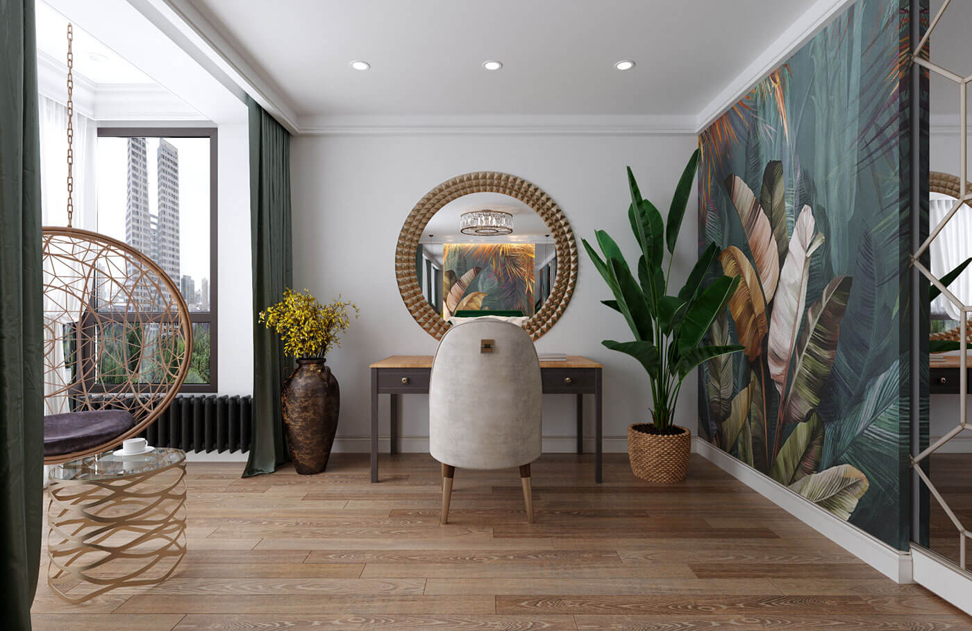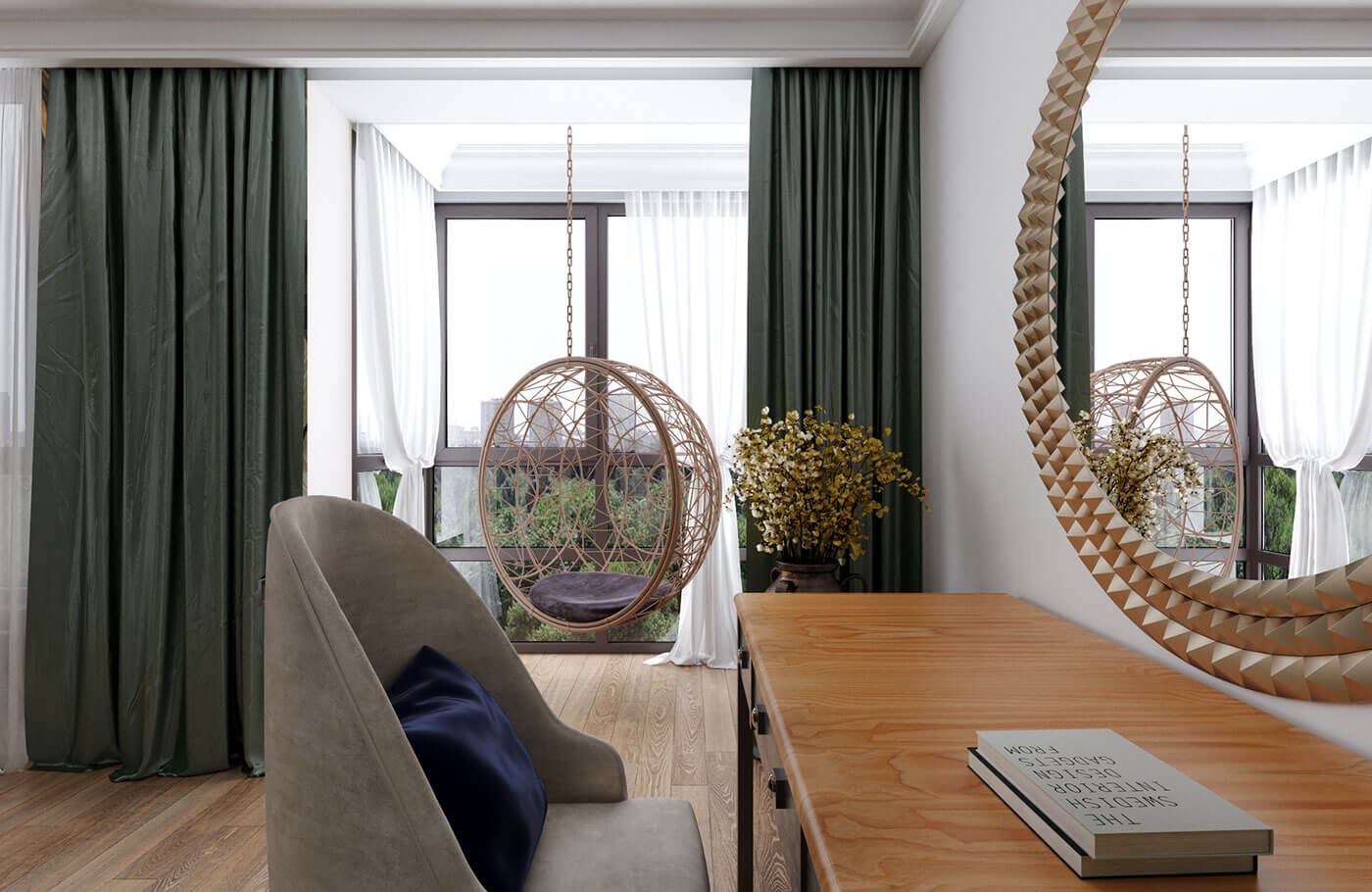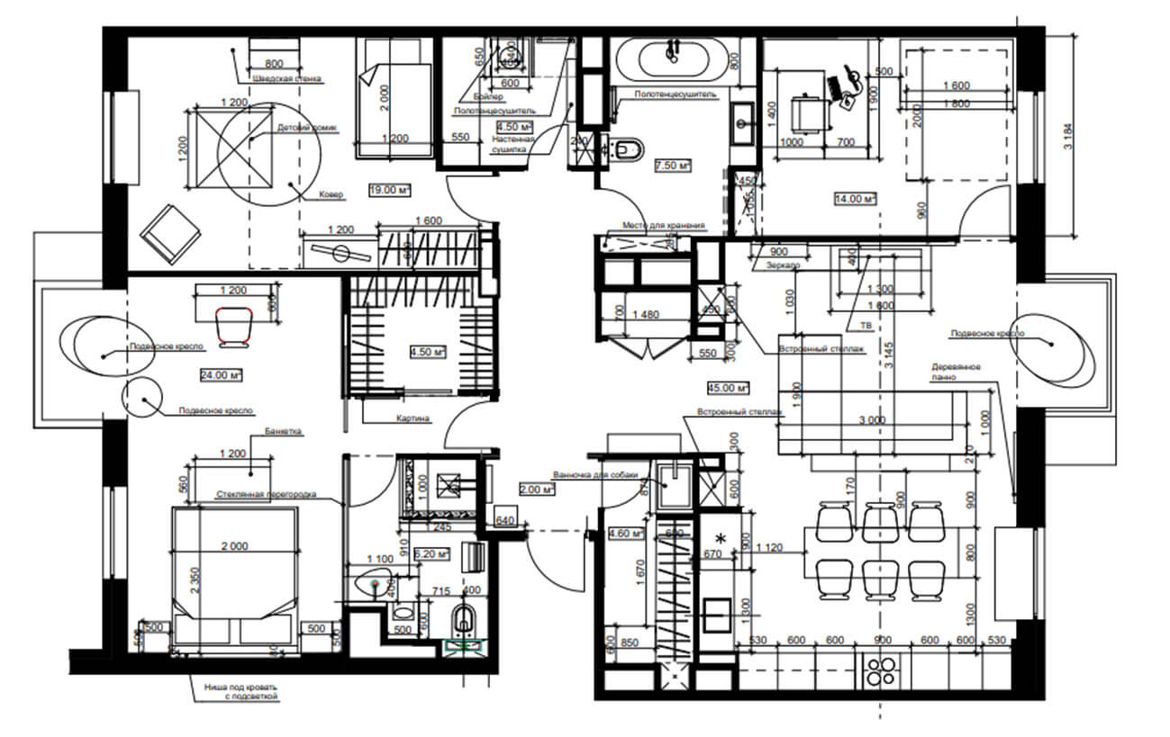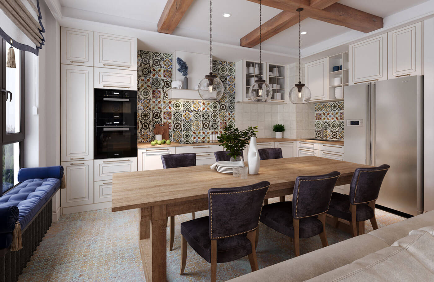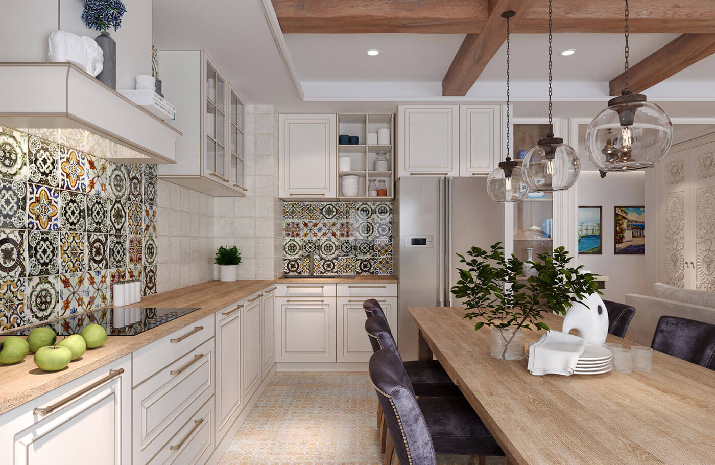 Кухня гостиная выполнена в стиле фьюжн. Особое внимание было уделено деталям с целью объединить элементы разных направлений в одной квартире. Так, например, резные панели гостиной перекликаются с резными панелями санузла в балийском стиле.