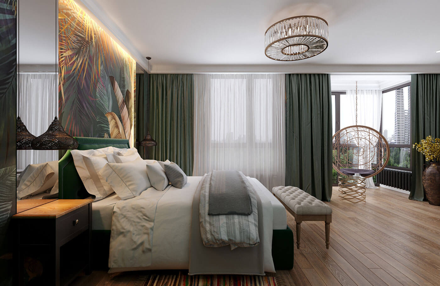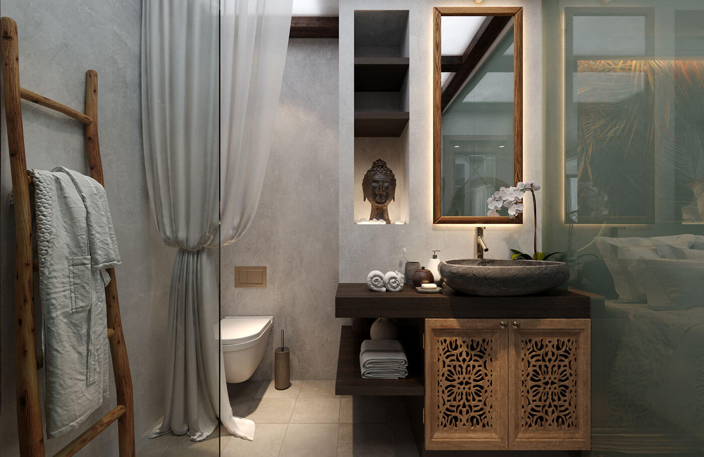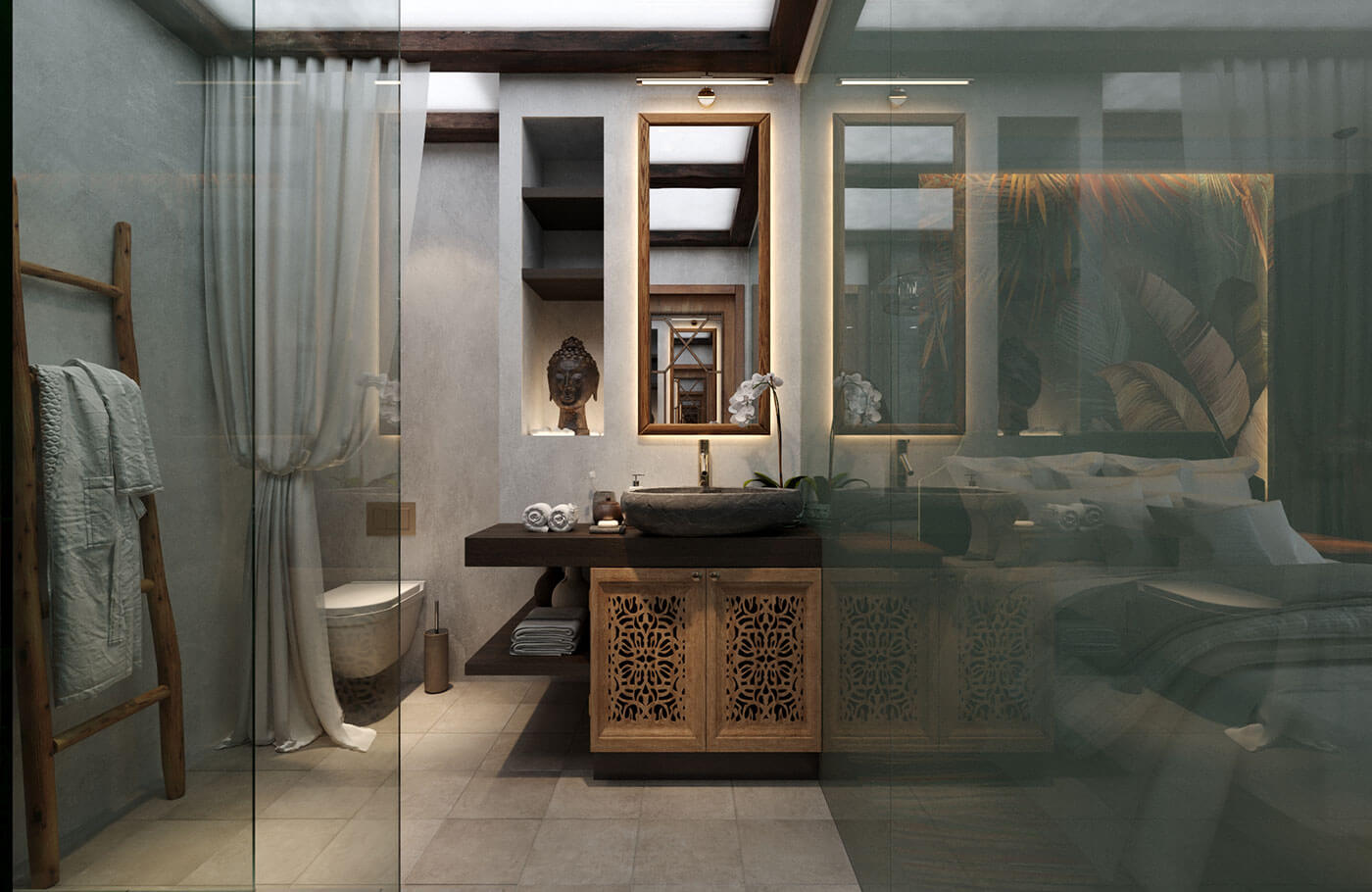Спальня. Тайский стиль спальни перекликается с балийским стилем санузла, в котором выполнен душевой поддон из натуральной гальки. За счет установки умного стекла между помещениями, разные стили гармонично объединились в единый.