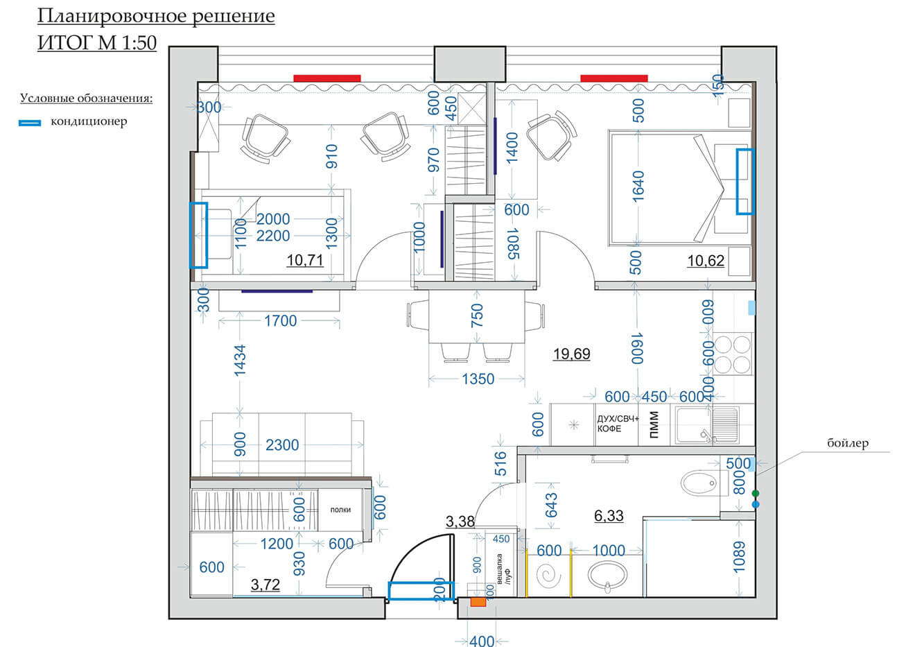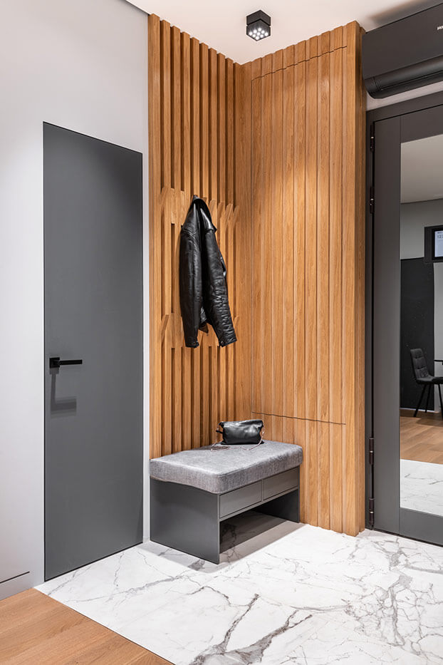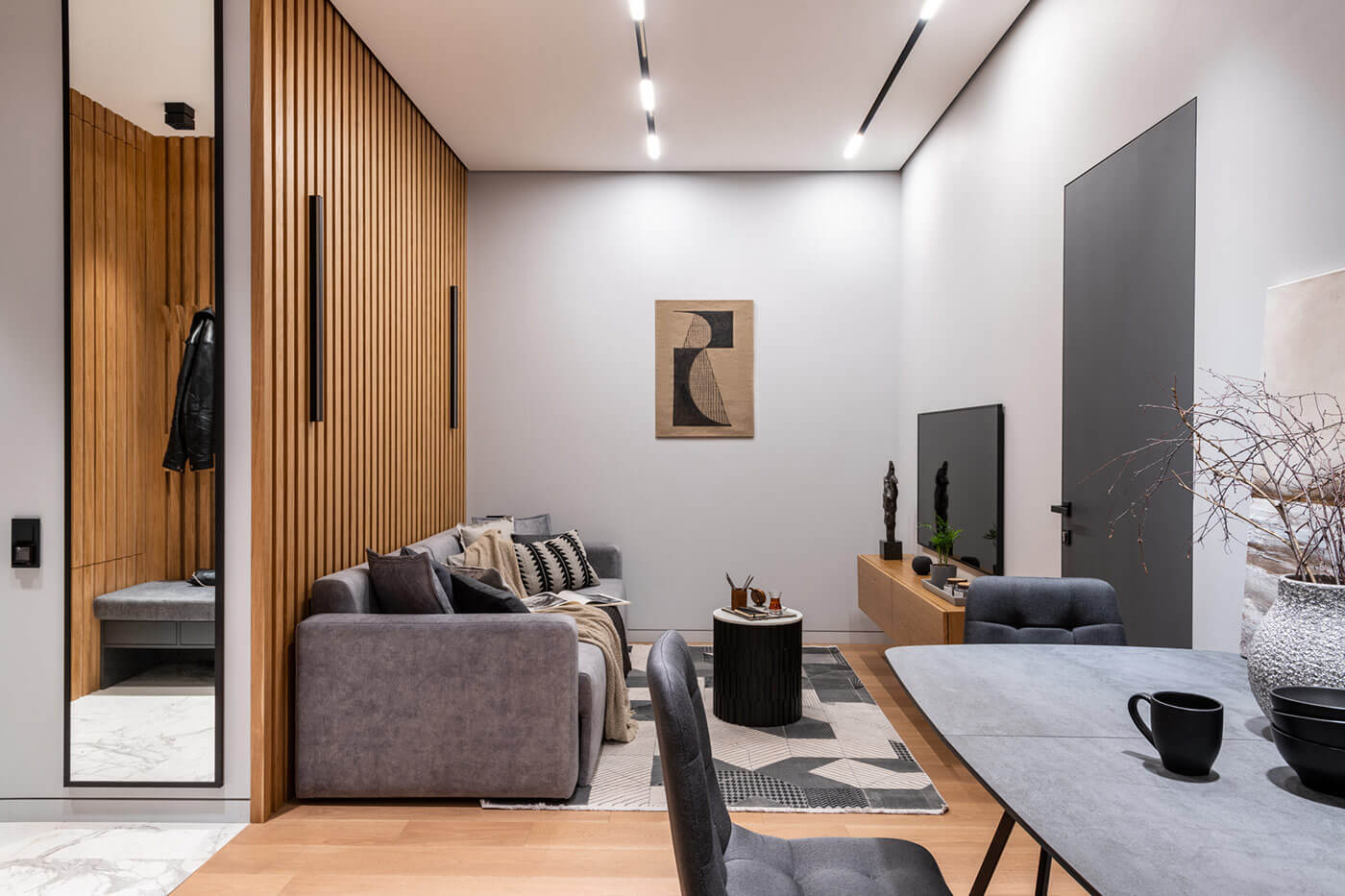 В квартире площадью 57,5 кв.м необходимо было разместить две спальные комнаты с рабочими местами и зонами хранения, общее пространство с кухонной и обеденной зоной и зоной тв, душевую с постирочной зоной и гардеробную комнату. Основные пожелания в отделке были – 3д панели, рейки, двери скрытого монтажа, подсветка по полу и потолку. Cпокойный интерьер без ярких оттенков, использование графитового и серого цвета. Светло серый цвет стал фоновым, а дерево и графит акцентным. При осуществлении данного проекта удалось применить теневой профиль от FERgips с RGB подсветкой по потолку из гипсокартона, плинтуса скрытого монтажа по всему периметру квартиры.