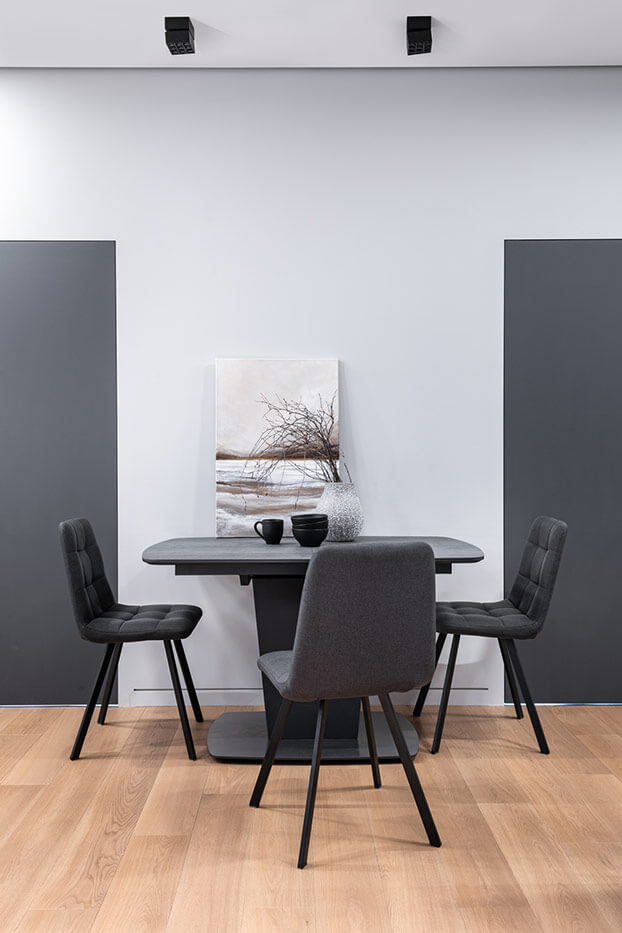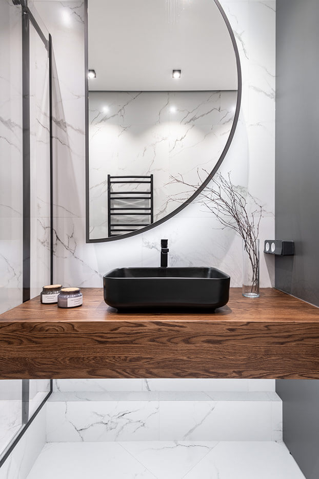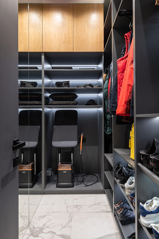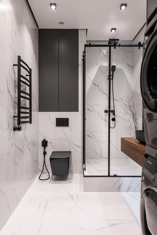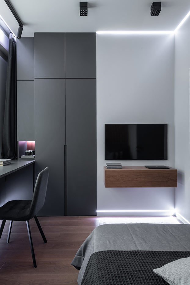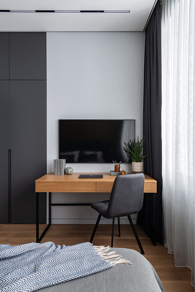 Встроенные шкафы с выдвижными секциями; кровати с организованной системой хранения; вместительный кухонный гарнитур до потолка, компактное рабочее место в спальне и большая рабочая столешница в комнате подростка с дополнительными шкафами для книг. Душевая комната строилась на контрастах – плитка под белый мрамор с черными акцентами – смесители, профиль душевой, сантехника – и основной цвет всей квартиры – графитовый – в мебели и межкомнатных дверях.