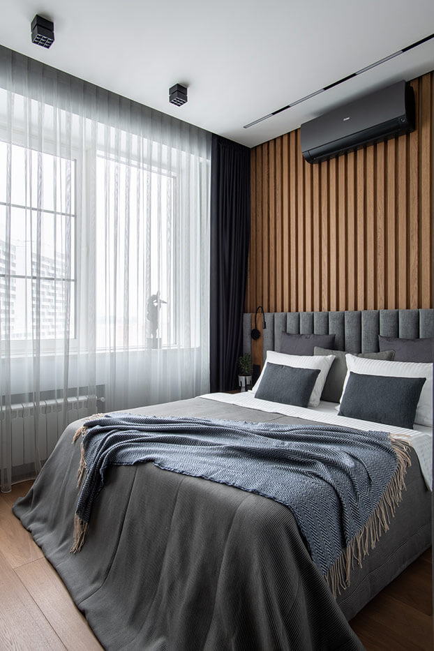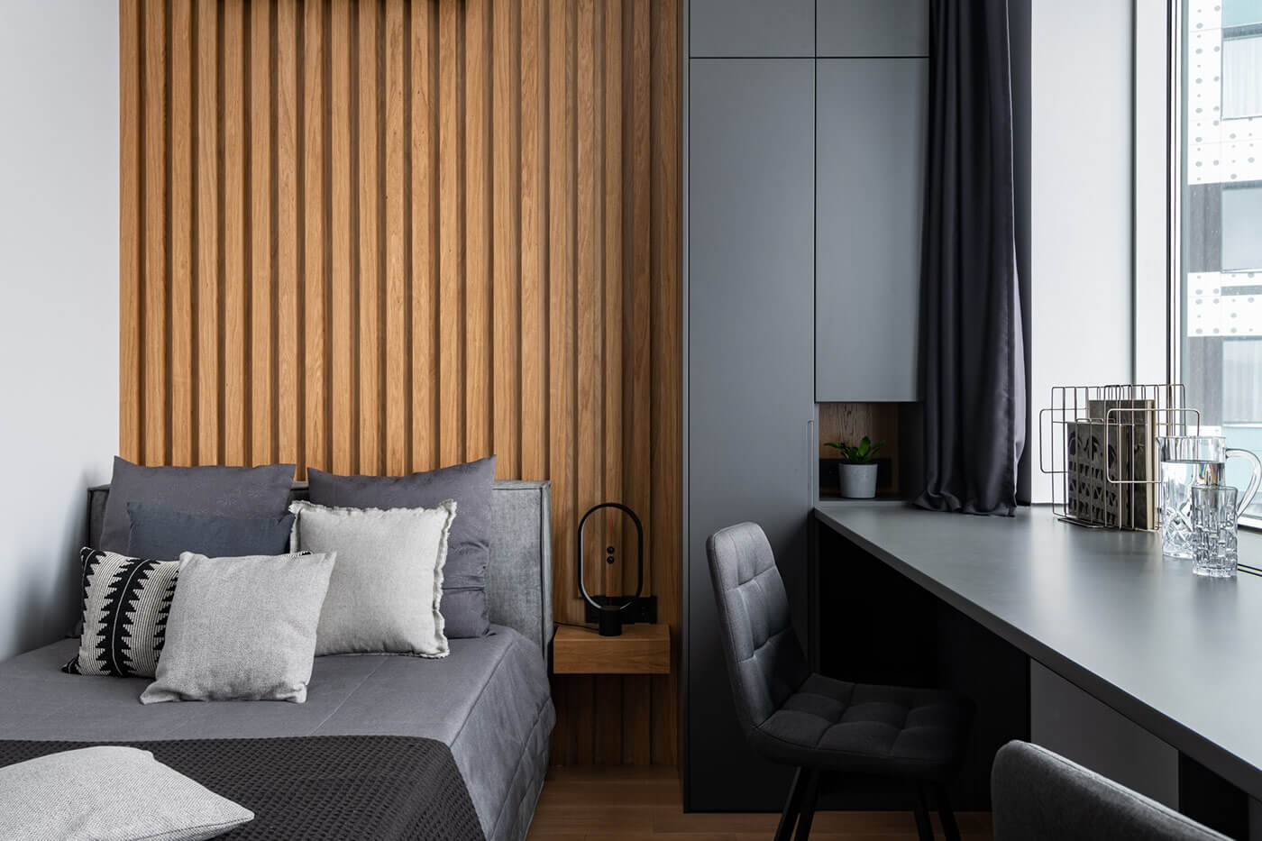 В текстильном оформлении спален сочетаются функциональность, эстетика, природная безмятежность в условиях городской жизни. Шторы дают достаточную затемненность для комфортного сна, а также имеют мягкий приглушенный шелковый блеск. При пошиве штор были учтены размеры стеновых панелей с рейками, которые задали ритм складкам на тюли и портьерам. Для покрывала в родительской спальне была использована ткань со своим ритмом — мелкая елочка с переходом от темно-графитового к светло-серому, благодаря сложной фактуре ткани покрывало смотрится завершено и изысканно.