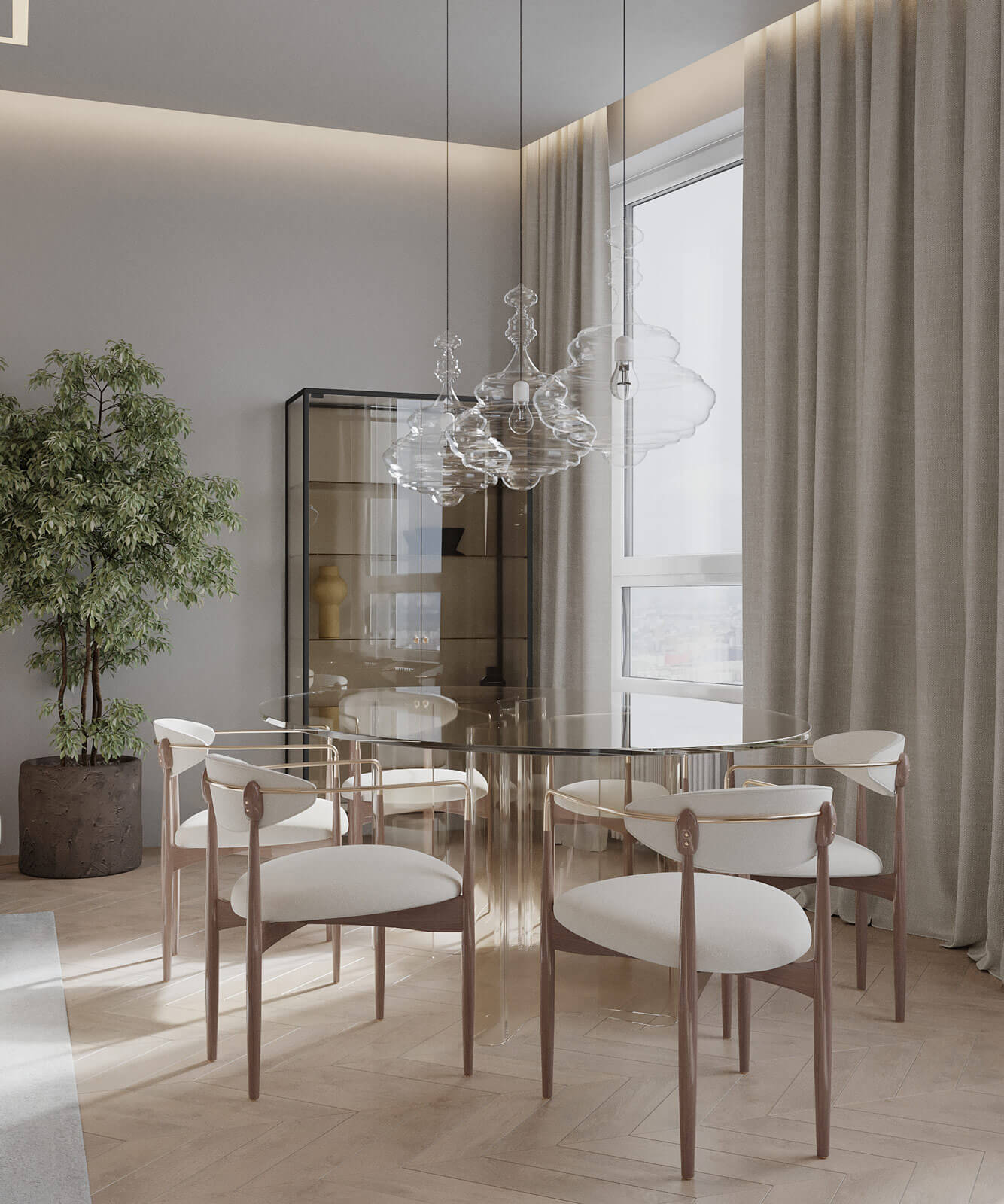 Помещение Кухни-гостиной имеет сложную форму. Мало того, что она объединена с Коридором и Прихожей, так и сама архитектура здания задает некую ломаную структуру. Наличие множества окон — определенно плюс данного помещения — естественный свет позволил выгодно преподнести нашу идею многофункционального использования. Диван Boca Tommy с подвижной спинкой делает возможным размещение гостей не только перед телевизором, но и обратиться к сидящим за обеденным столом. Стеклянный обеденный стол как будто растворяется в пространстве и является компаньоном к трем подвесным светильникам LASVIT La Scala. Прозрачный обеденный стол и подвесные светильники подчеркнули утонченные стулья Cidra Accent Chair.