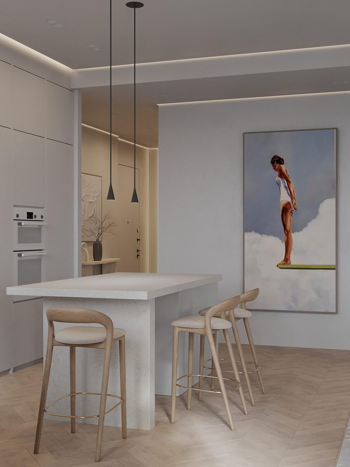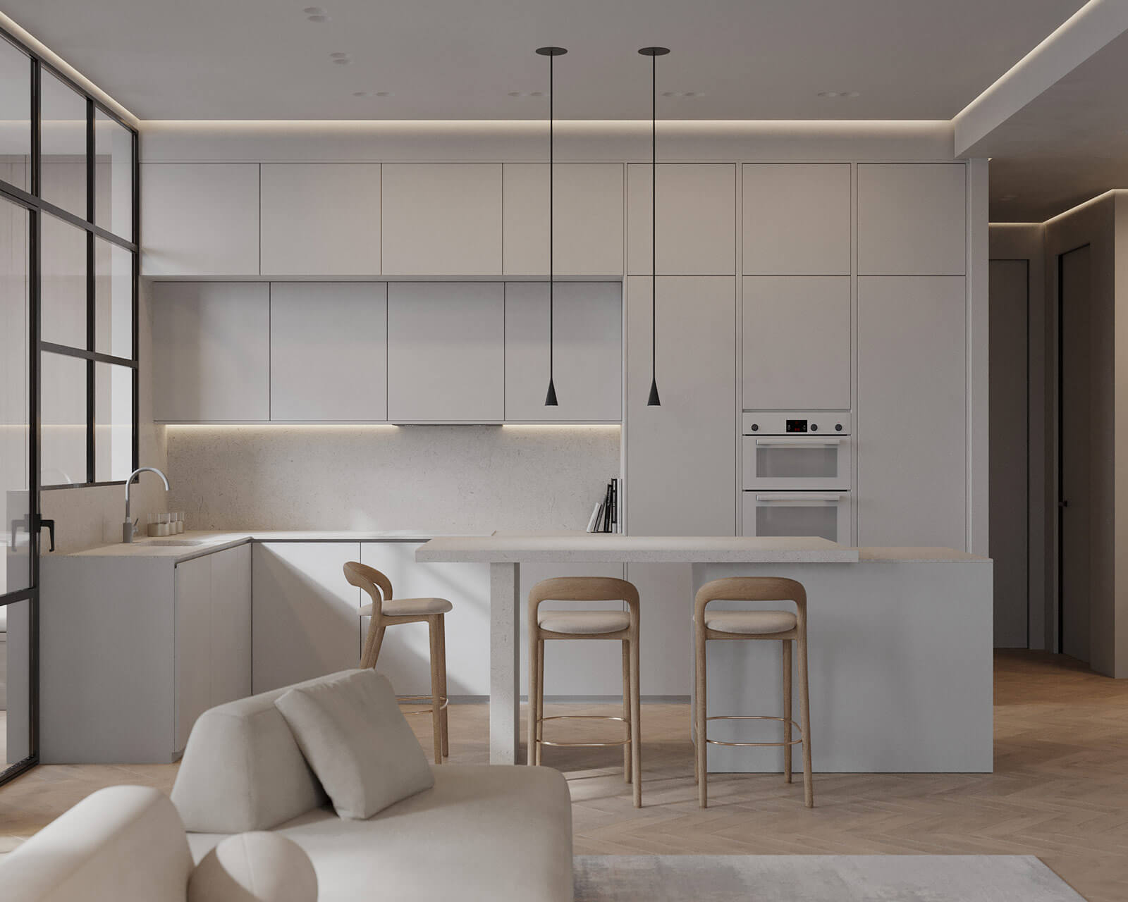 Для привлечения внимания к диванной и обеденной зоне, мы решили максимально скрыть зону кухни, окрасив ее в цвет стен. Фартук и столешница выполнены из известнякового камня в тон кухни.