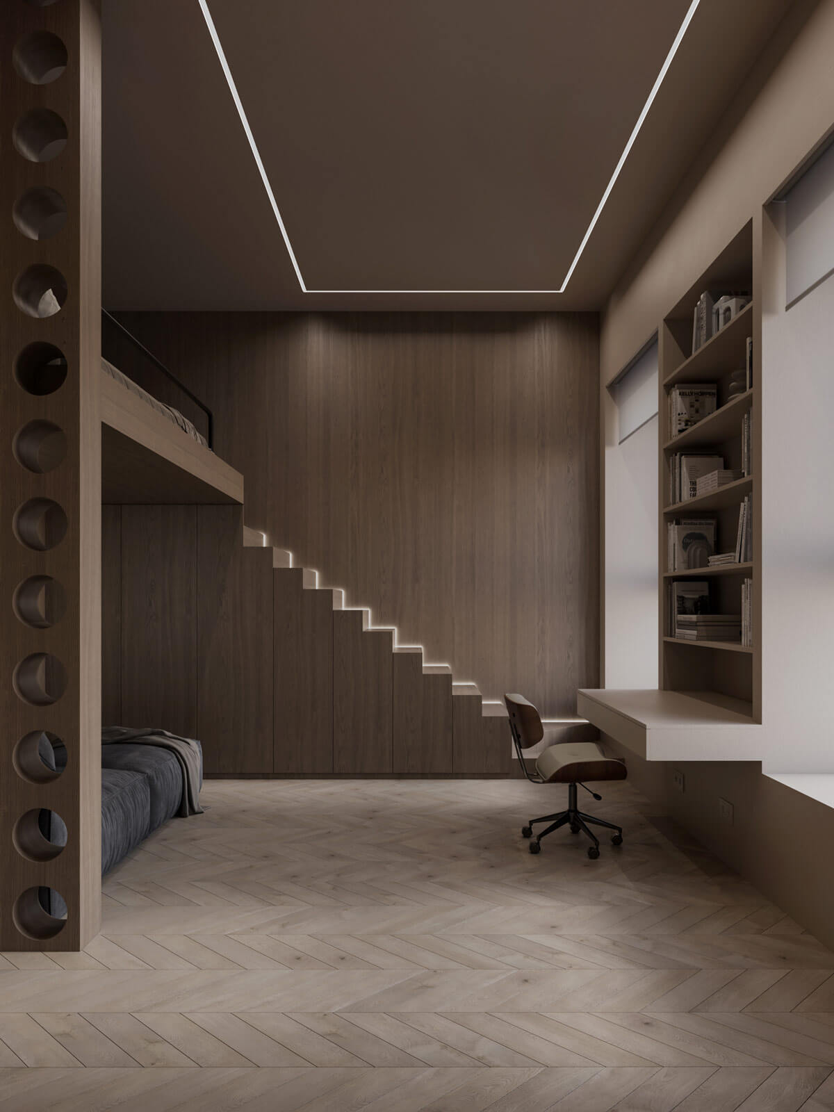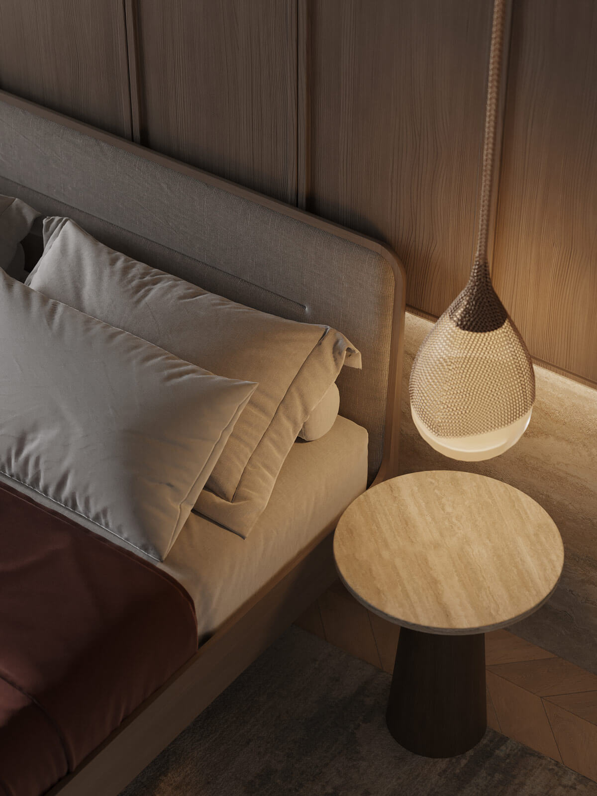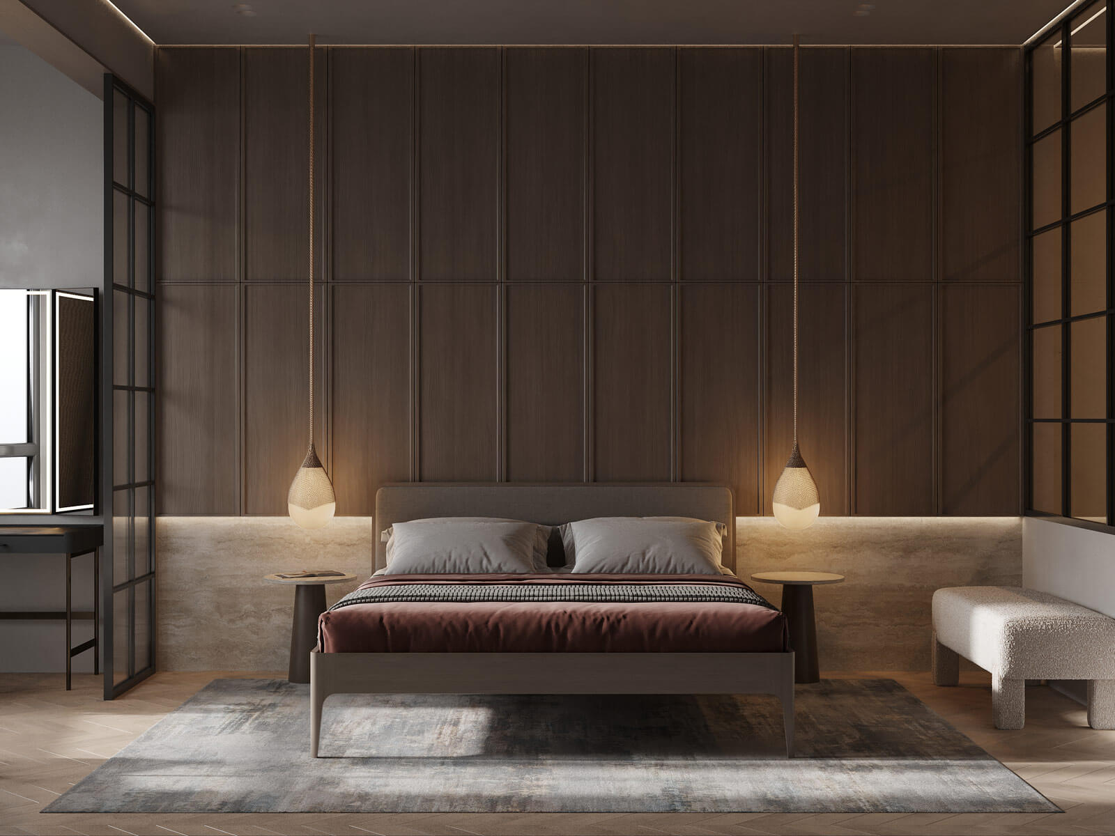 Дизайн Мастер спальни также во многом определила планировка помещения. В этом помещении сам заказчик предложил нам использовать стеклянную перегородку между Санузлом и Спальней. Мы продублировали ее в обрамлении лоджии и решили отойти от строгого минимализма и привнести в спальню уюта за счет деревянных панелей и травертина на стене за изголовьем.