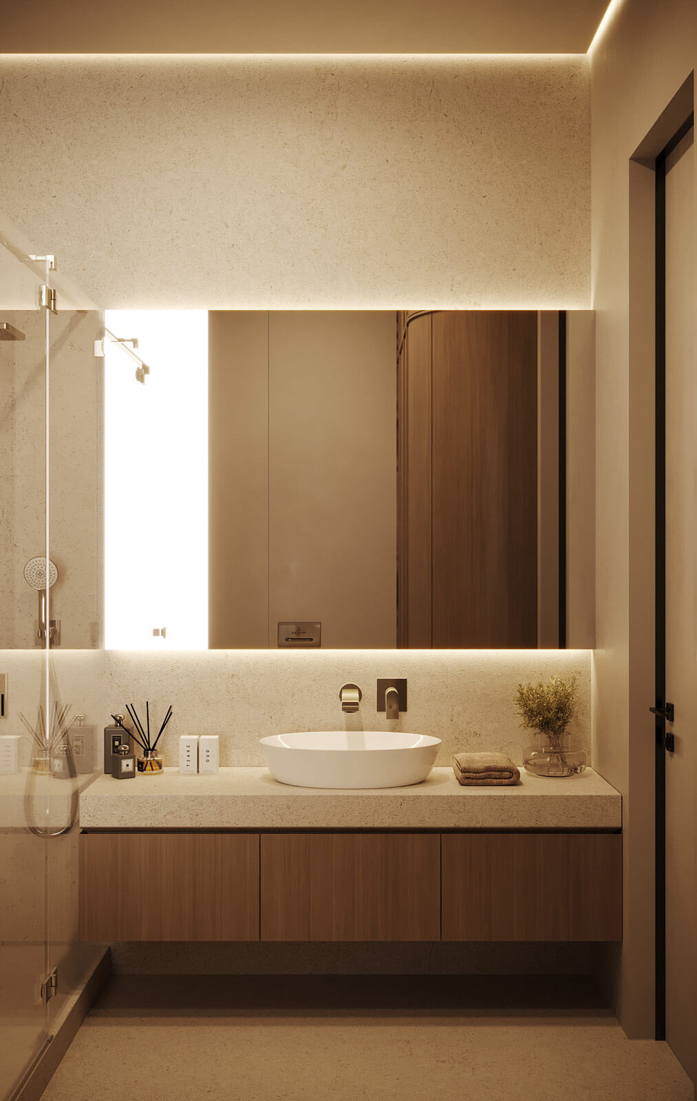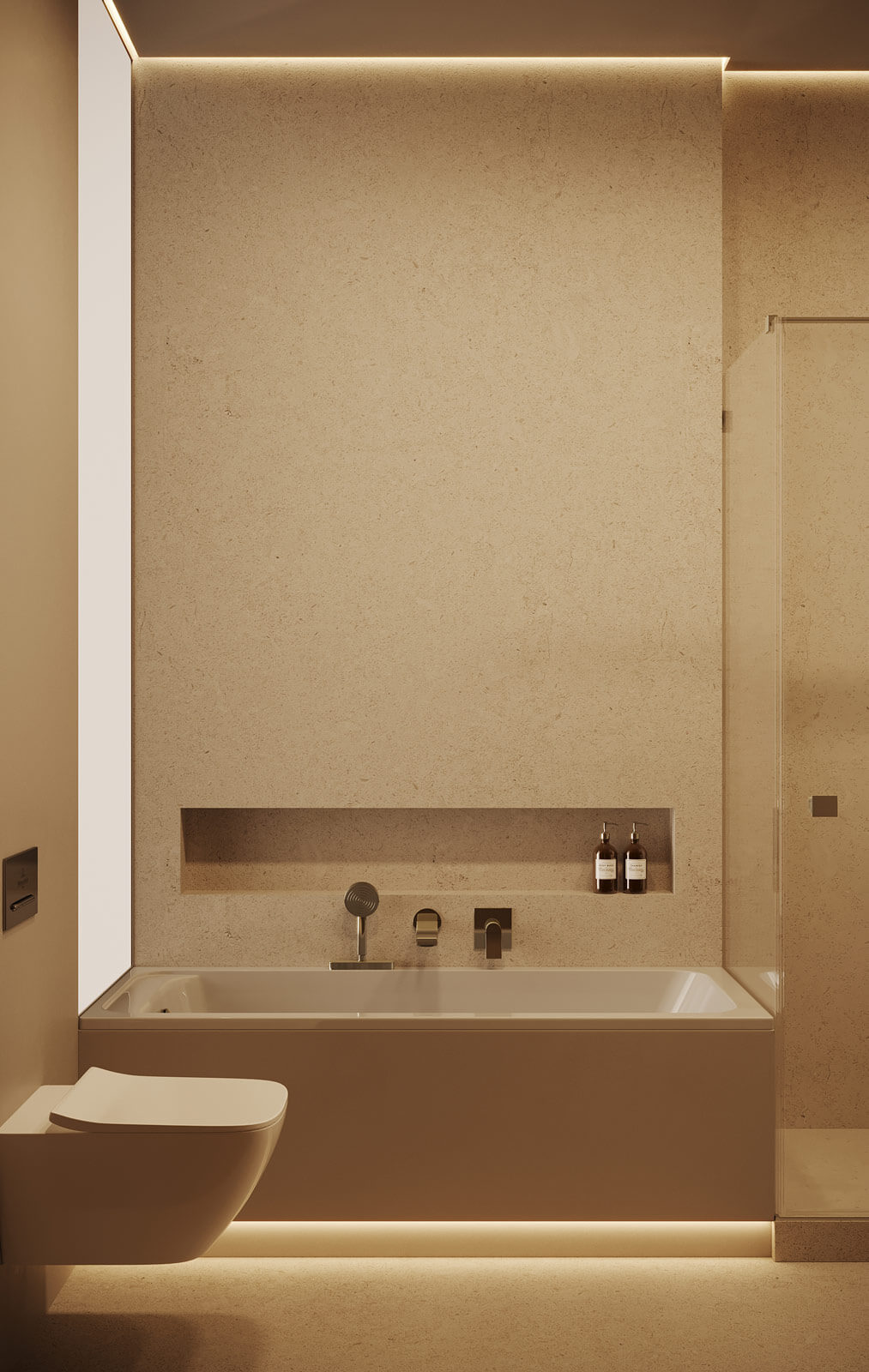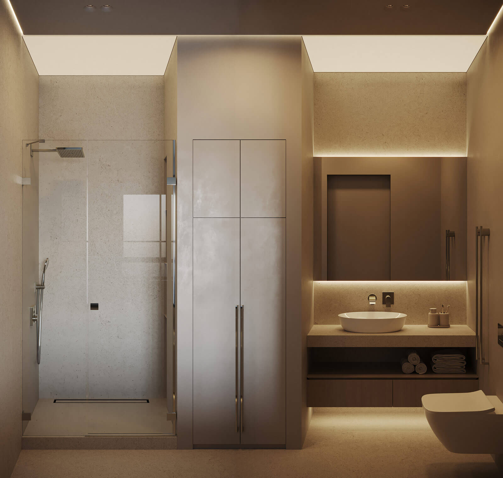 Оба санузла наоборот сделали технологичными, особое внимание уделив освещению пространства. Над тумбой с раковиной и в душе мы сделали лайтбокс с мягким, рассеянным светом 3000К. Ванны Villeroy & Boch и сантехника Hansgrohe была куплена заказчиком до начала проекта.