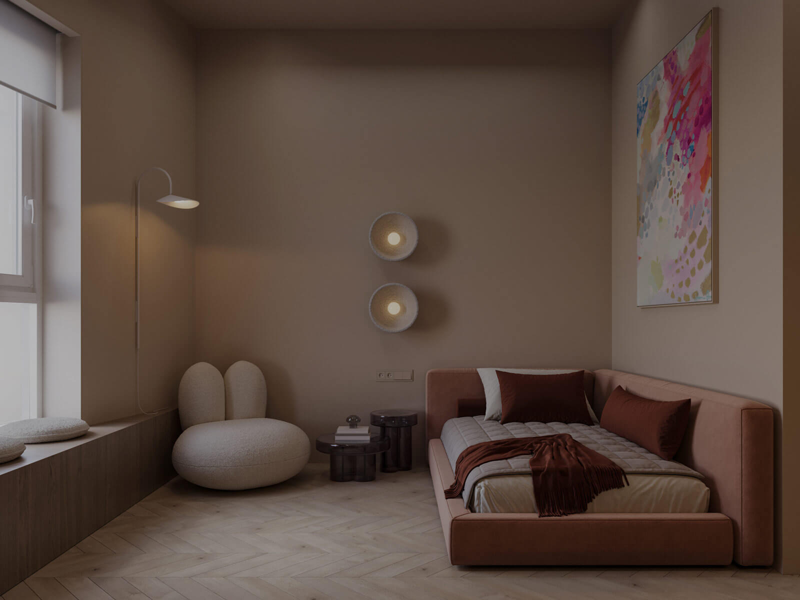 Учитывая длительную реализацию проекта, детские комнаты сделаны “на вырост”. Но мы не смогли отказаться от некоторых детских мотивов таких как кресло “Bunny” нашего российского дизайнера Романа Плайса.