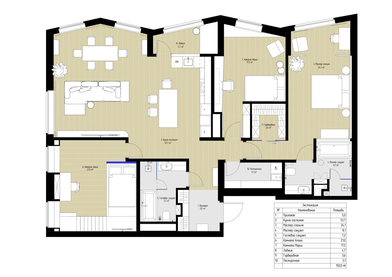 Мы начали работу над дизайн-проектом с планирования пространства. Требовалось разместить кухню-гостиную-столовую, 3 спальни и 2 санузла с ванной и душем. Сложность заключалась еще в том, что заказчик уже приобрел какие-то мебельные позиции и нам нужно было создать дизайн, учитывая его покупки. Так в проекте сразу определилась вся сантехника, подвесные светильники над обеденным столом и кровать в Спальне.