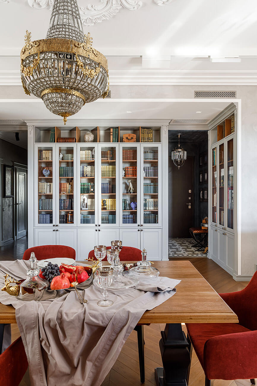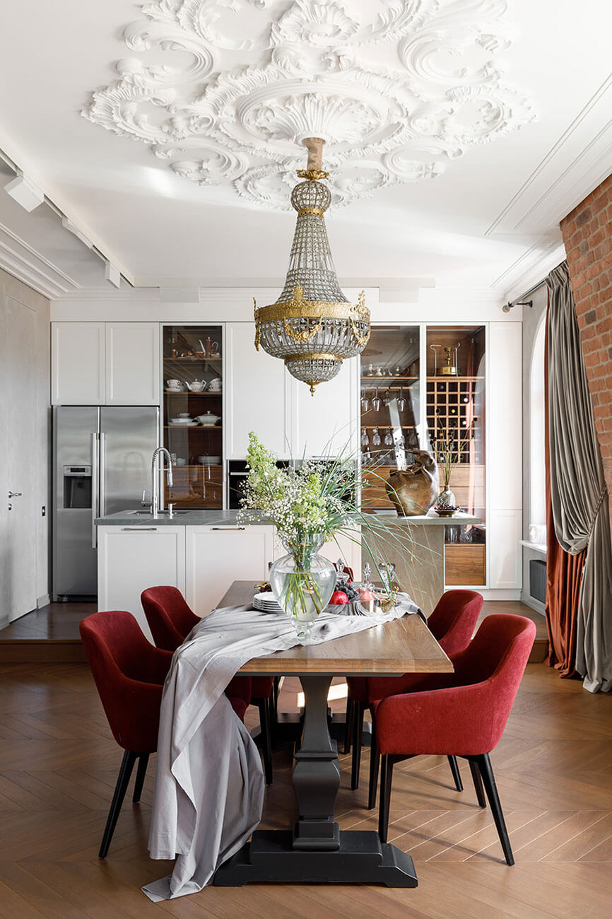 Несмотря на классические художественные акценты кухонный гарнитур, столовая группа, диван и кровать современные и довольно лаконичные.