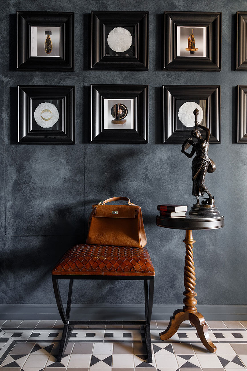 Особую роль в моей жизни всегда занимала живопись. Центральная картина-ширма — репродукция картины Пабло Пикассо «Любительница абсента» — выполнена мной совместно с архитектором Е. Шируновой, она не только является ярким акцентом гостиной комнаты, но и закрывает телевизор. В коридоре создана целая галерея работ различных художников: например небольшая картина П. Коростелева, подаренная мне автором, несколько картин Г. Исаева, преподавателя Санкт-Петербургской академии художеств, графика чудесного художника О. Михайлова и работы по шелку неизвестного автора. Уголок с фортепьяно украшает акварельная работа Александра Воцмуша, картина его же авторства висит над изголовьем кровати в спальне.