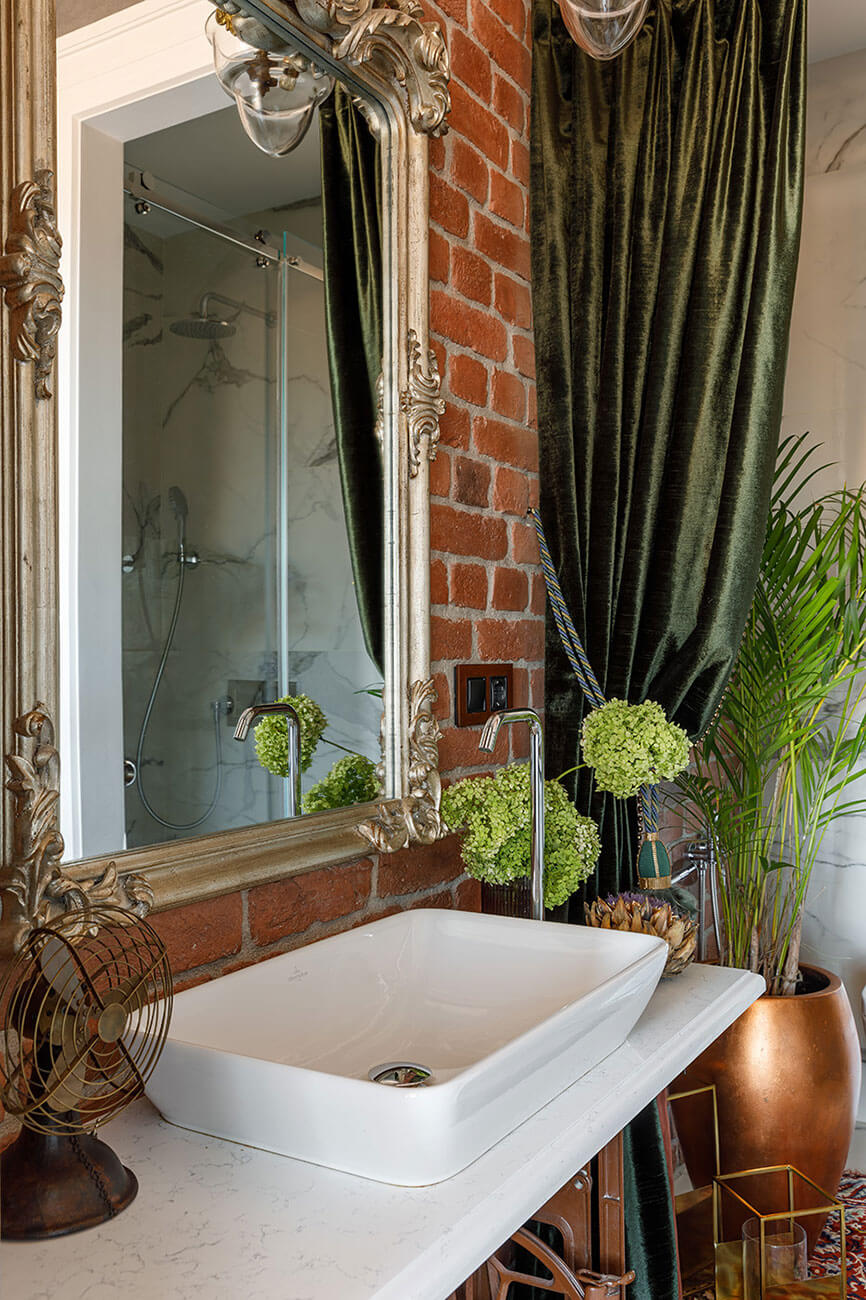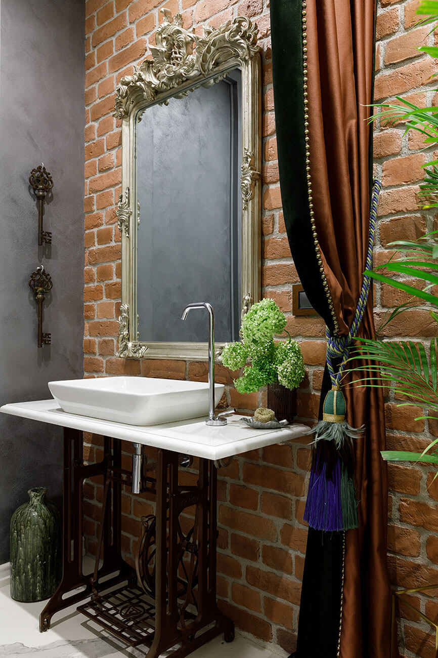 Композиционным центром гостиной стала библиотека прабабушки, включающая в себя классическую русскую литературу, статуэтки гоголевских героев и аккуратный медальон с портретом А.С. Пушкина, отреставрированная тумбочка украсила гостиную, а чугунное изножье швейной машинки стало основой для мебели в санузле.