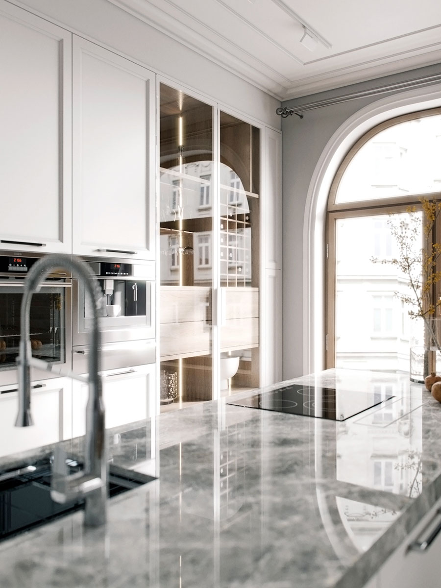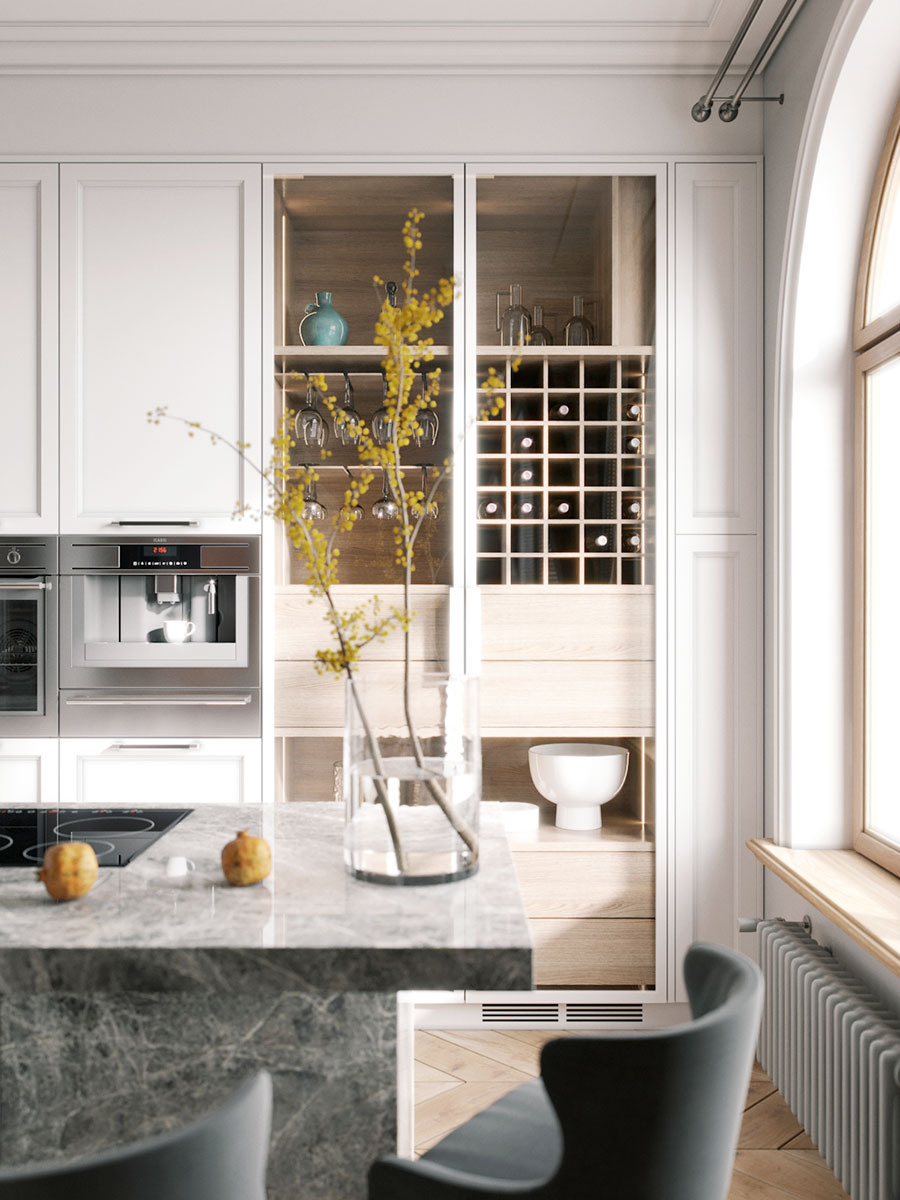 Зона кухни более современная, светлая и лаконичная. Высокие шкафы вдоль стены являются зоной хранения и расположения кухонной техники: холодильника, кофе-машины и духового шкафа. Стеклянные витрины сделаны не случайно, за ними будут храниться два антикварных сервиза, доставшихся хозяйке по наследству. Мойка и варочная поверхность расположены на острове.
