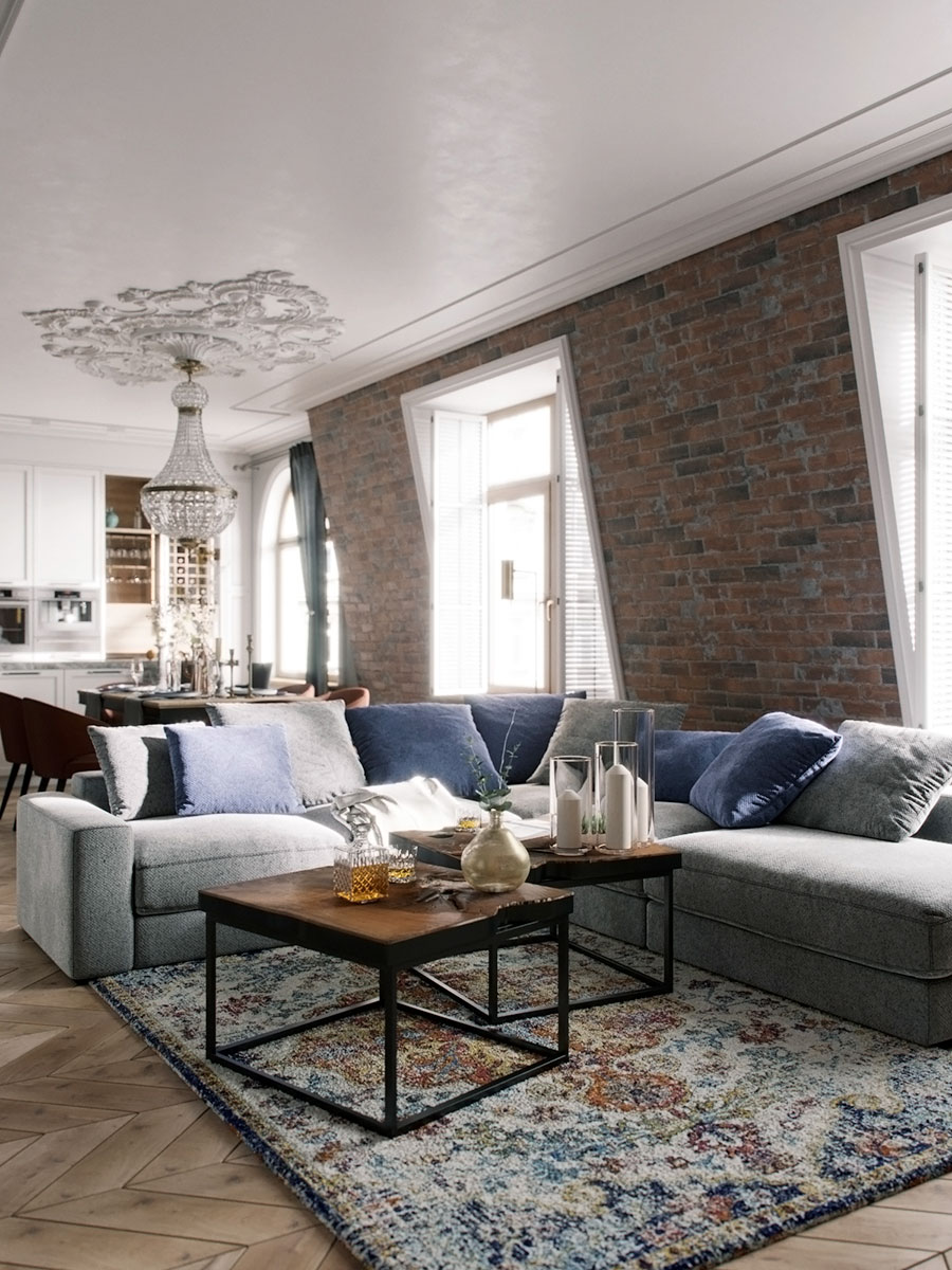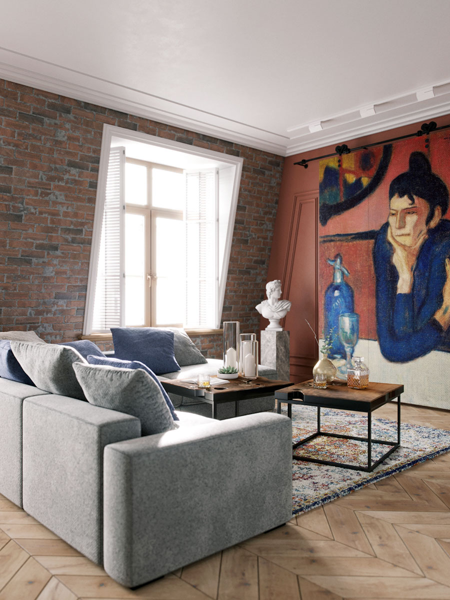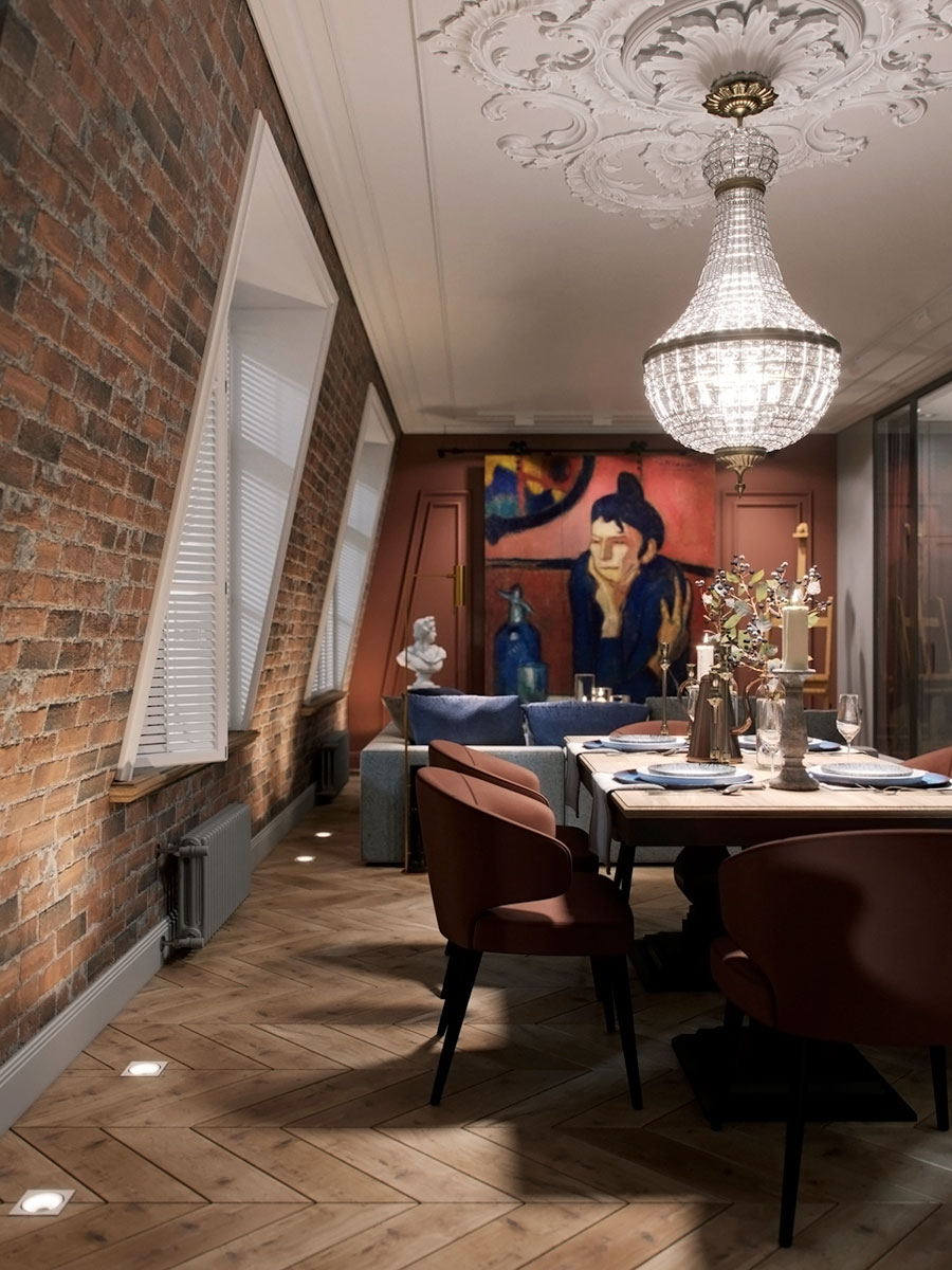 Каждая из зон имеет свои художественные акценты. Например, ширма, скрывающая телевизор, оформлена репродукцией картины Пабла Пикассо «Любительница абсента», обеденную зону украшает антикварная люстра начала 20 века и обрамляющая ее гипсовая розетка на потолке.
