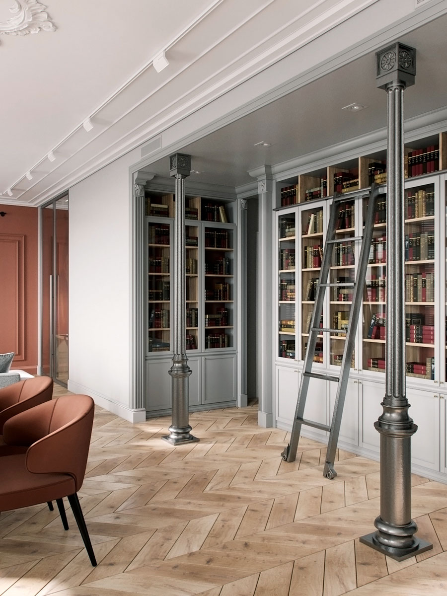 Библиотека — в проходной части гостиной, вход в нее оформлен чугунными колоннами.